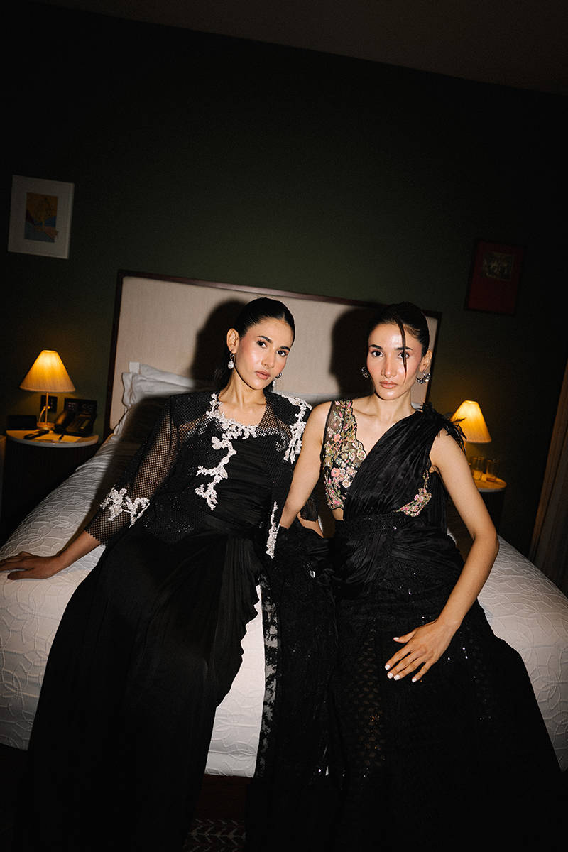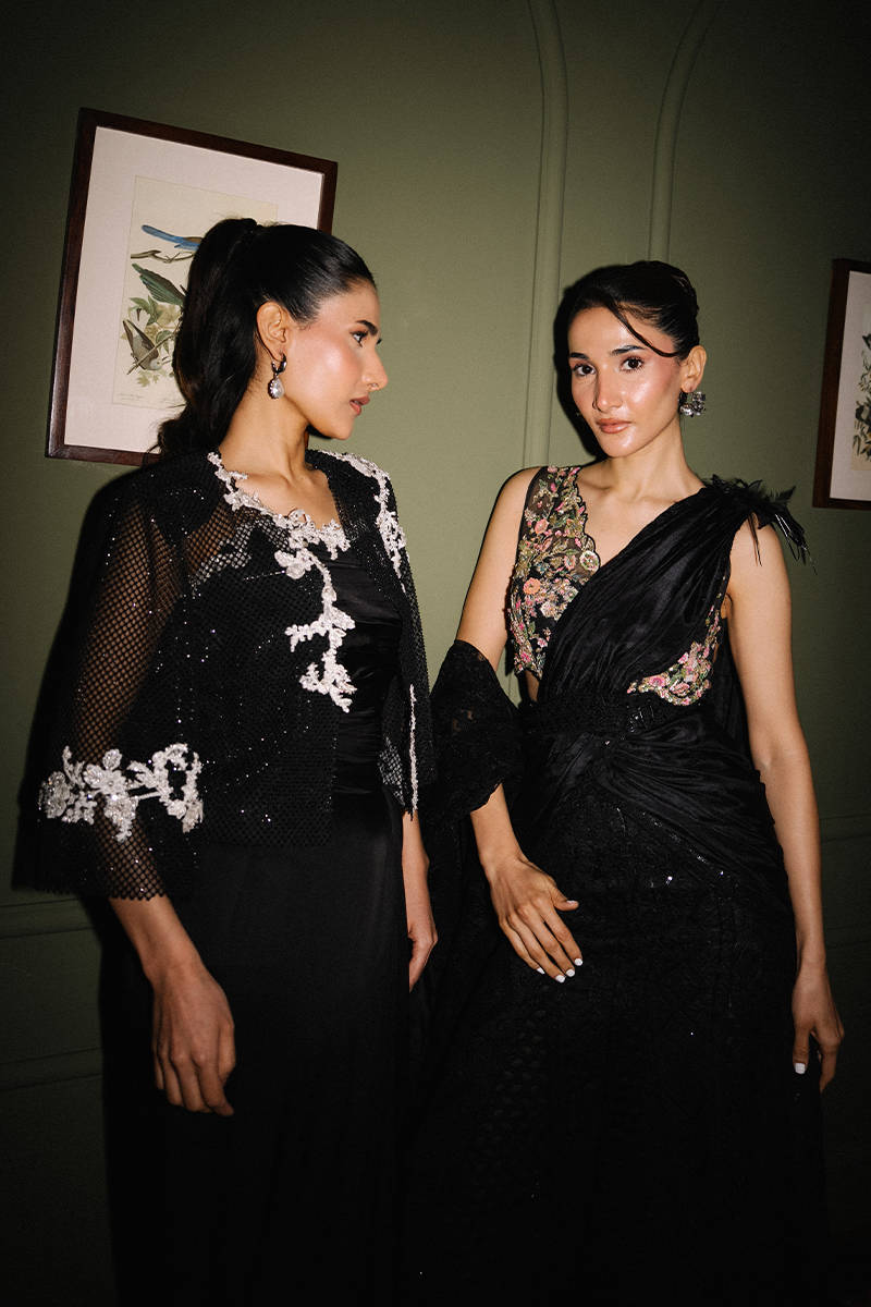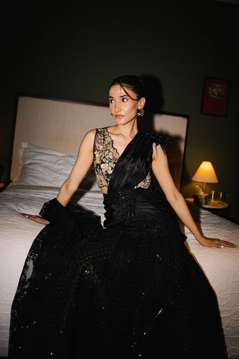 The garment features an embroidered bodice, draped black fabric with feathery accents, and a textured full skirt, blending traditional with modern flair.Shirt Type: BlouseModel Height:5'8