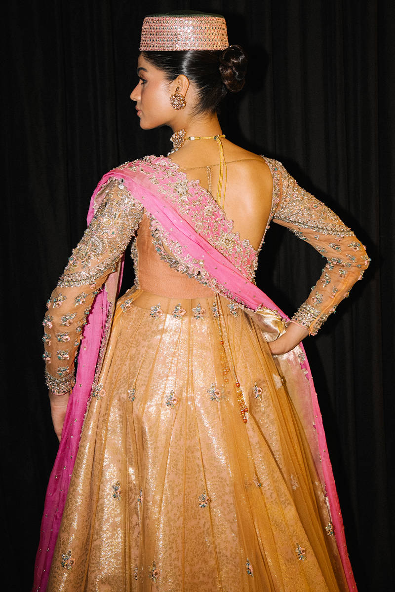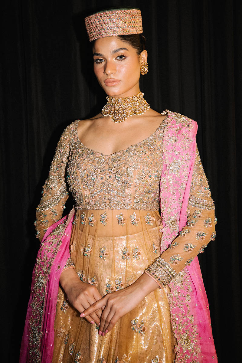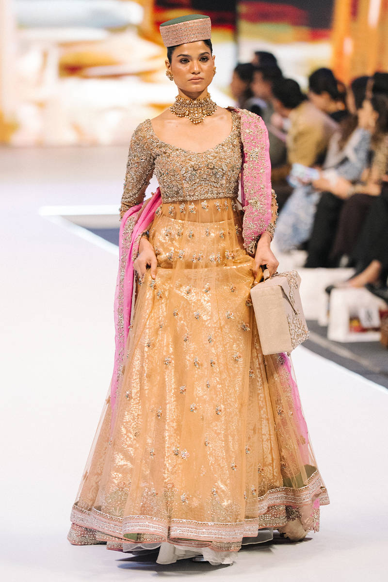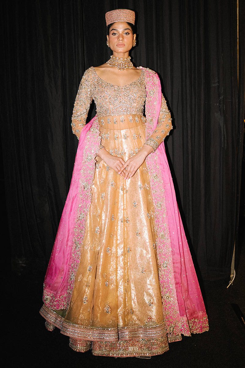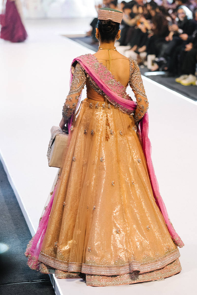 A glamorous mustard-gold lehenga with delicate floral embellishments and a heavily embroidered fitted blouse. Paired with a bright pink dupatta, statement choker, and a structured cap for a bold traditional-meets-modern runway look.