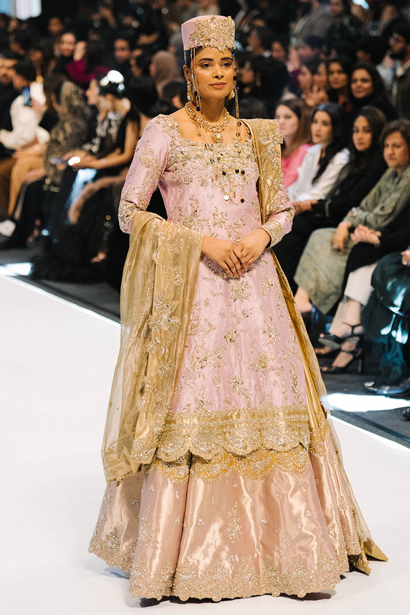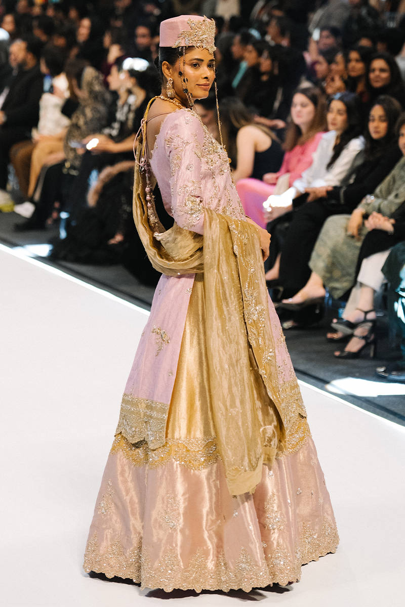 A pastel pink traditional outfit featuring a long-embroidered shirt with intricate gold detailing, paired with a matching flared lehenga. The look is completed with a gold dupatta, traditional jewelry, and an embellished cap, creating an elegant and regal appearance.