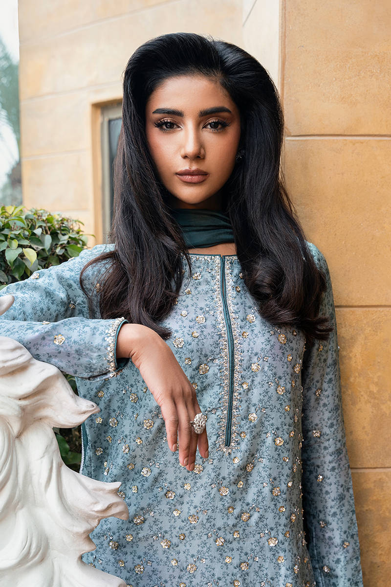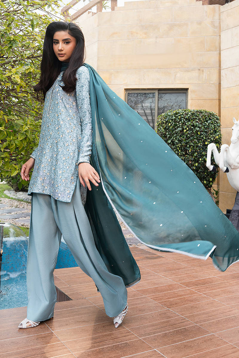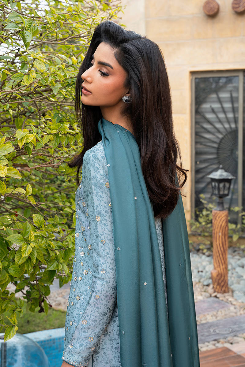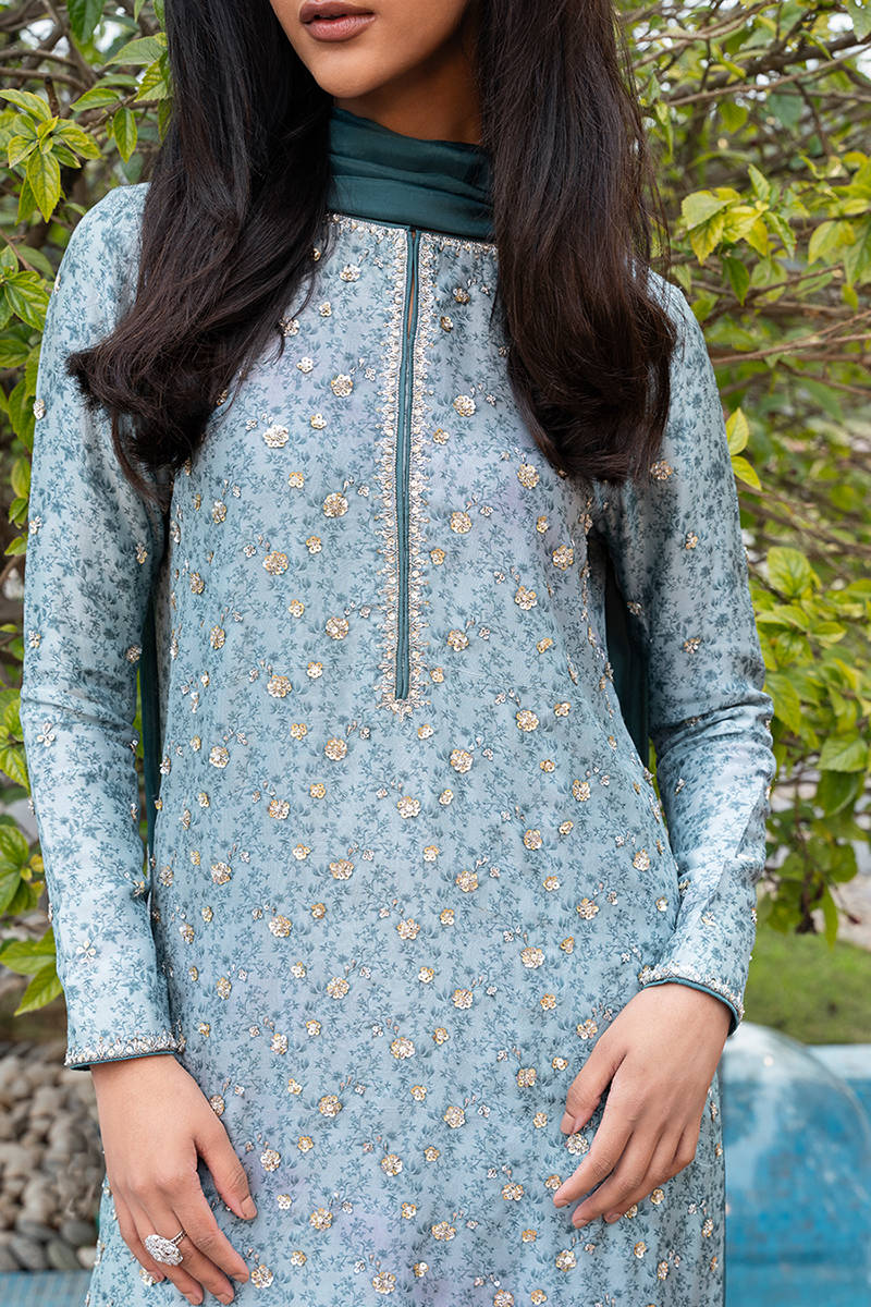 Digitally printed short shirt crafted from PURE raw silk, adorned with a delicate all-over print. The shirt is further enhanced with subtle hand embellishments. It is paired with farshi shalwar in PK raw silk, designed to complement the look with its structured silhouette. Completing the ensemble is a flowing KP SILK dupatta, draped effortlessly to add lightness and movement, beautifully balancing the richness of the silk textures.