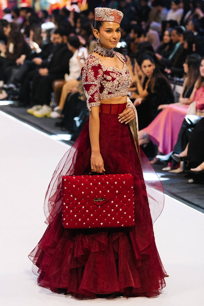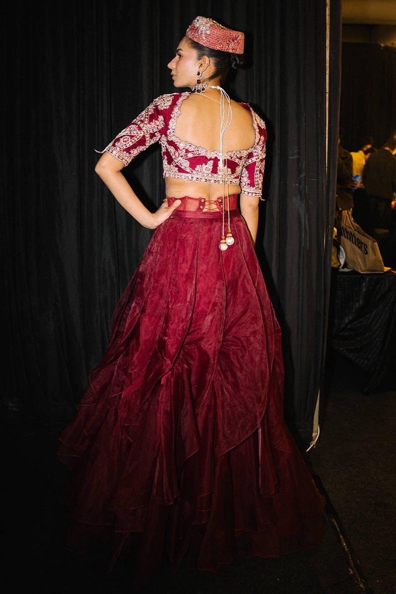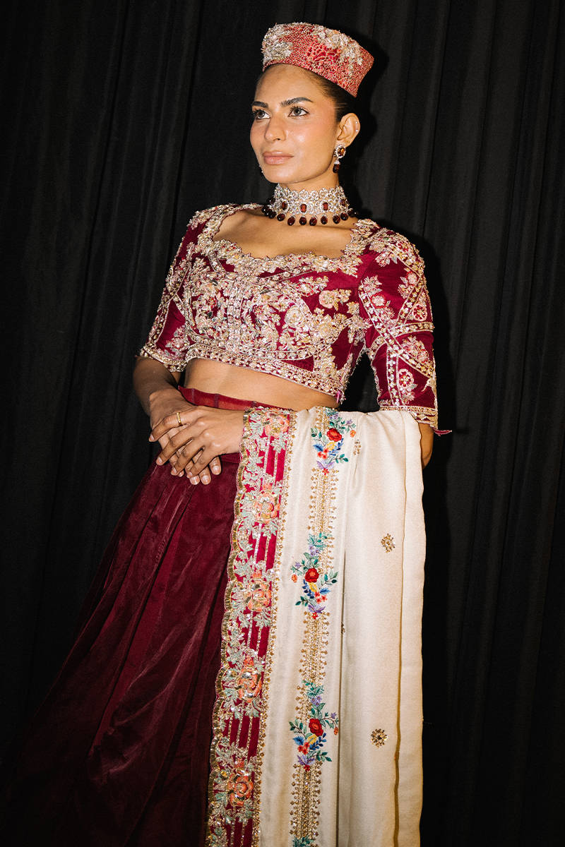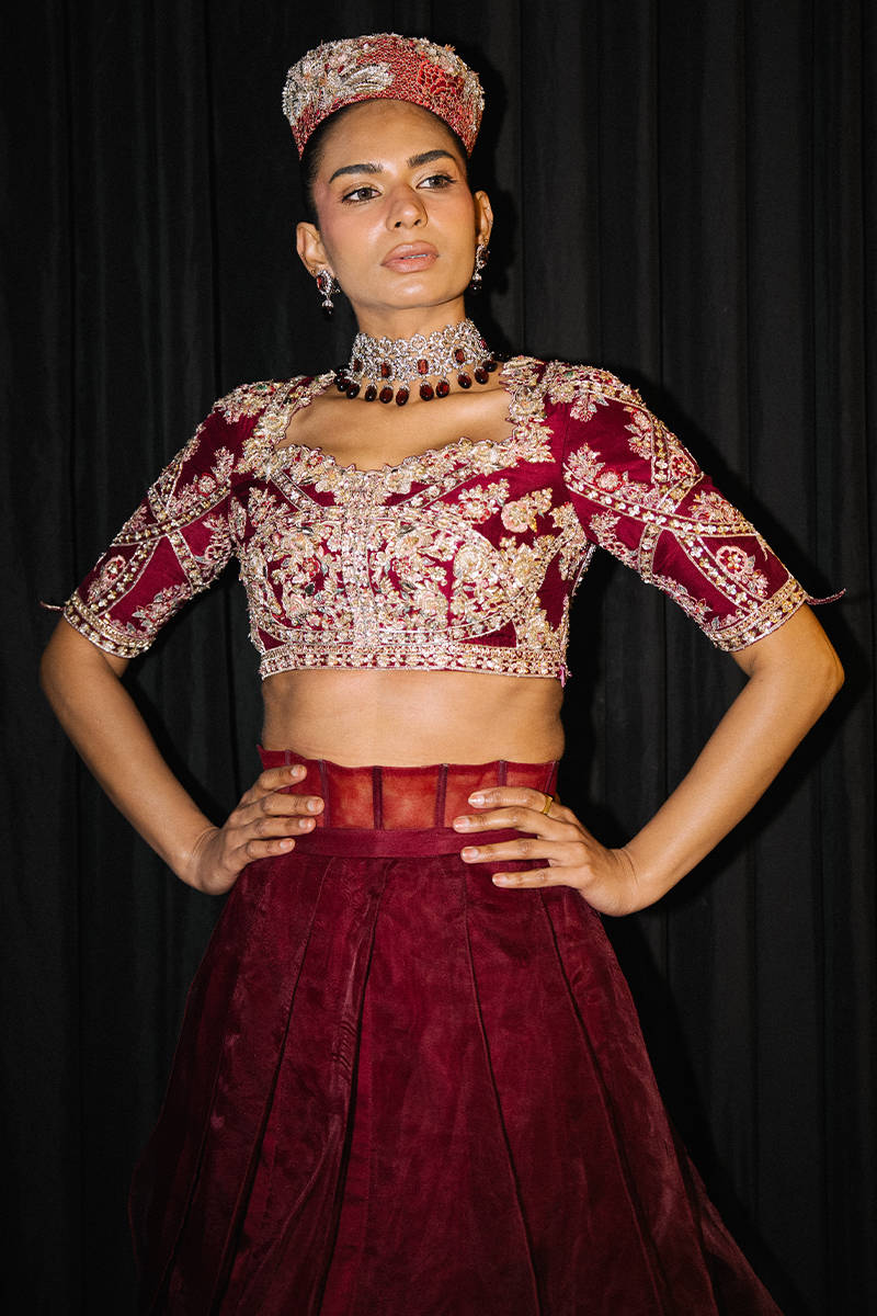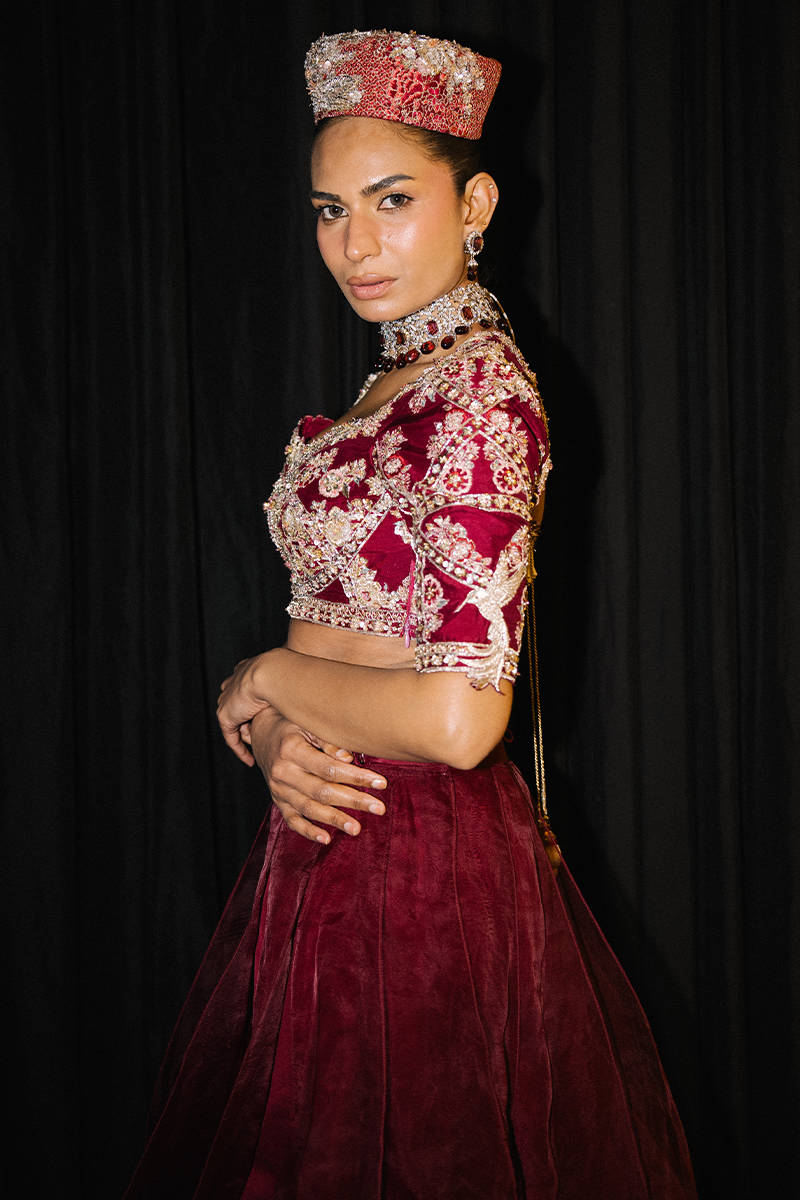 A striking deep maroon lehenga featuring a heavily embellished cropped blouse with silver embroidery. Finished with a dramatic layered tulle skirt, a printed dupatta, statement choker, and a matching potli bag for a luxe bridal vibe.