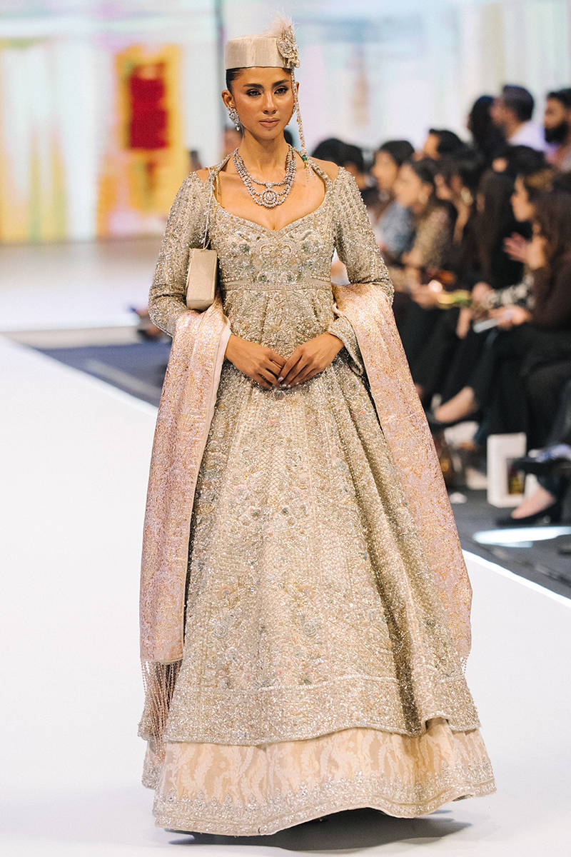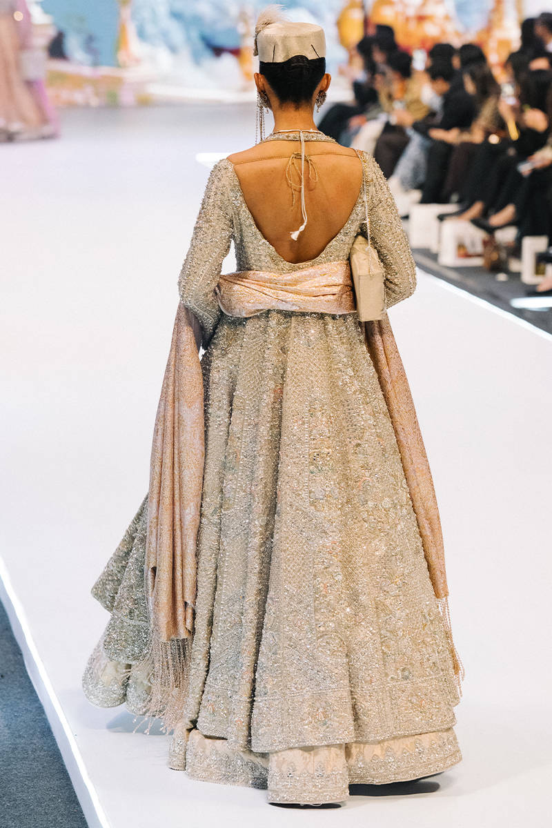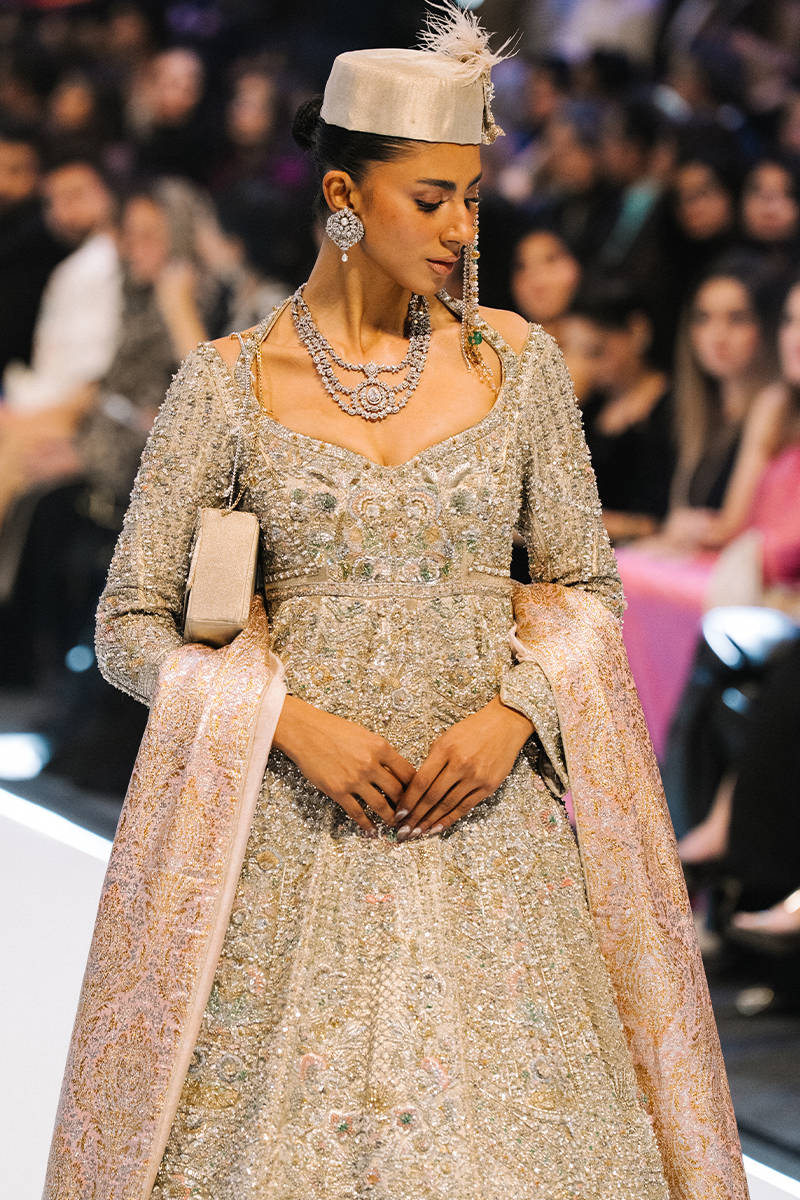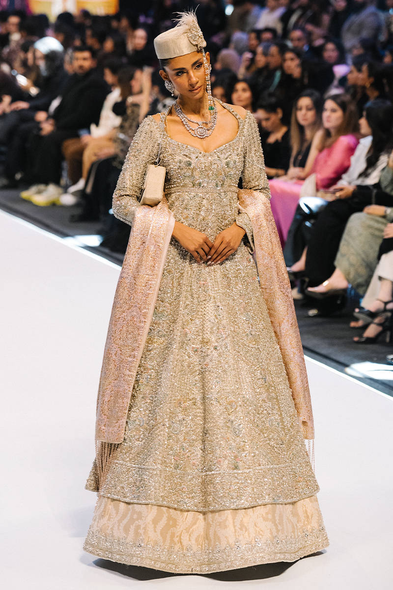 A regal champagne-gold embellished gown featuring intricate silver embroidery and a flared, layered hem. Styled with a soft blush dupatta, statement jewelry, and a structured cap for an elegant runway-ready look.
