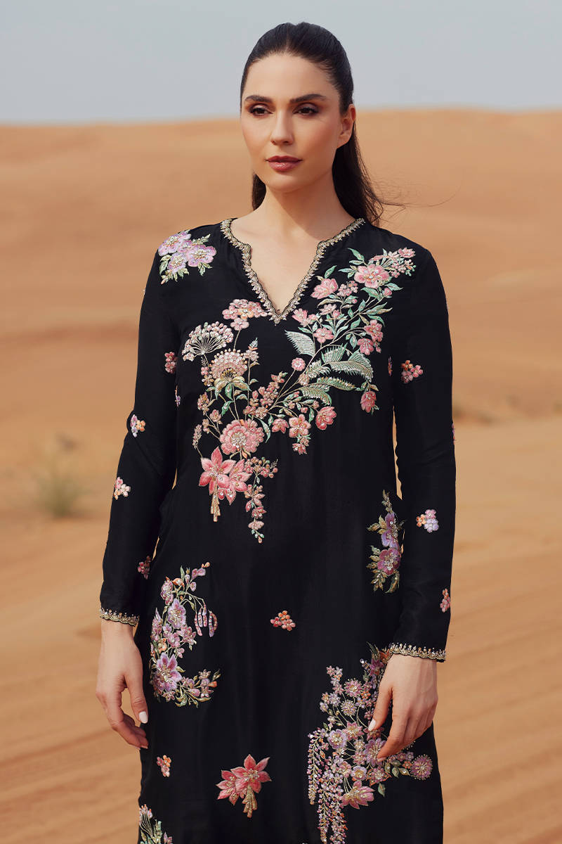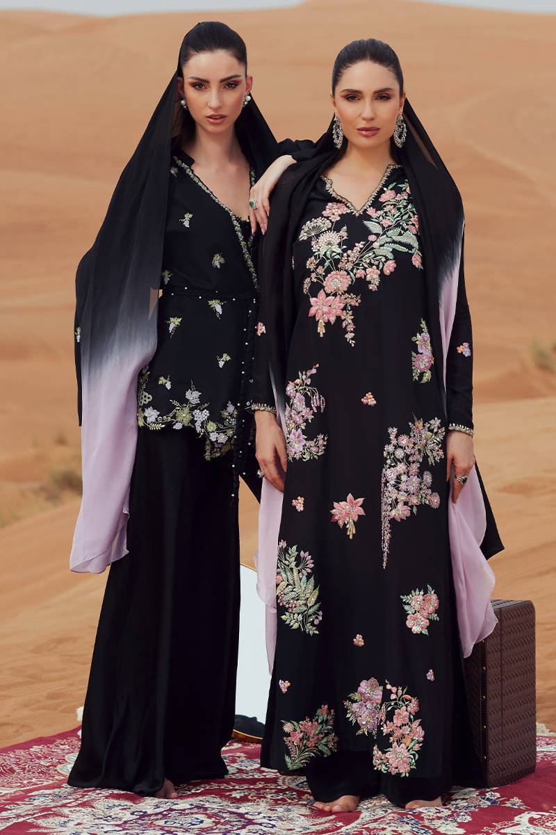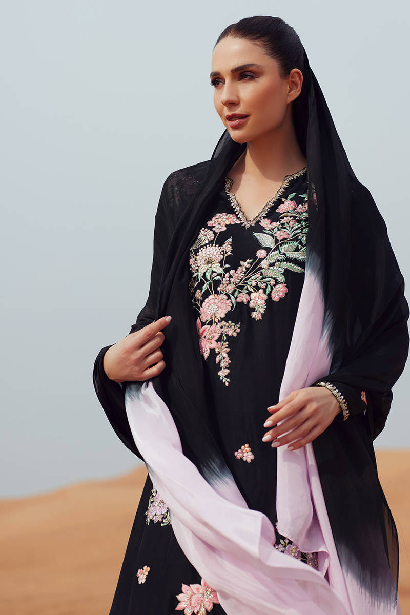 A full-length straight shirt crafted in pure raw silk, richly embroidered and intricately embellished throughout for a statement finish. Paired with a sleek straight-cut trouser in Korean raw silk, creating a refined and elongated silhouette. Completed with a black ombre dupatta accented with soft pink accents for a striking contrast.