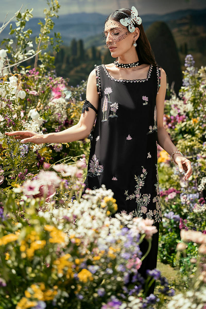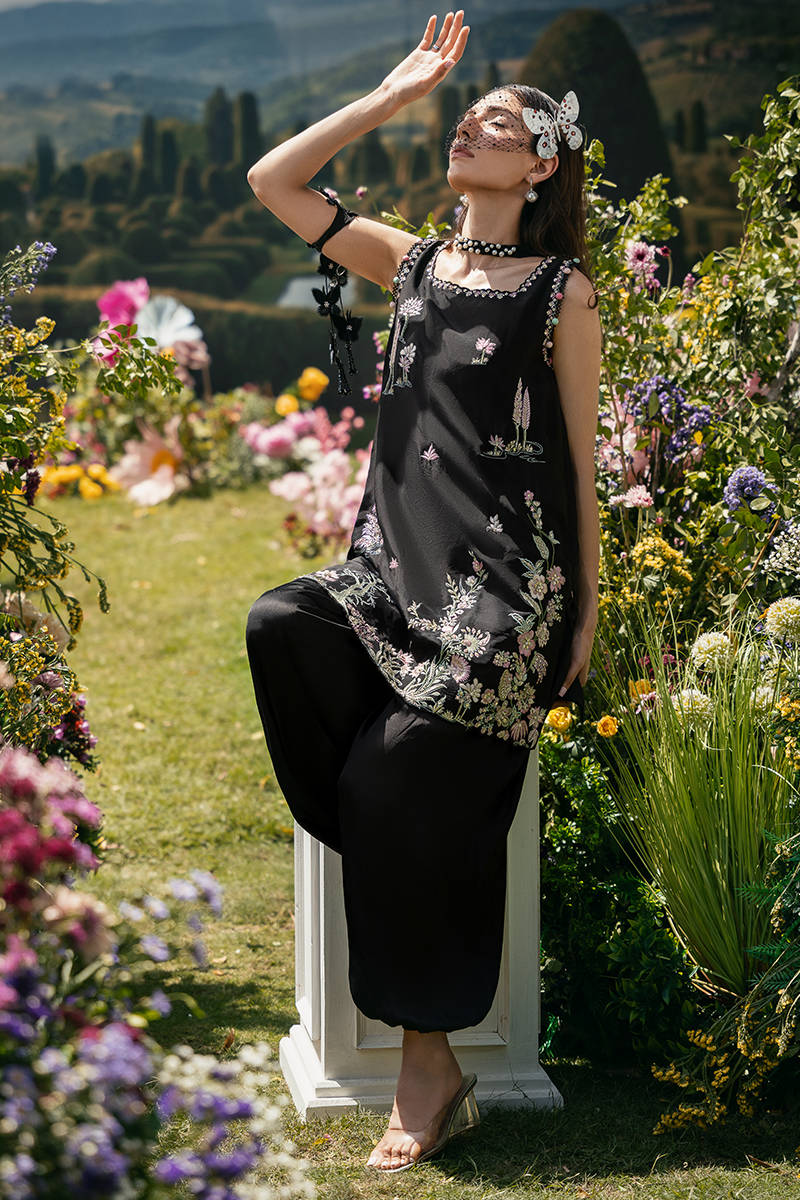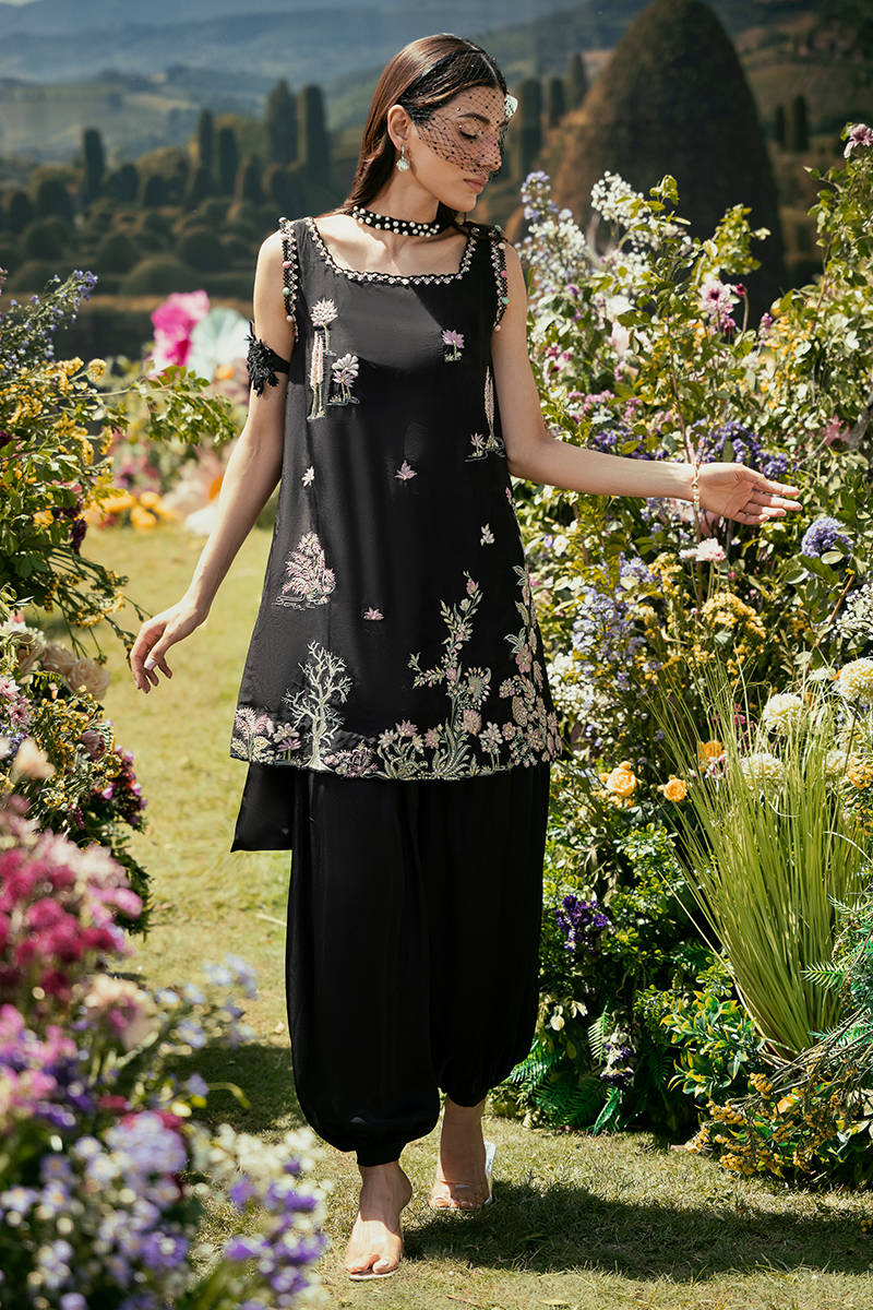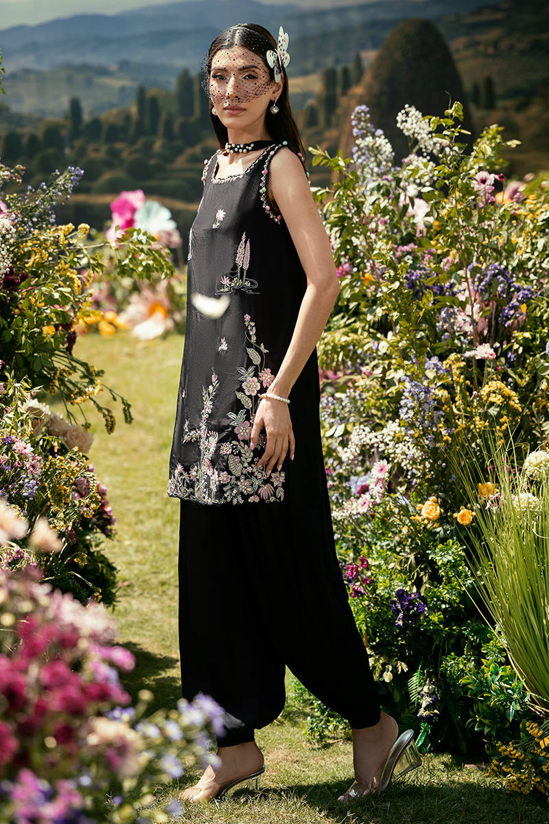 A striking black ensemble featuring a short sleeveless shirt, elevated with delicate pearl detailing tracing the neckline and sleeve hems. Intricate embroidery embellishments add depth and texture, giving the piece a refined handcrafted allure. It is paired with a Scandinavian-style scarf, subtly adorned with pearls that echo the shirt’s detailing, creating a cohesive and elegant rhythm. The look is completed with voluminous balloon pants, adding structure and modern ease to the silhouette.