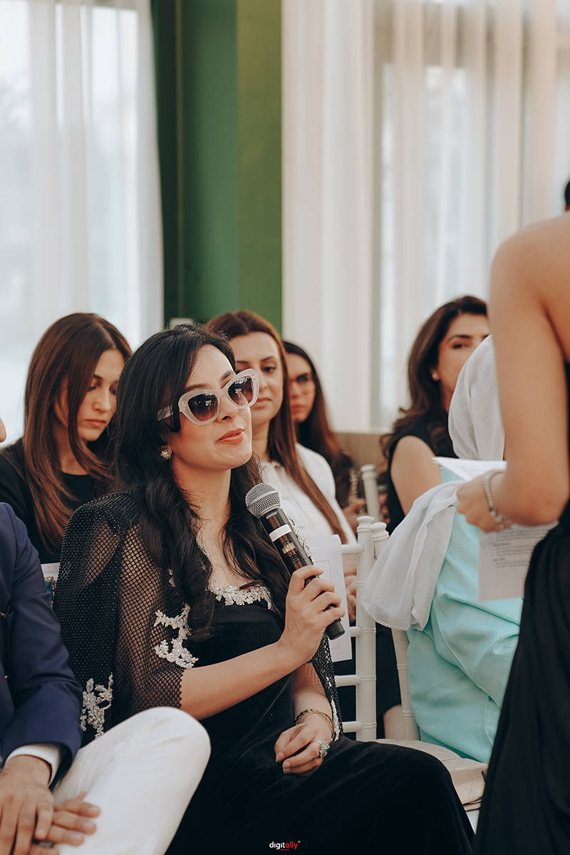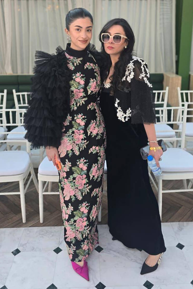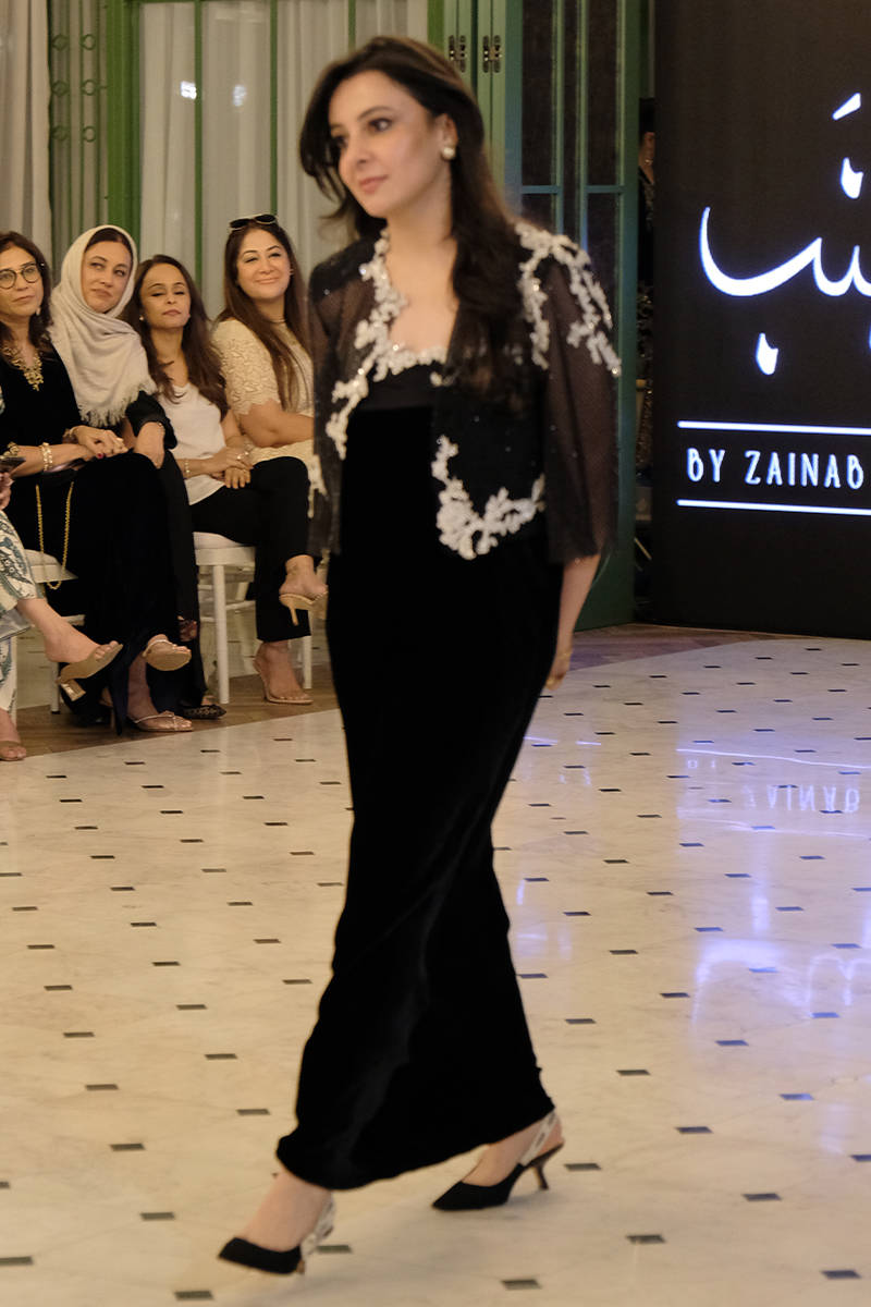 The resplendent black ensemble commands attention with a meticulously hand-encrusted cropped jacket, shimmering with bugle beads and radiant Swarovski crystals. Its artful composition weaves together white and black 3D motifs, each delicately hand-patched to create a sculptural, couture narrative in every placement.