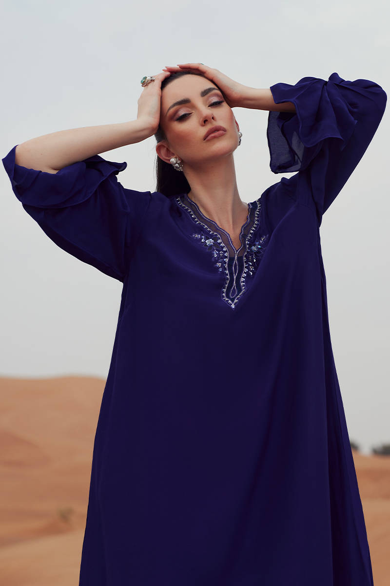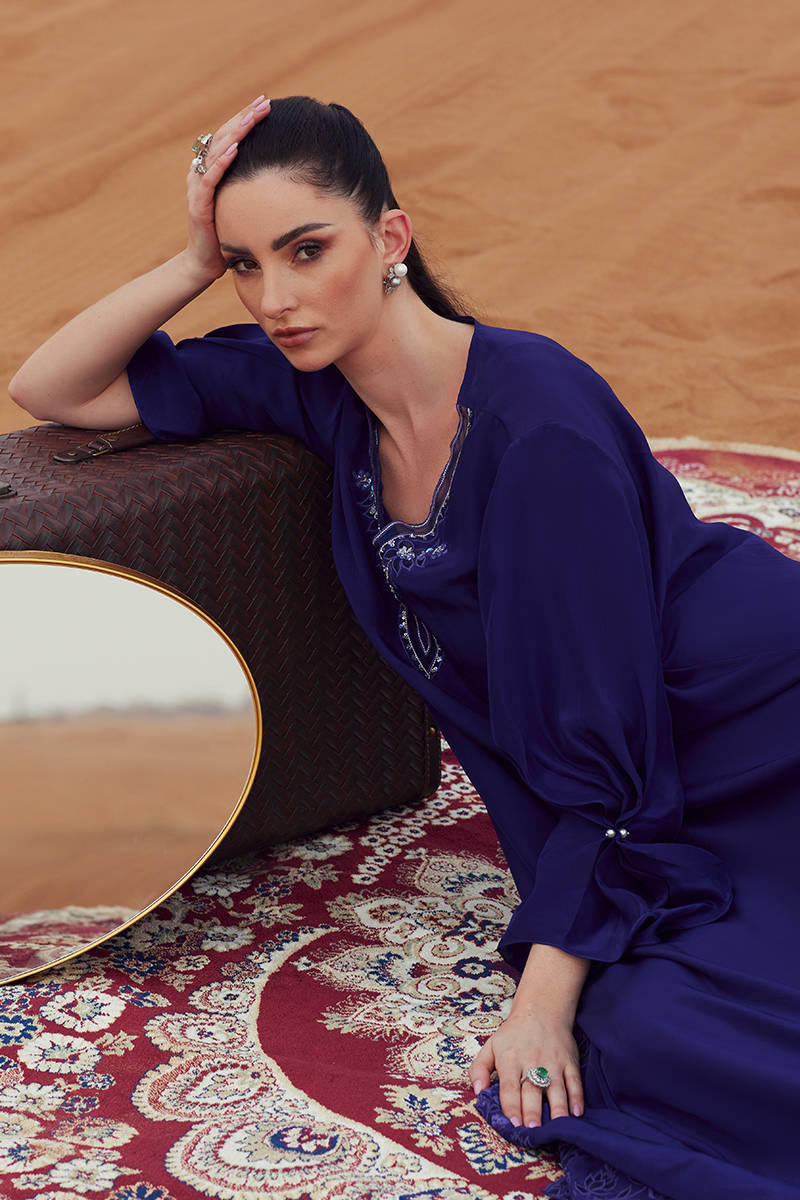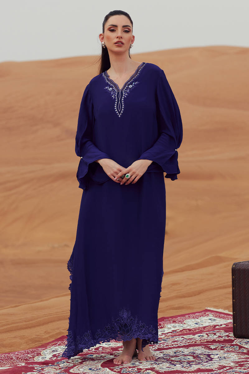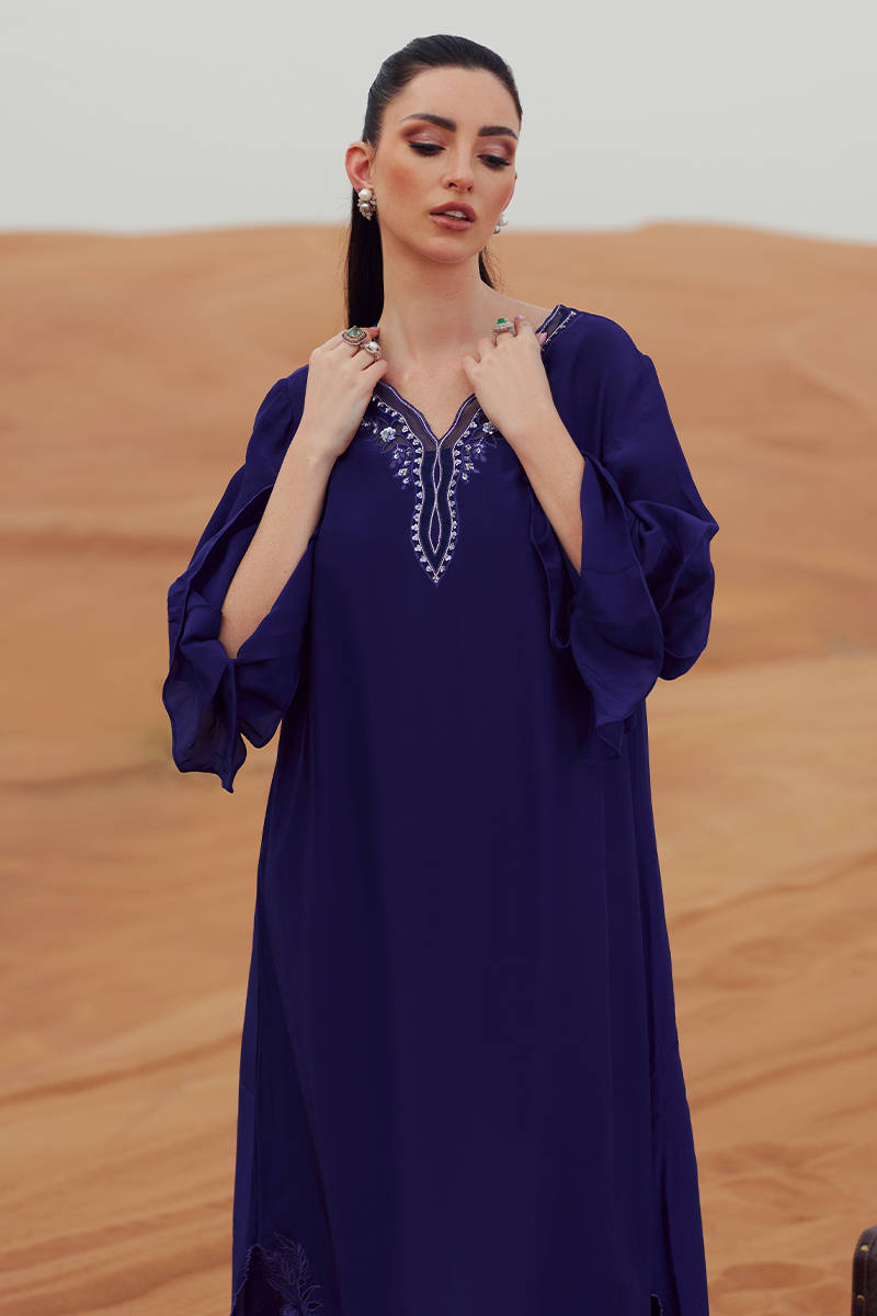 A kaftan-style shirt in Korean silk, detailed with intricate embroidery and subtle embellishments on the neckline and daman. Pleated sleeve accents add structure and sophistication. Styled with tailored Korean silk cigarette pants and finished with a lightweight KP silk scarf for a polished, contemporary look.
