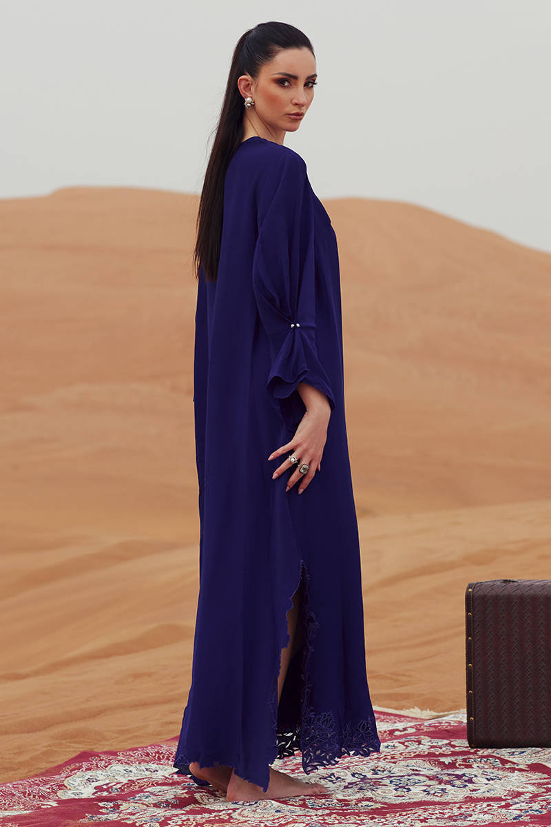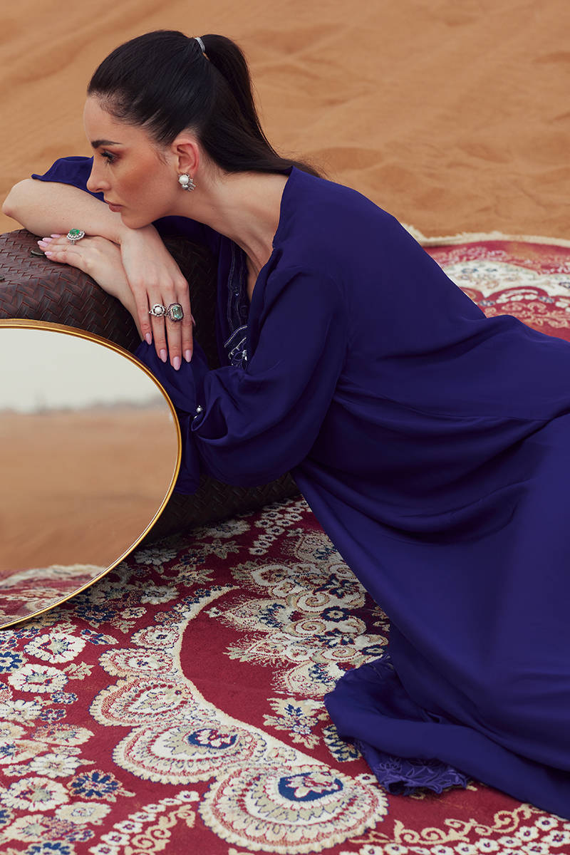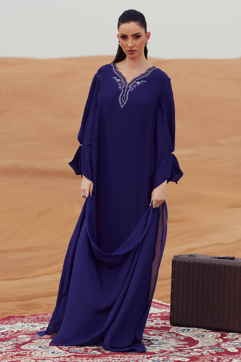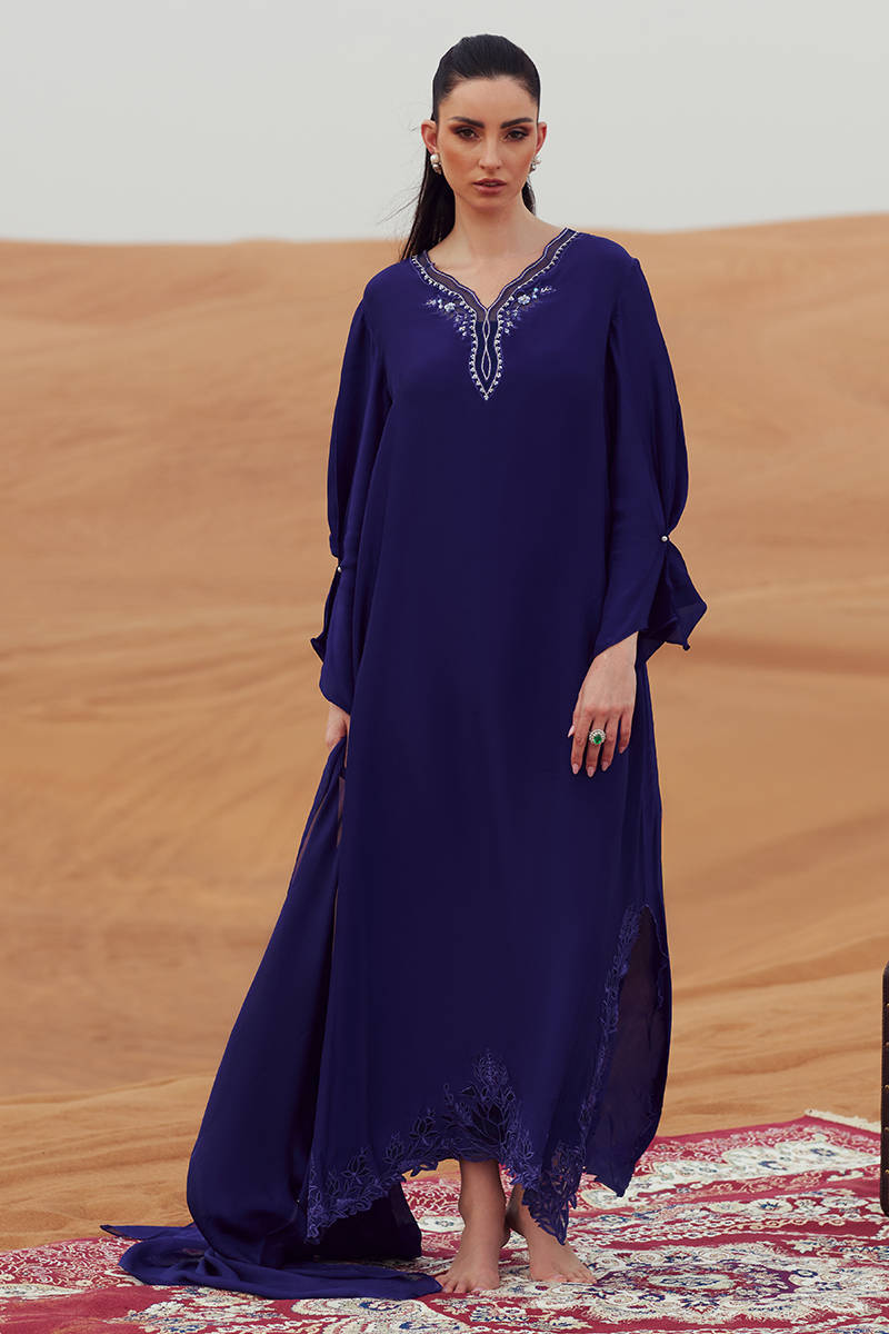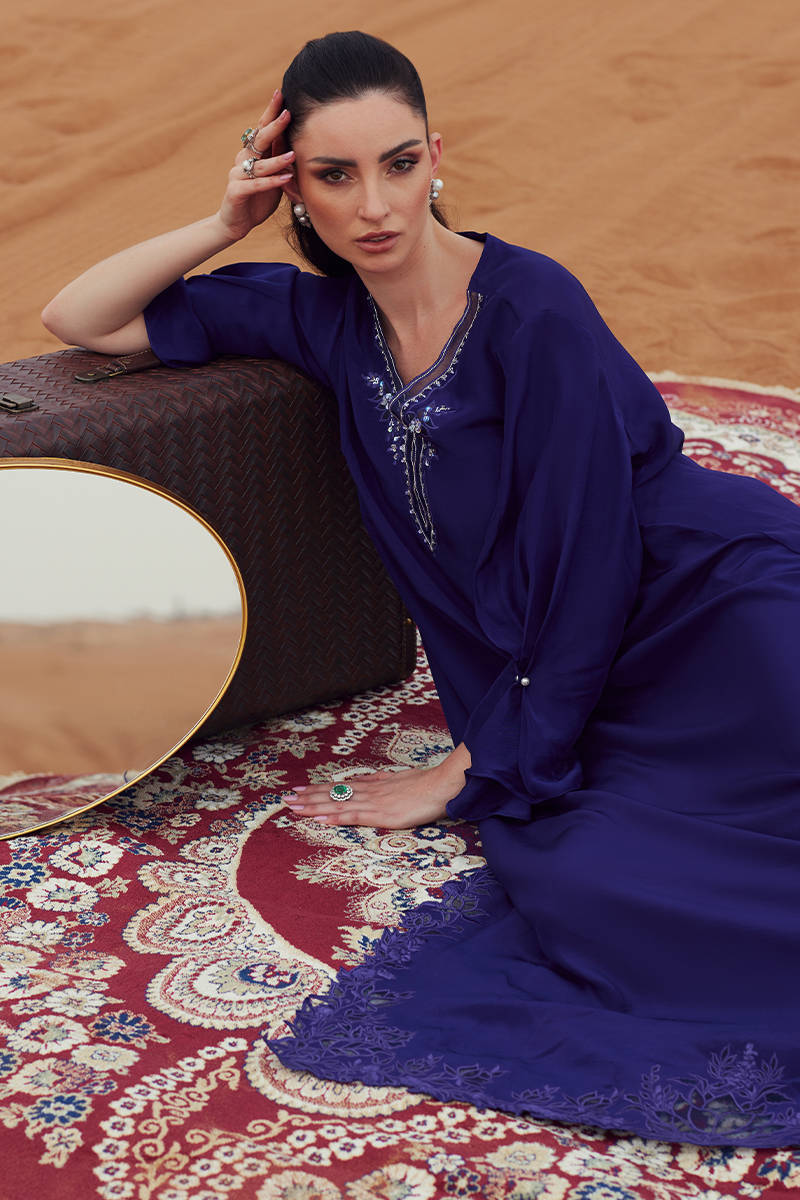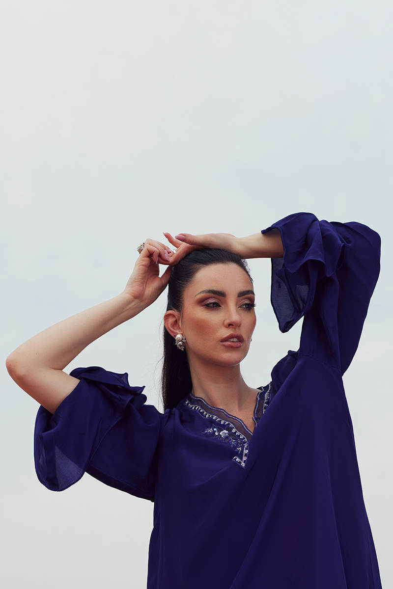 A kaftan-style shirt in Korean silk, detailed with intricate embroidery and subtle embellishments on the neckline and daman. Pleated sleeve accents add structure and sophistication. Styled with tailored Korean silk cigarette pants and finished with a lightweight KP silk scarf for a polished, contemporary look.