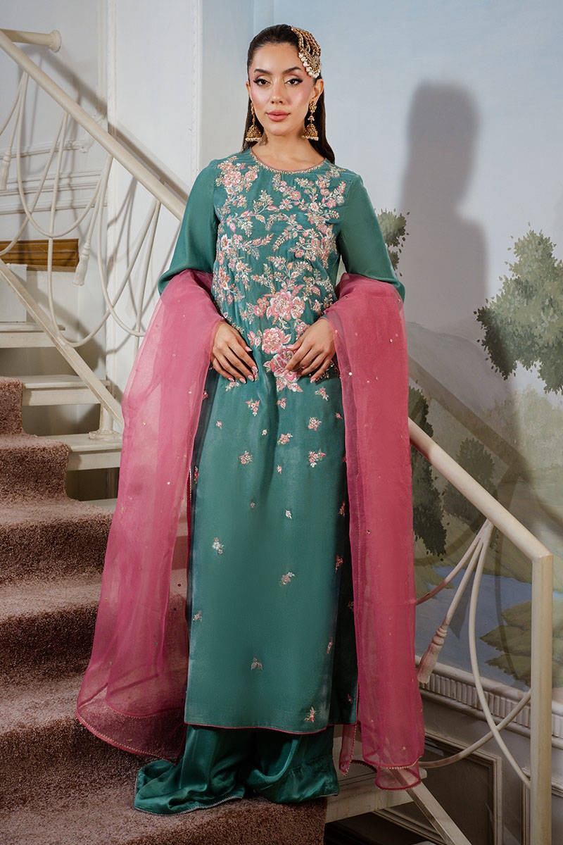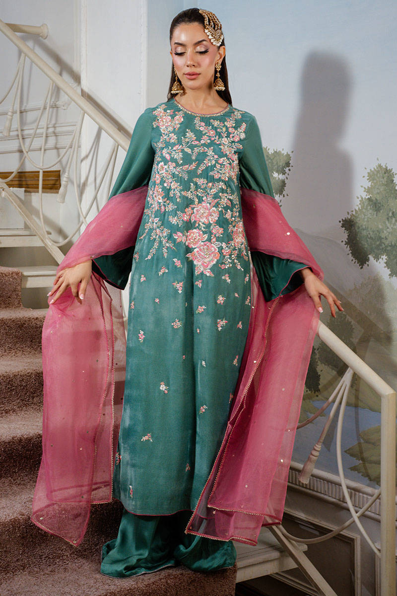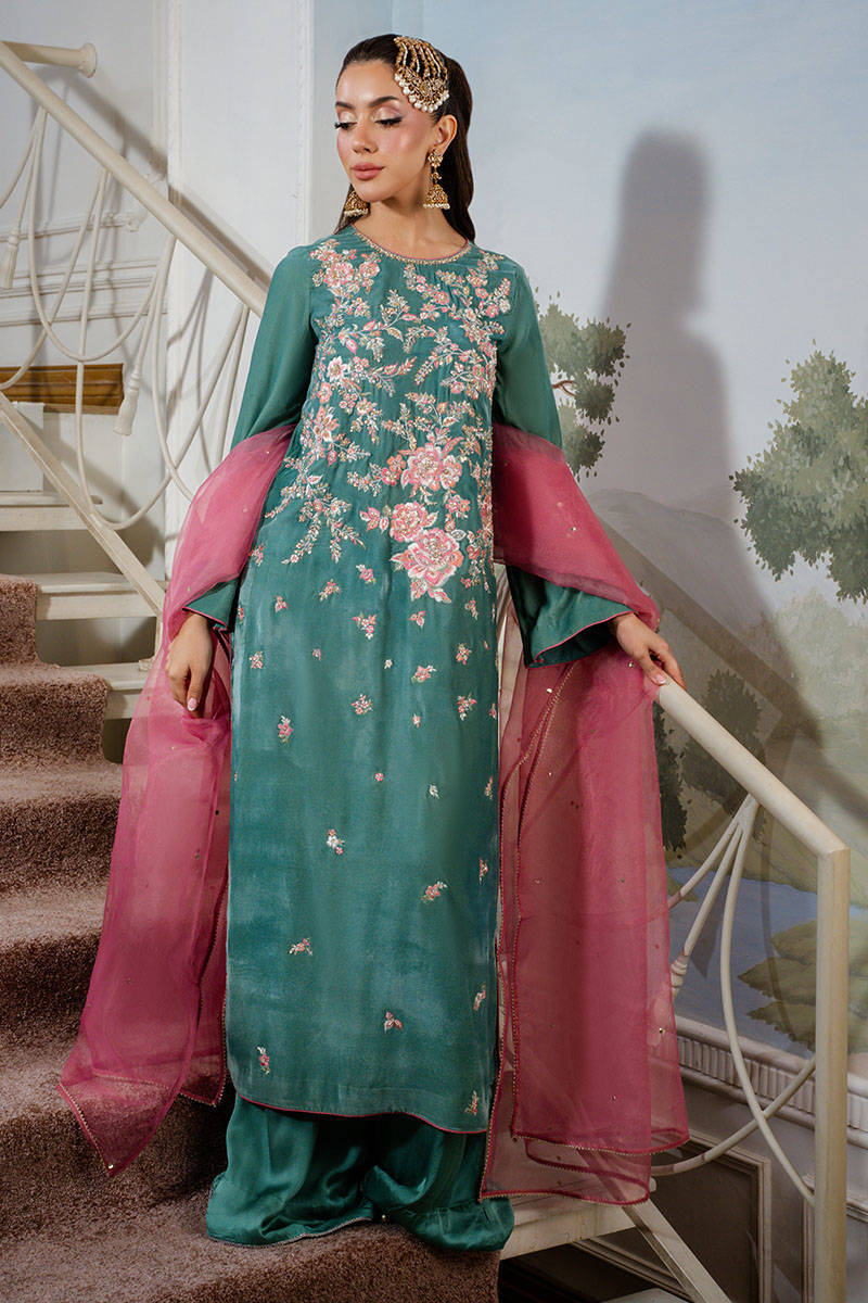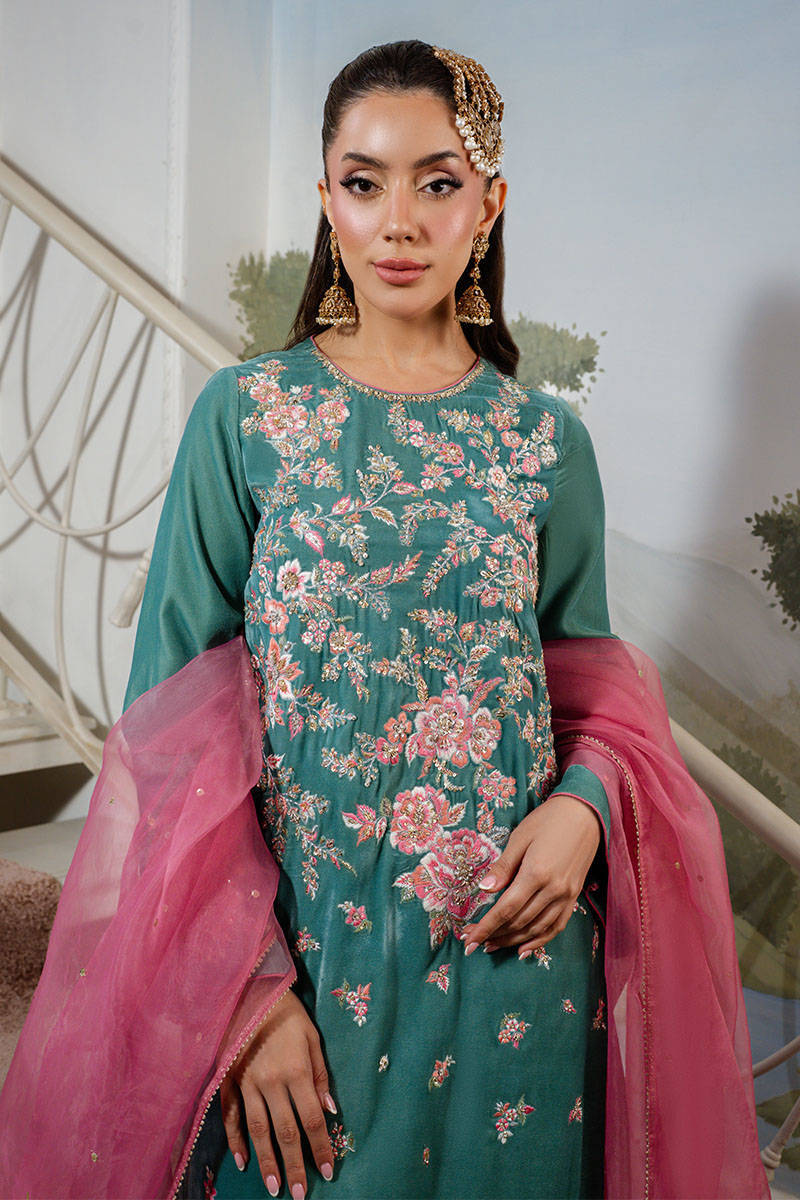 Callice is a stunning turquoise long shirt featuring intricate embroidery and delicate hand embellishments throughout. Paired with silk pants and a contrasting salmon pink organza dupatta adorned with a subtle sequin spray, this ensemble exudes festive elegance with a refined charm.