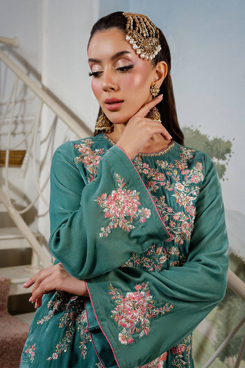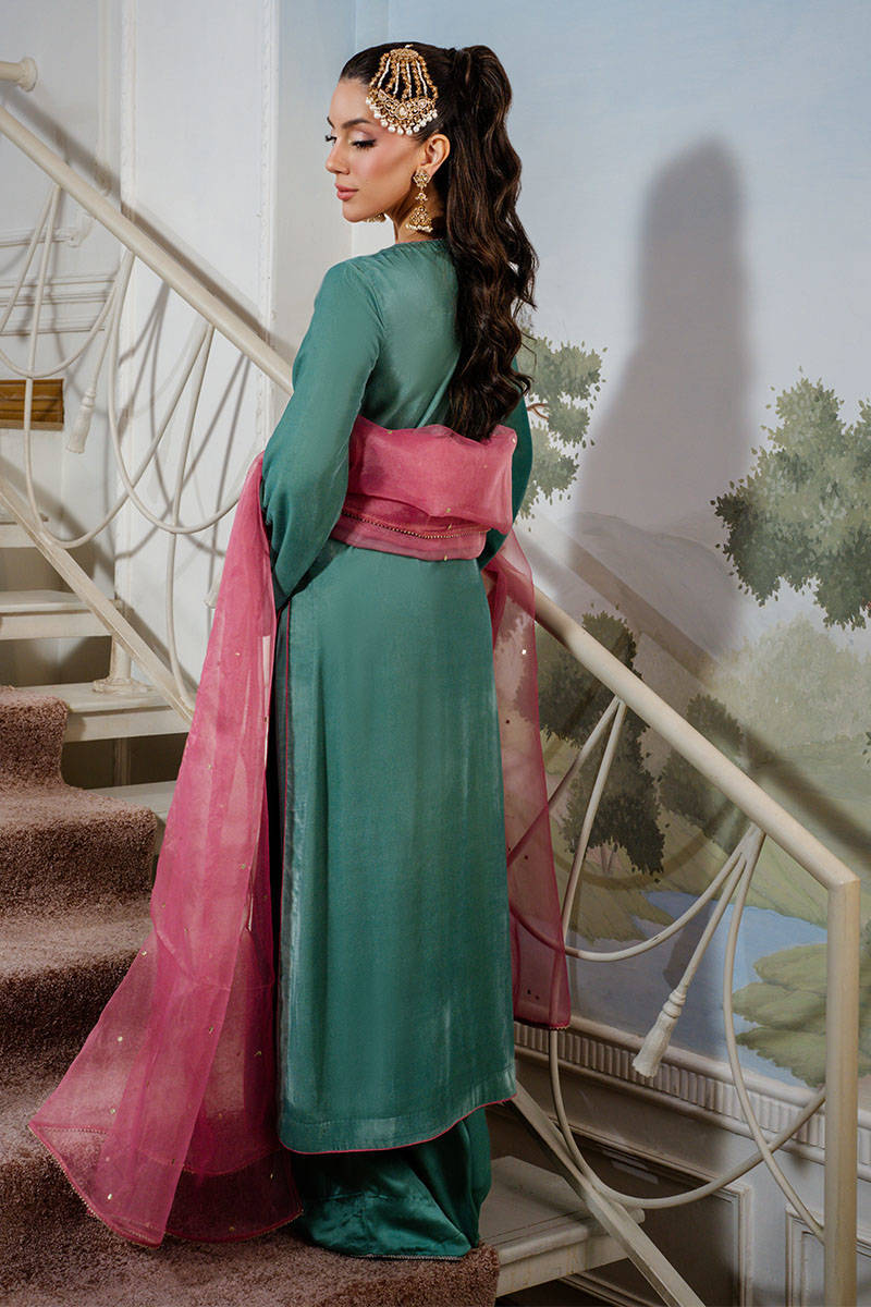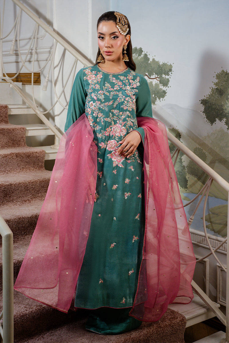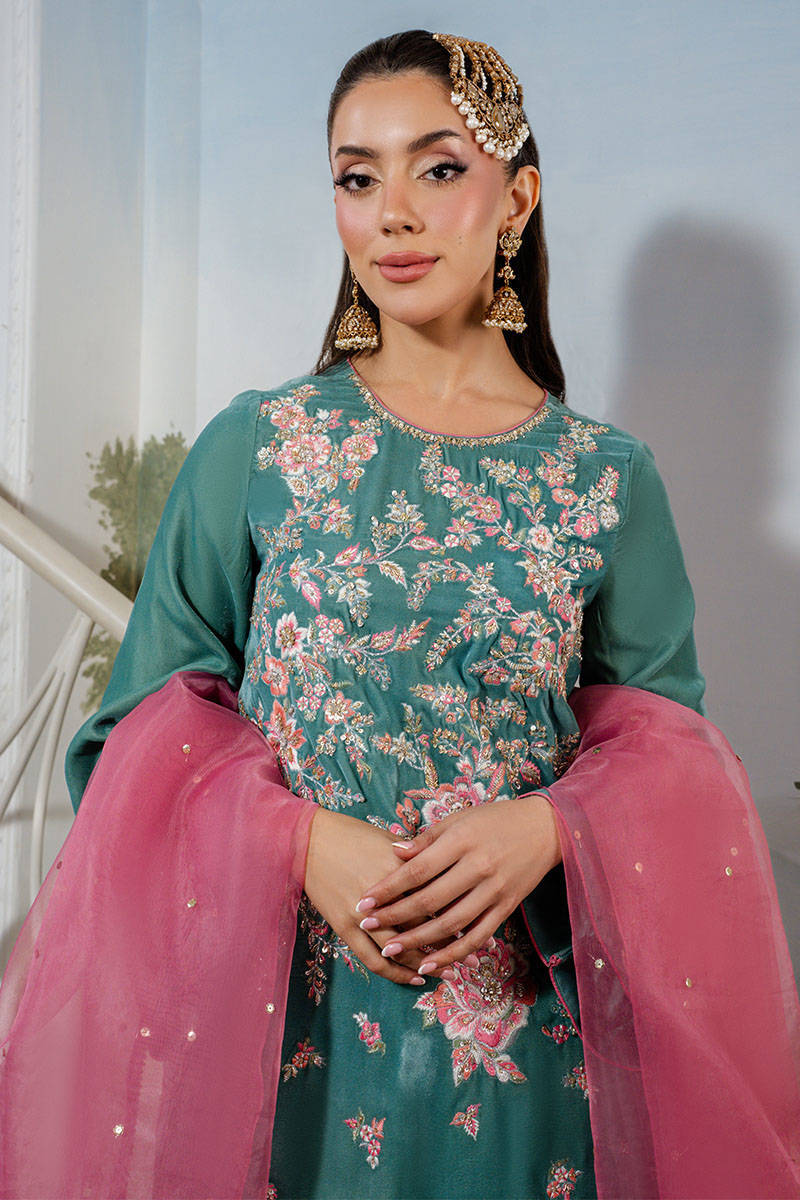 Callice is a stunning turquoise long shirt featuring intricate embroidery and delicate hand embellishments throughout. Paired with silk pants and a contrasting salmon pink organza dupatta adorned with a subtle sequin spray, this ensemble exudes festive elegance with a refined charm.