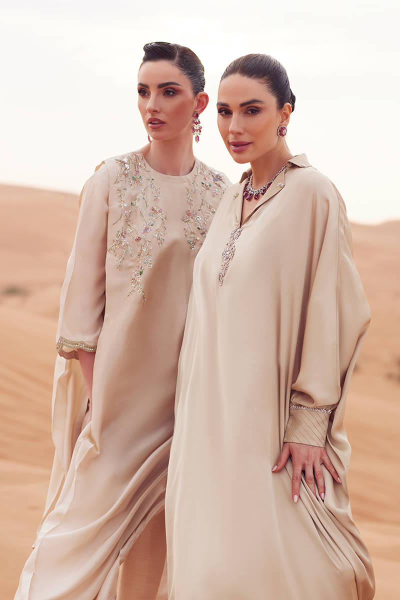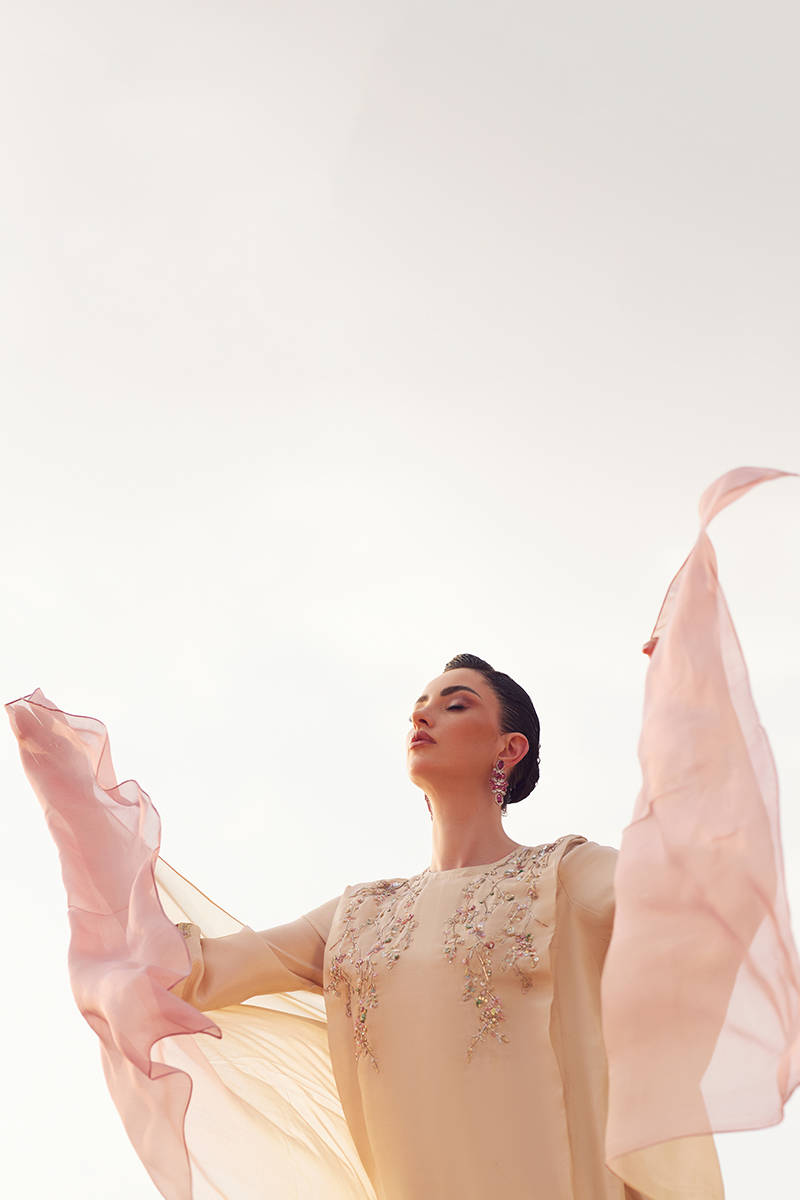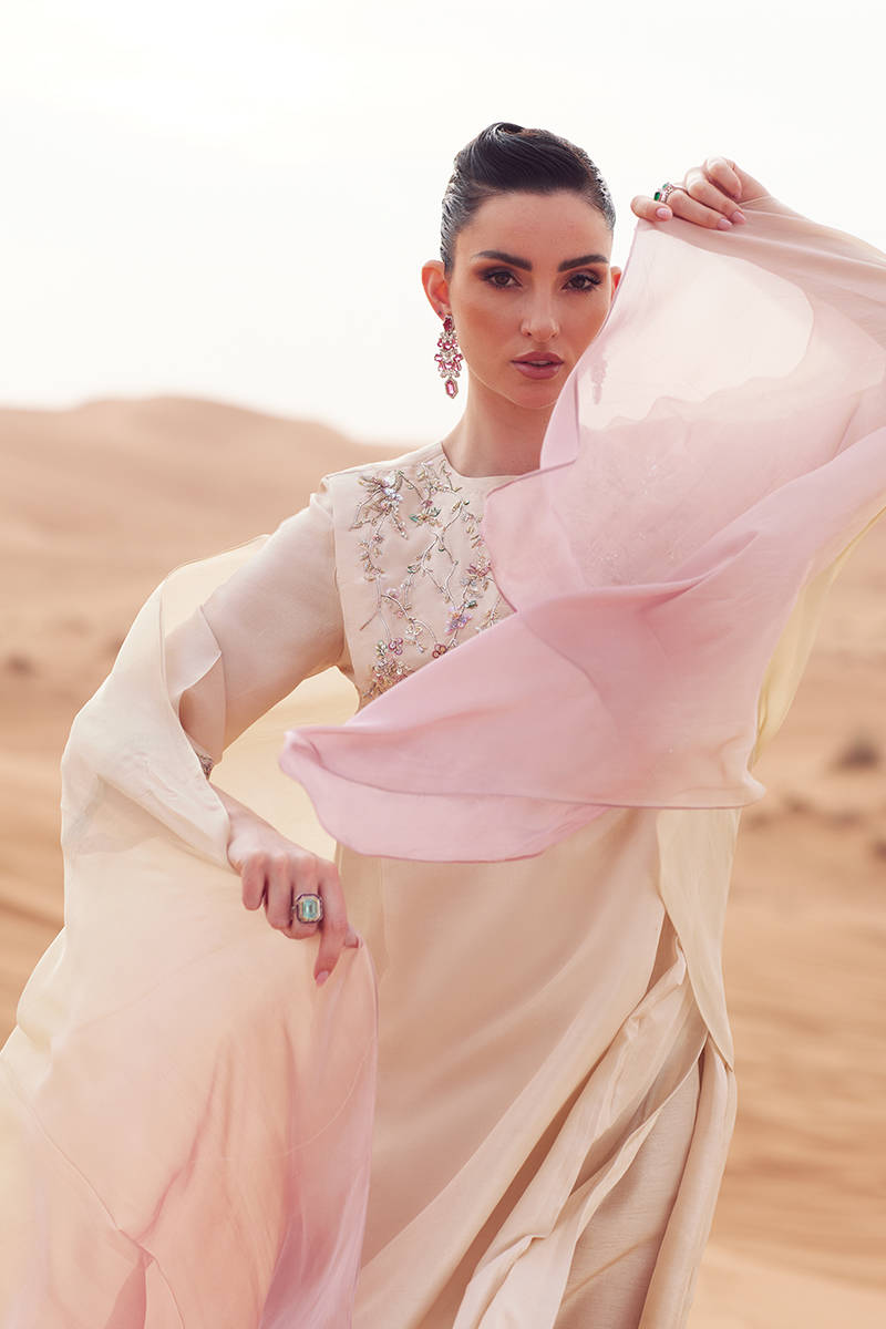 An exaggerated-shoulder, long loose-fit shirt in pure raw silk, designed for a bold, contemporary silhouette. Paired with tailored Korean silk cigarette pants for a sleek finish. Completed with a gradient-dyed dupatta and delicate embellishments along the neckline, adding subtle texture and elegance.