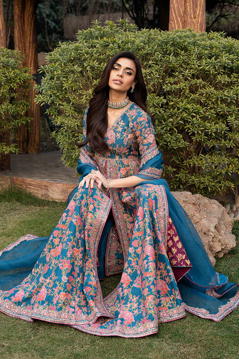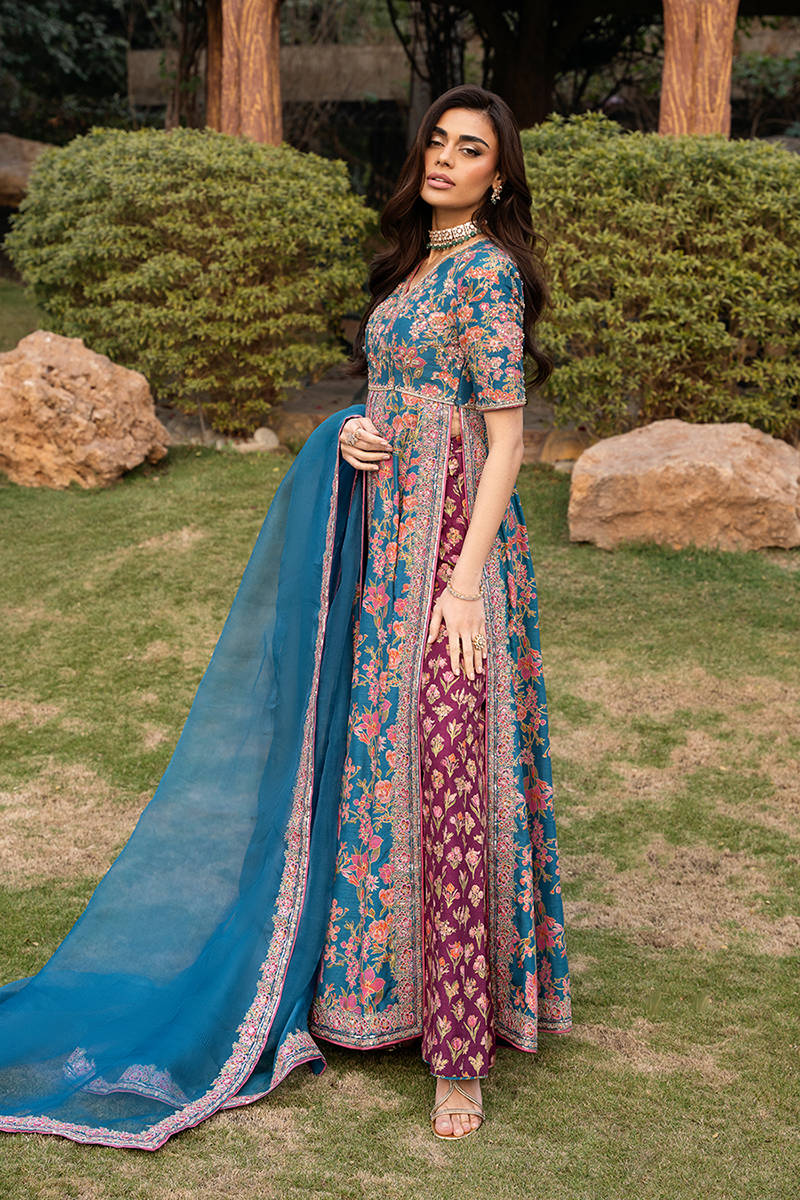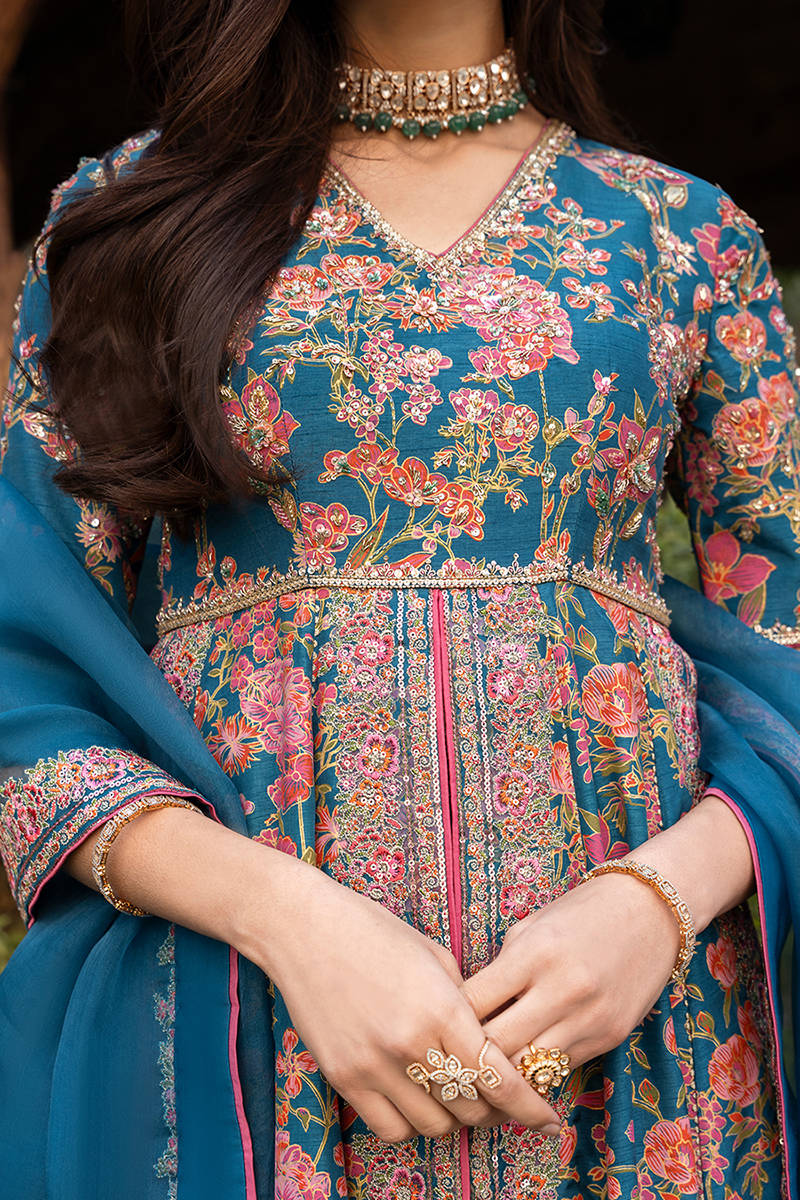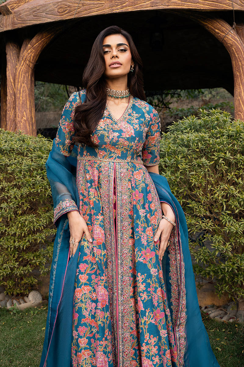 This stunning front-open screen printed kalidar is designed in a rich blue color. The kalidar features beautifully detailed embroidery along the neckline, bodice, and flowing panels, enhanced with delicate hand embellishments that add a luxurious, artisanal touch. It is paired with accent color screen printed pants crafted from premium Korean raw silk, offering a smooth texture and refined structure for all-day comfort. Completing the ensemble is a sheer organza dupatta, finished with finely embroidered borders that elevate the overall look with subtle sophistication.