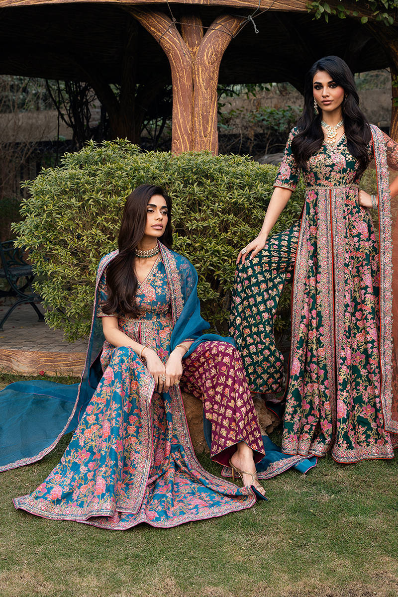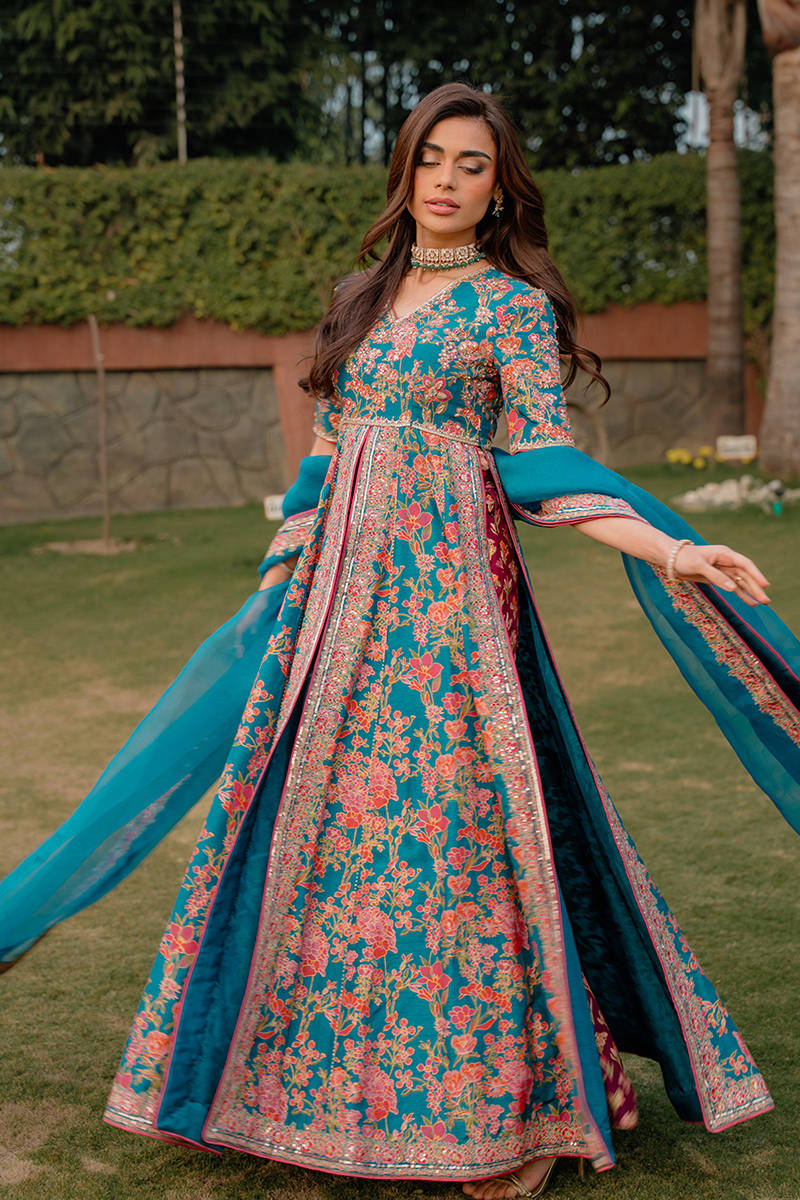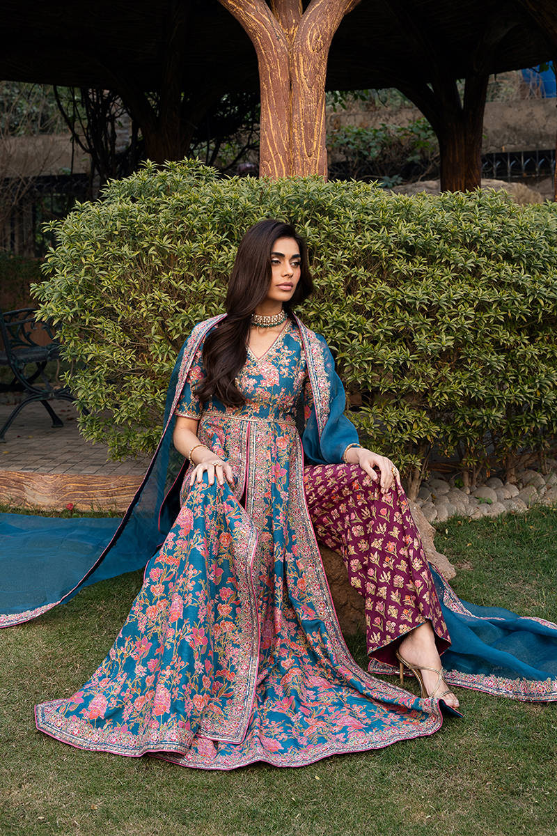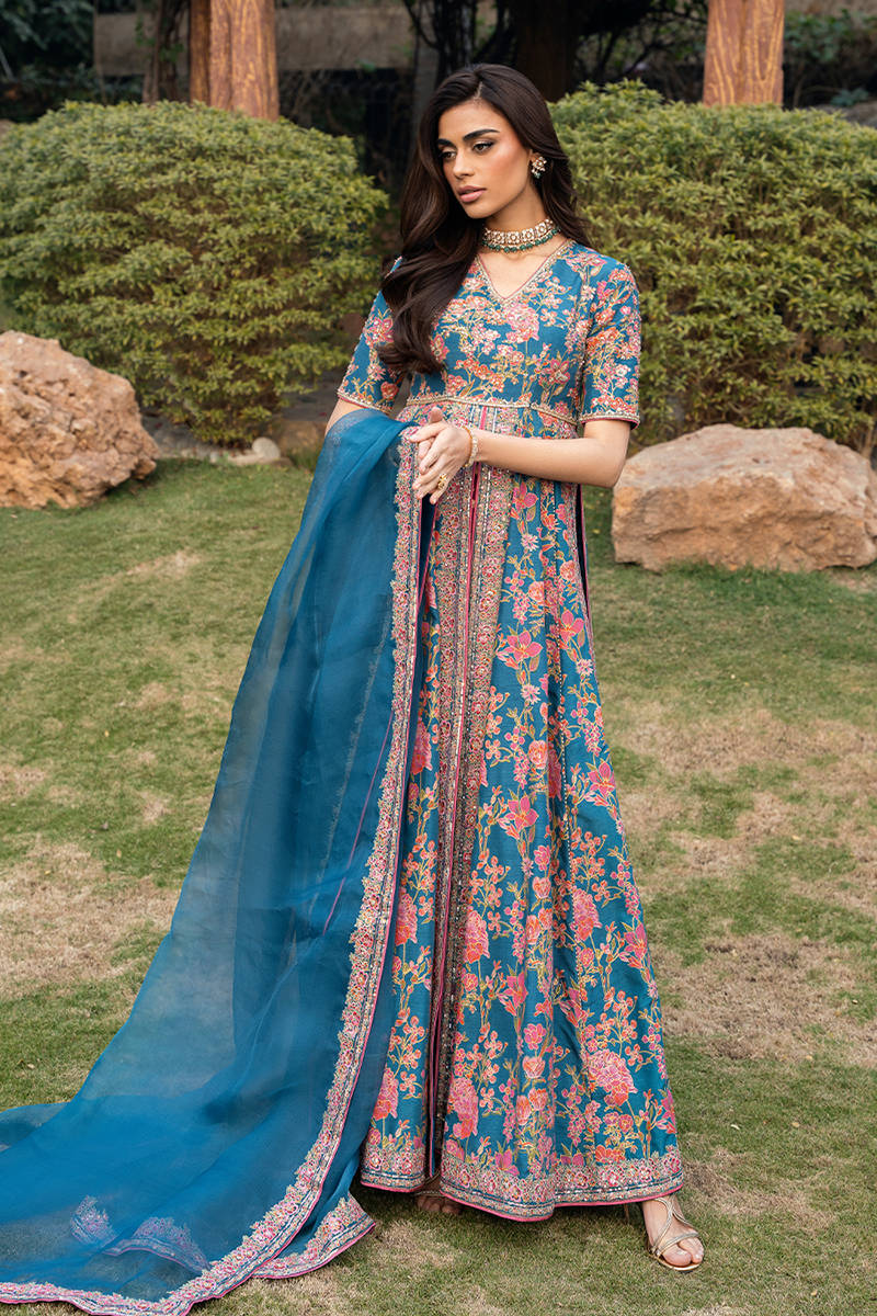 This stunning front-open screen printed kalidar is designed in a rich blue color. The kalidar features beautifully detailed embroidery along the neckline, bodice, and flowing panels, enhanced with delicate hand embellishments that add a luxurious, artisanal touch. It is paired with accent color screen printed pants crafted from premium Korean raw silk, offering a smooth texture and refined structure for all-day comfort. Completing the ensemble is a sheer organza dupatta, finished with finely embroidered borders that elevate the overall look with subtle sophistication.