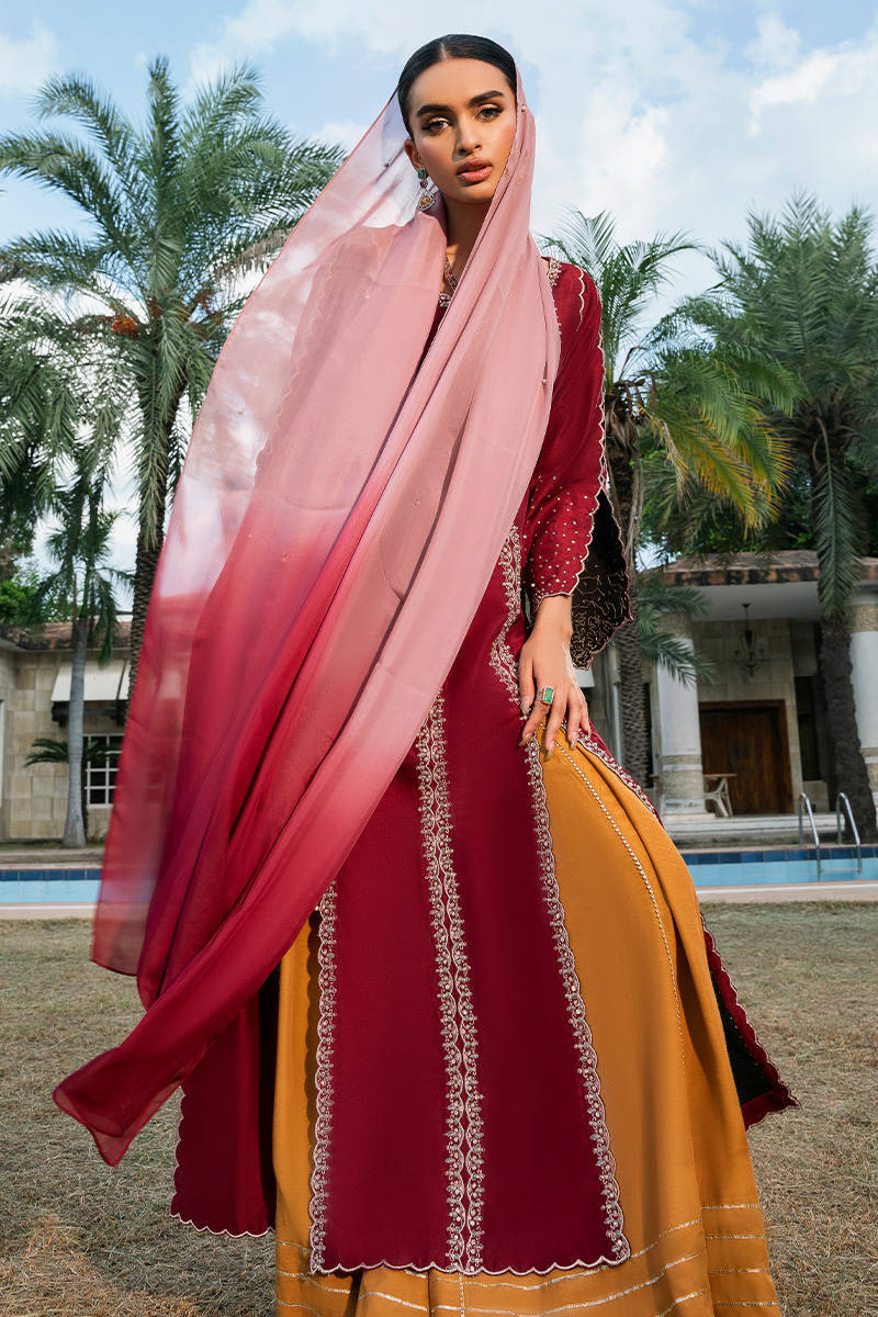 Cherry Muse is crafted from pure raw silk, featuring delicately embroidered panels adorned with intricate hand embellishments. The neckline is enhanced with detailed embellishments, while the sleeves make a statement with dramatic handwork and scalloped edges finished with shimmering sequins. Paired with contrasting mustard, extra-flared pants finished with gota detailing, the look exudes modern elegance. The outfit is completed with a stunning ombré silk scarf, adding the perfect feminine touch to elevate the ensemble.