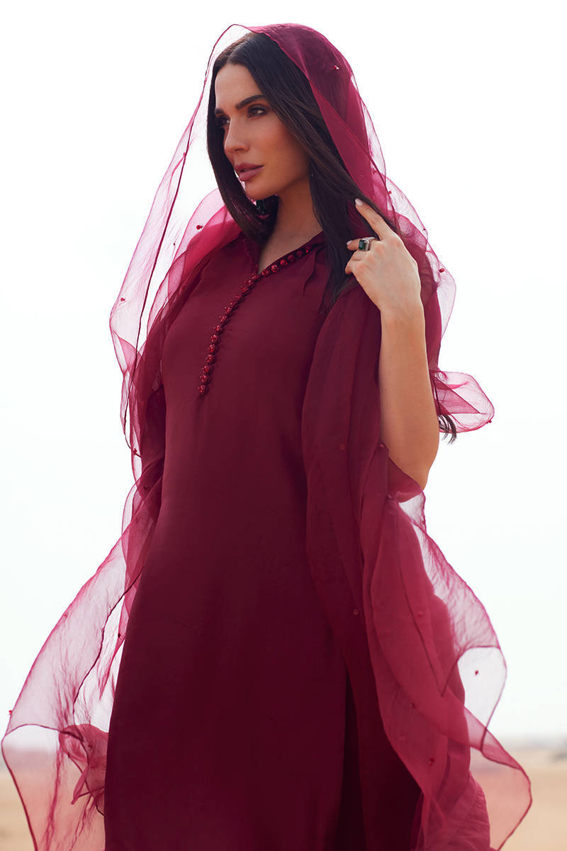 A timeless long straight shirt crafted in luxurious Korean silk, designed with refined collar detailing and a delicately pleated neckline. The front is elevated with elegant loop accents and statement embellished buttons, adding subtle festive charm. Paired with a sleek straight-fit trouser in matching Korean silk for a polished silhouette. The look is completed with a sheer organza dupatta, beautifully finished with a soft sequin spray that adds just the right touch of shimmer—perfect for serene Suhoor gatherings and graceful Eid celebrations.