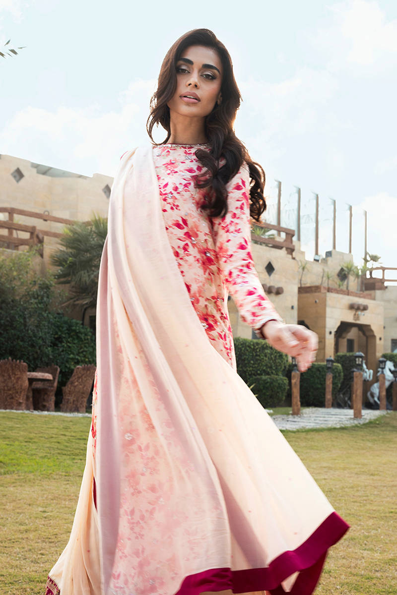 Digitally printed Shirt crafted from pure raw silk, adorned with a delicate all-over floral print. The shirt is further enhanced with subtle hand embellishments, adding a touch of artisanal detail while maintaining a soft, graceful aesthetic. It is paired with PK raw silk pants, designed to complement the look with their structured silhouette and richly detailed embroidered borders, lending a luxurious finish to the outfit. Completing the ensemble is a flowing chiffon dupatta, draped effortlessly to add lightness and movement, beautifully balancing the richness of the silk textures.