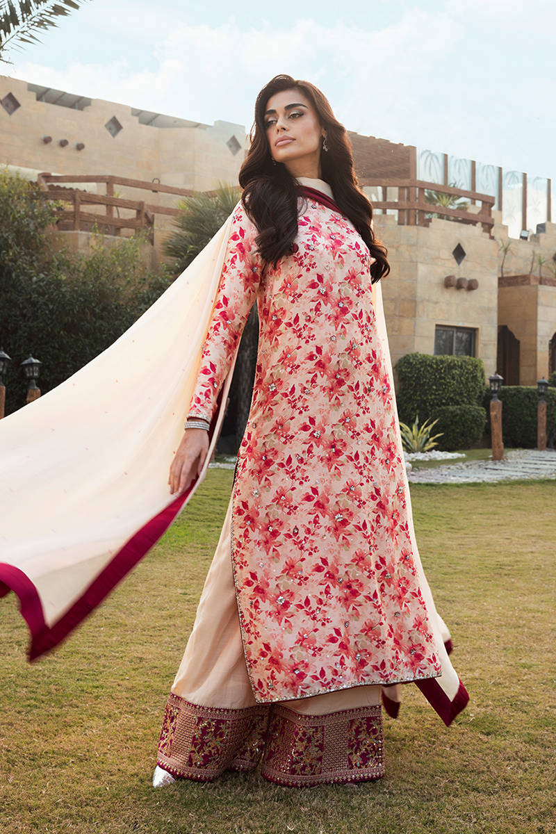Digitally printed Shirt crafted from pure raw silk, adorned with a delicate all-over floral print. The shirt is further enhanced with subtle hand embellishments, adding a touch of artisanal detail while maintaining a soft, graceful aesthetic. It is paired with PK raw silk pants, designed to complement the look with their structured silhouette and richly detailed embroidered borders, lending a luxurious finish to the outfit. Completing the ensemble is a flowing chiffon dupatta, draped effortlessly to add lightness and movement, beautifully balancing the richness of the silk textures.