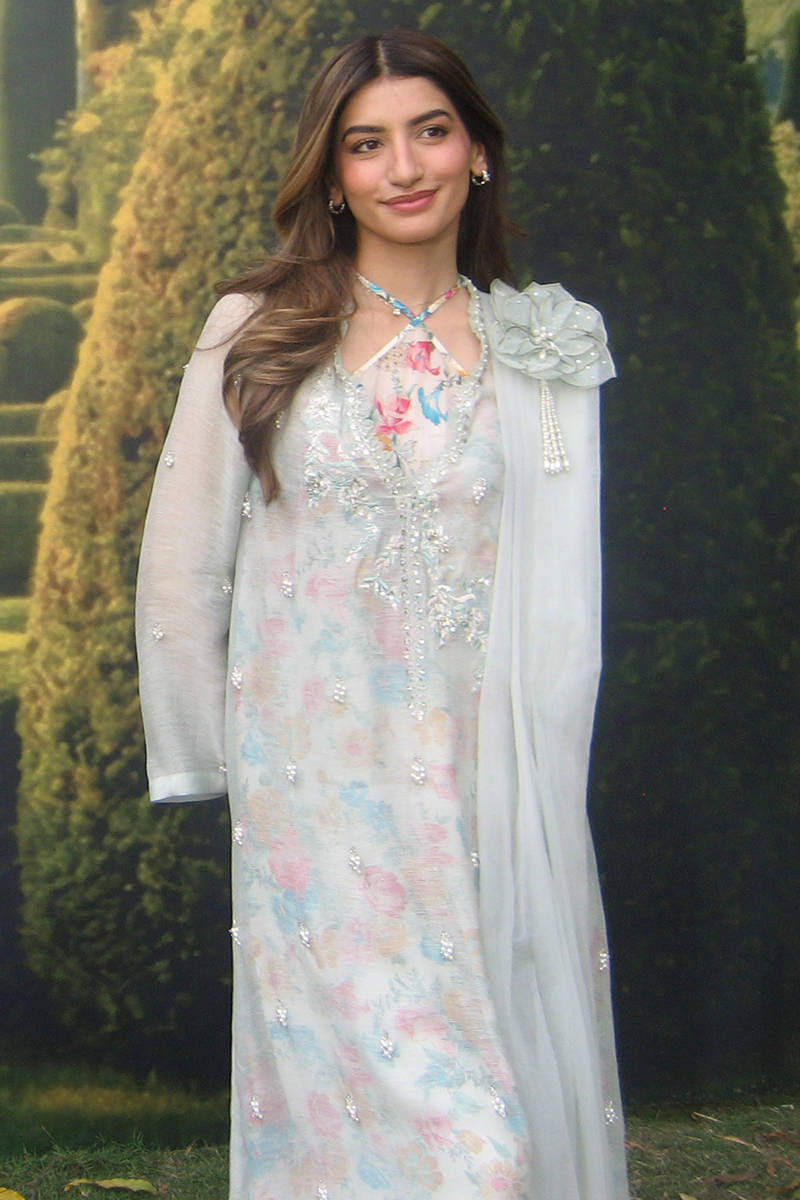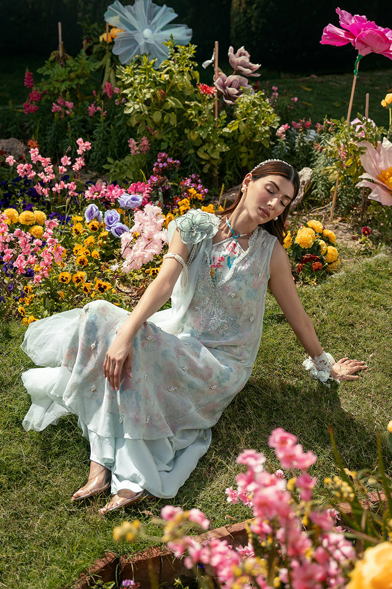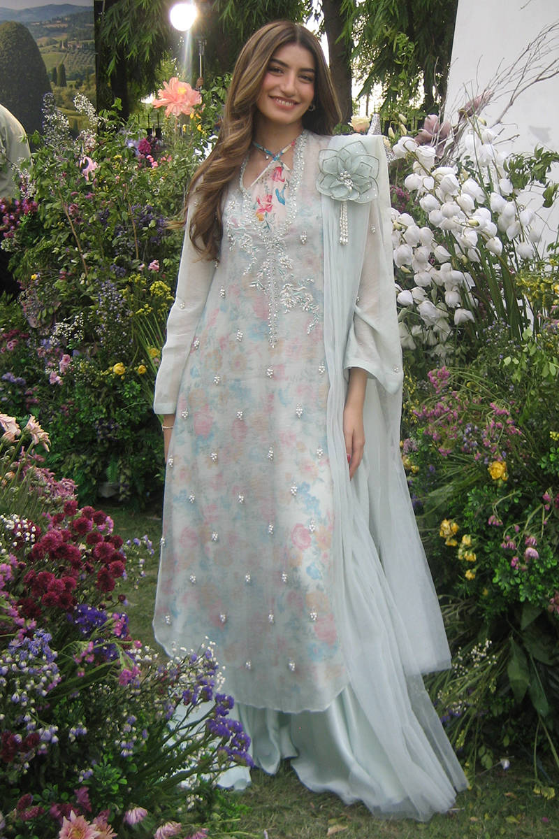 This ensemble features an A-line sleeveless shirt paired with a separate slip designed with a graceful cross neckline, delicately enhanced with subtle hand embellishments for a refined finish. Styled with clean Bambi pants and a dupatta adorned with soft floral motif, the look feels light, modern, and effortlessly elegant.