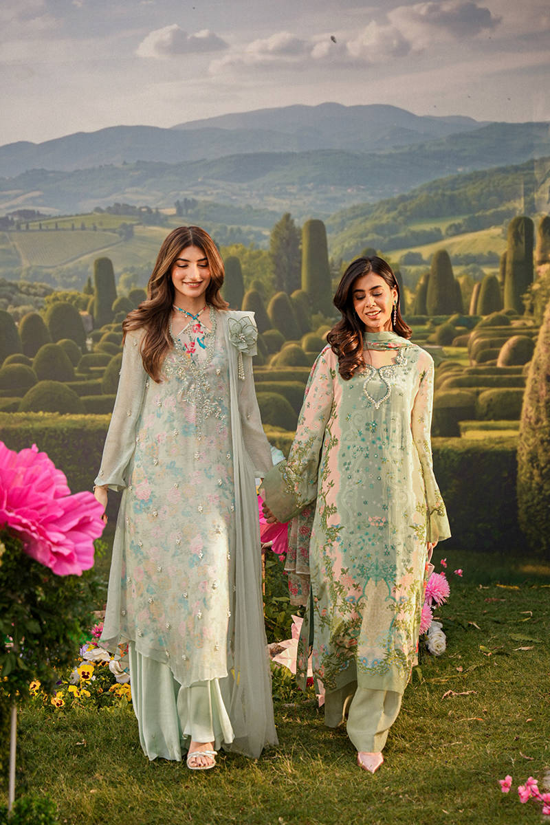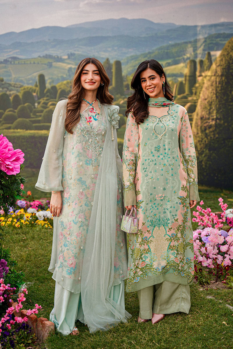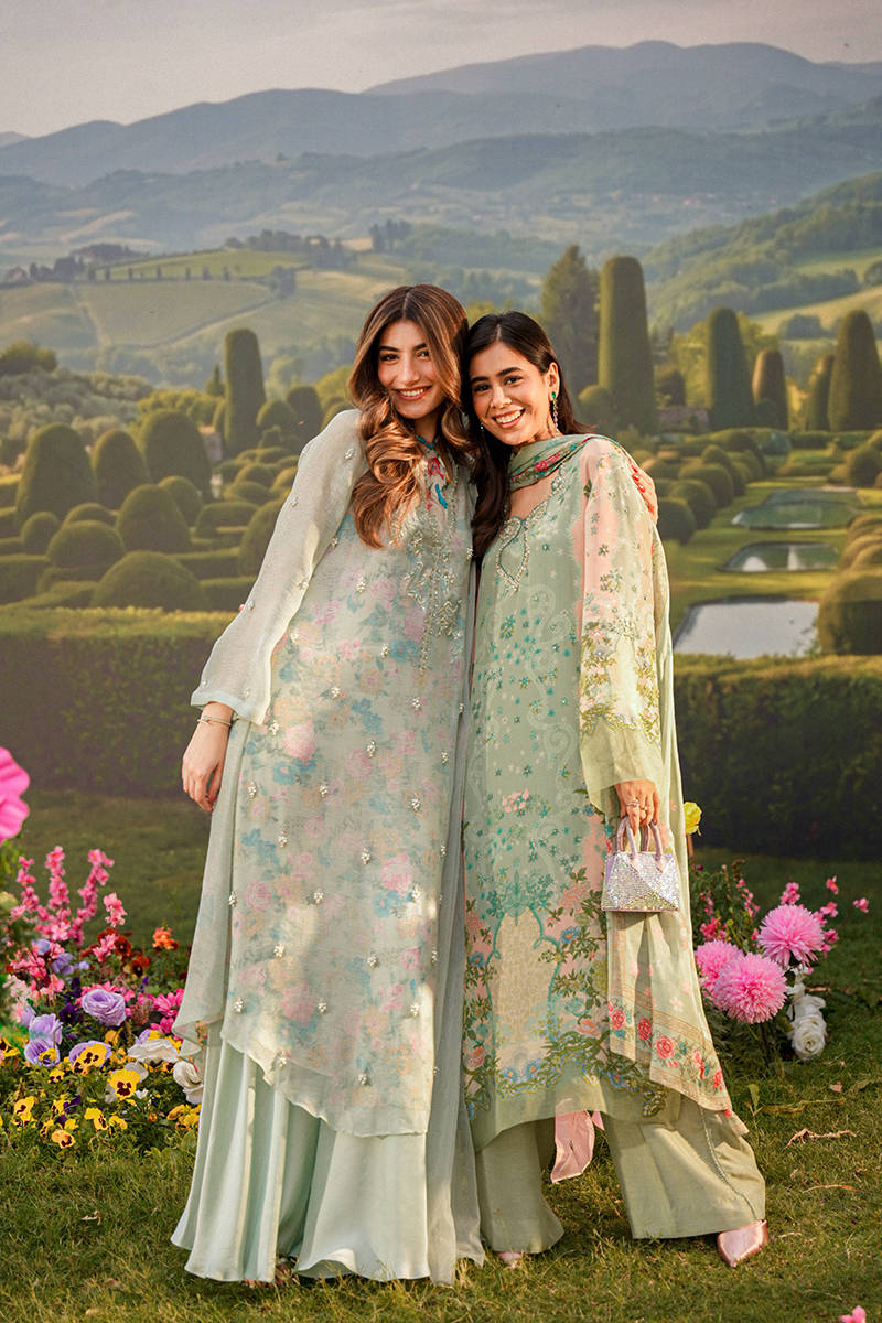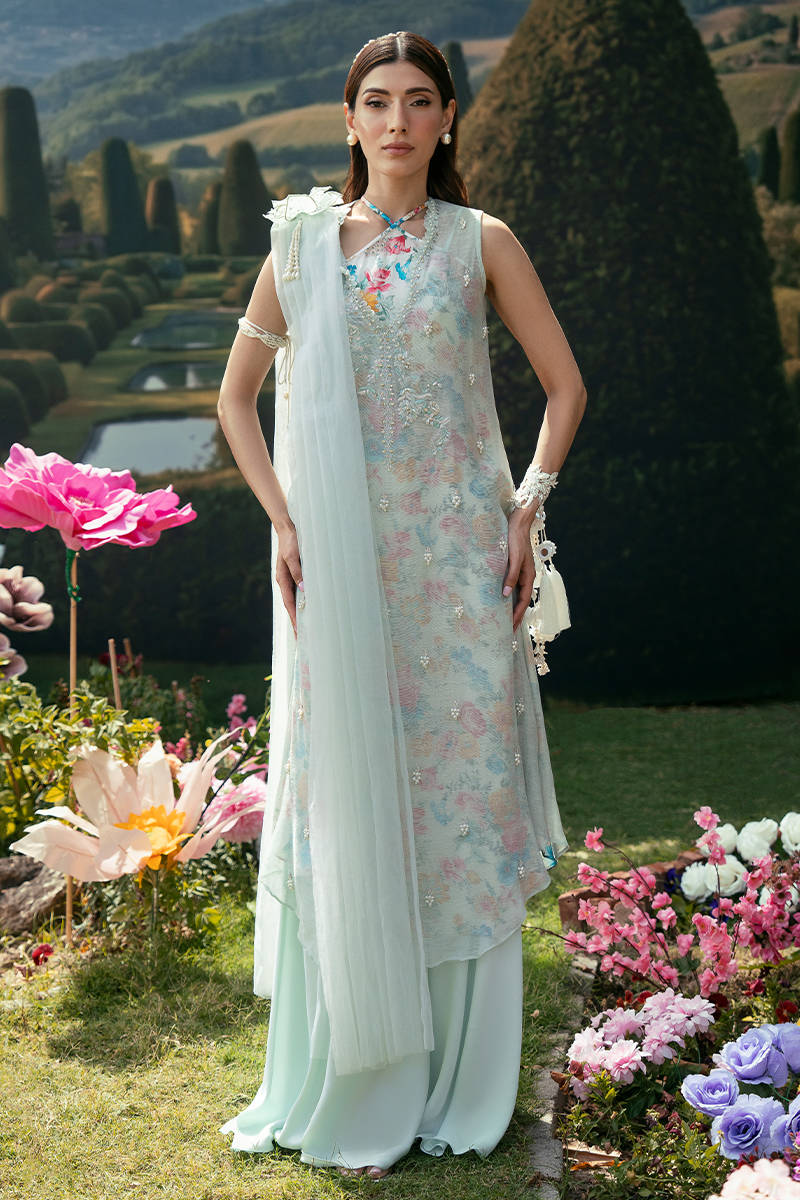 This ensemble features an A-line sleeveless shirt paired with a separate slip designed with a graceful cross neckline, delicately enhanced with subtle hand embellishments for a refined finish. Styled with clean Bambi pants and a dupatta adorned with soft floral motif, the look feels light, modern, and effortlessly elegant.