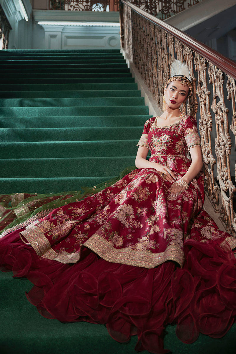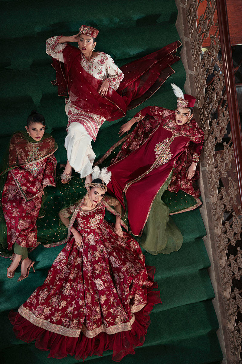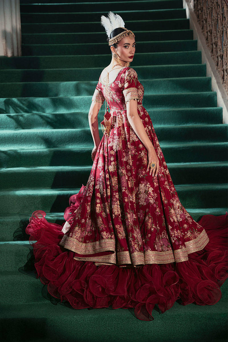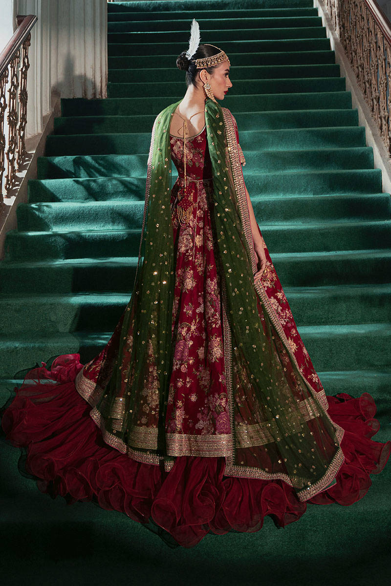 "Crimson Poise" is a show-stopping rose red raw silk kalidar, featuring intricate hand embellishments across the bodice, paired with striking Indian-inspired sleeves that create a perfect fusion of modern and traditional aesthetics. The elegant borders along the hem add a layer of sophistication. The outfit is elevated further by a contrasting leaf green net dupatta, heavily adorned with sequins and finished with intricate borders, adding a touch of opulence. For a truly grand statement, this exquisite kalidar is paired with a ruffled skirt (as shown), making it the perfect choice to stand out at any event. Alternatively, the kalidar can be paired with matching raw silk trousers to tone down the look for a more understated, yet equally elegant ensemble.