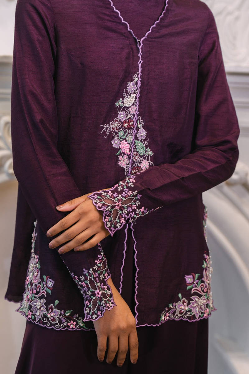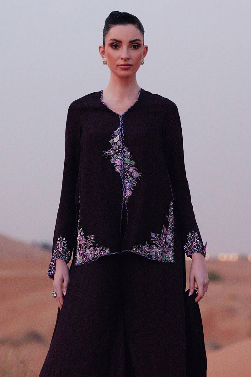 A front-open jacket crafted in Korean silk, adorned with vibrant embroidery and intricate hand embellishments throughout. Detailed with cutwork sleeves for added texture and dimension. Paired with an ombré-dyed KP silk scarf, adding a soft, fluid finish to the look.