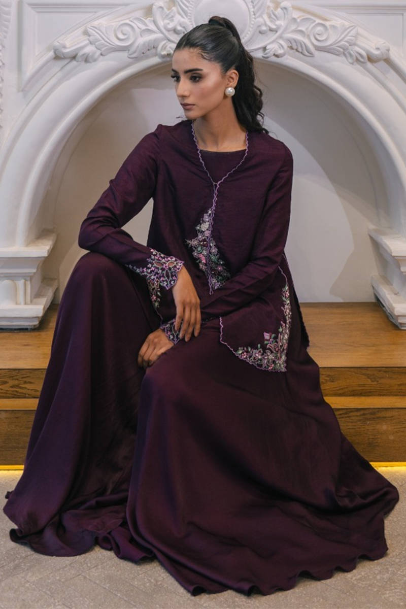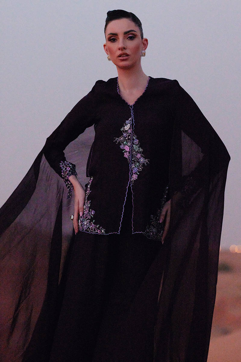 A front-open jacket crafted in Korean silk, adorned with vibrant embroidery and intricate hand embellishments throughout. Detailed with cutwork sleeves for added texture and dimension. Paired with an ombré-dyed KP silk scarf, adding a soft, fluid finish to the look.