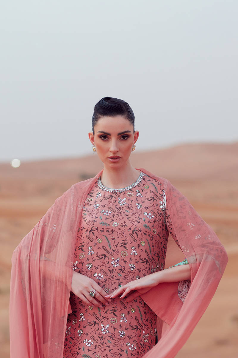 A long shirt crafted from pure raw silk, digitally printed and detailed with accent-color sleeve patches. Hand embellishments adorn the shirt and sleeves all over, adding refined texture and detail. Paired with PK raw silk wide-leg pants for a balanced, modern silhouette. Completed with a chiffon dupatta, finished with sequin embellishment on the pallus for a subtle, elegant sheen.