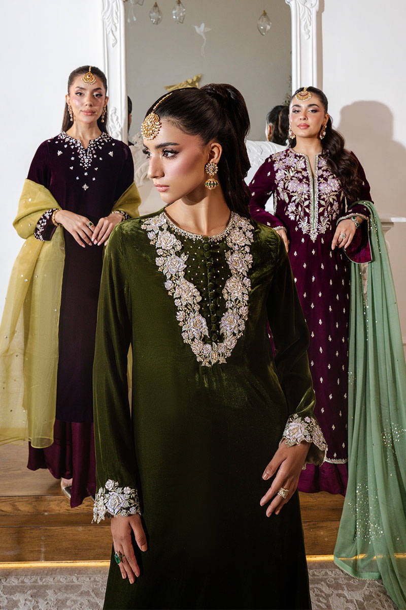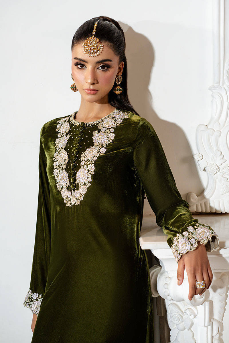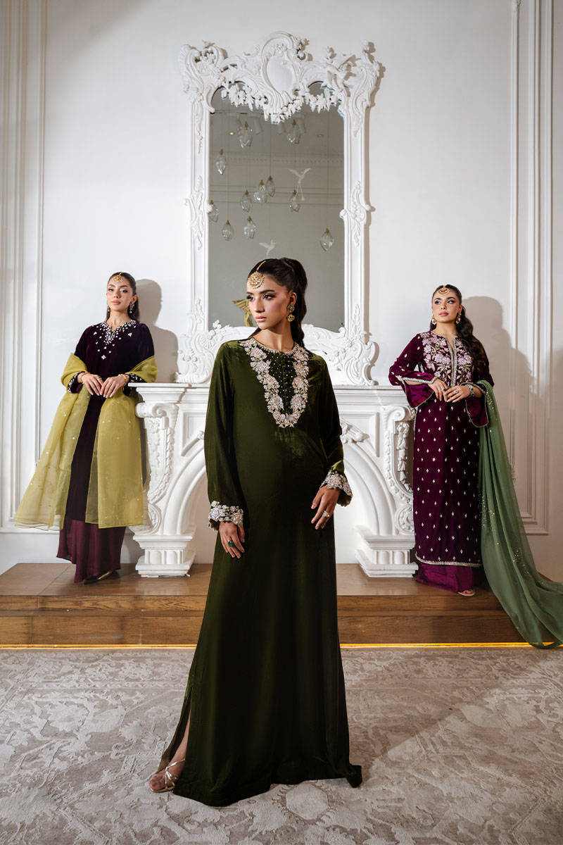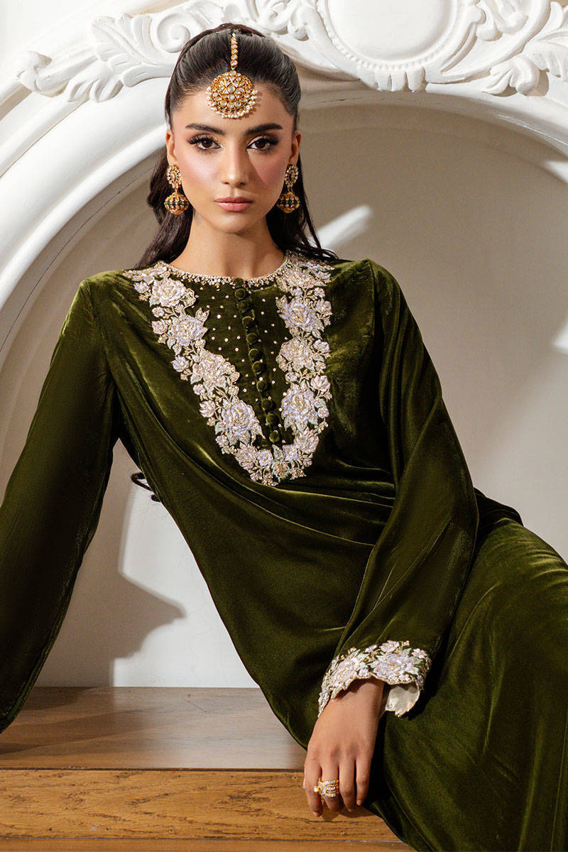 Color: Kaftan Shirt: Olive Green Fabric: Kaftan: Velvet Work Details: Hand-Embellished and Embroidered
