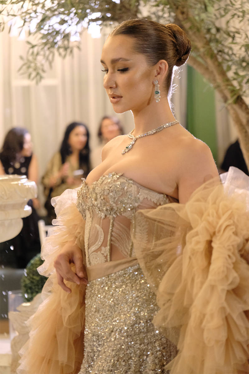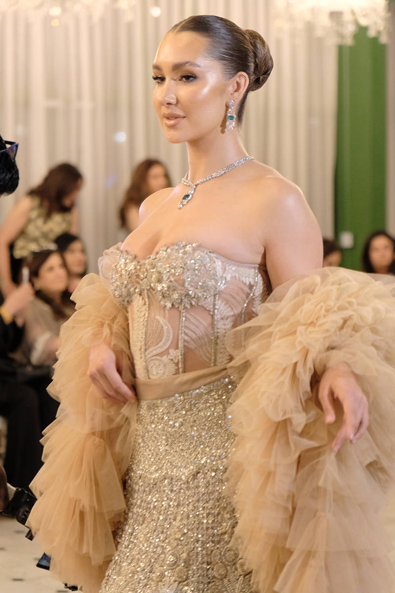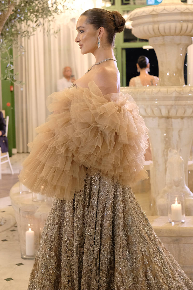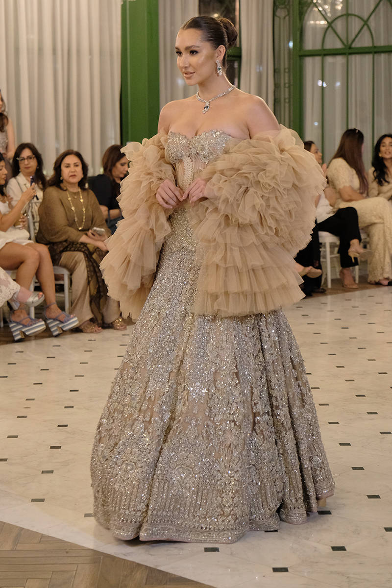 An exquisite nude lehnga choli crafted from net fabric, featuring stunning hand embellishments to create a striking bridal ensemble. This elegant lehnga is adorned with intricate Swarovski crystals and detailed embroidery, meticulously woven into the fabric. The choli is similarly designed with intricate embellishments throughout. The outfit is complemented by a beautiful and extravagant veil, which enhances the grandeur of the ensemble. The veil features an embellished four-sided border and is adorned with starburst patterns across its entirety.This piece is heavily embellished with detailed embroidery, Swarovski crystals and intricate tassels at the back. It can be paired alternatively with corset as well with ruffles for demi couture edge.