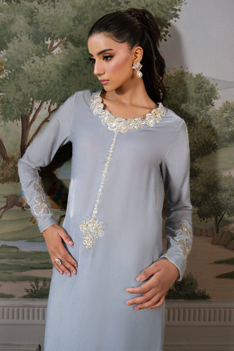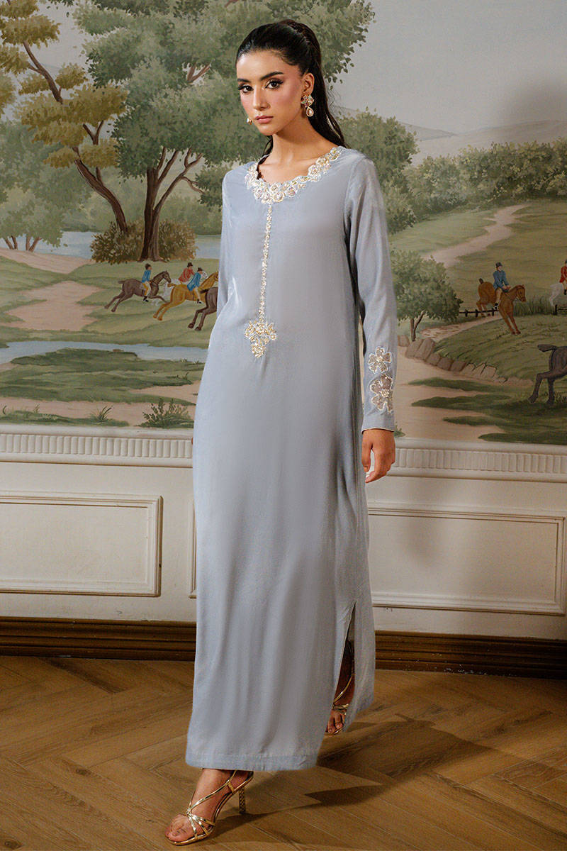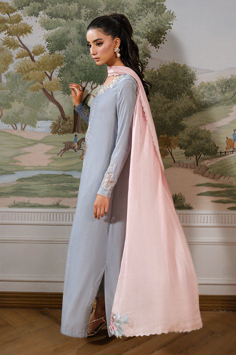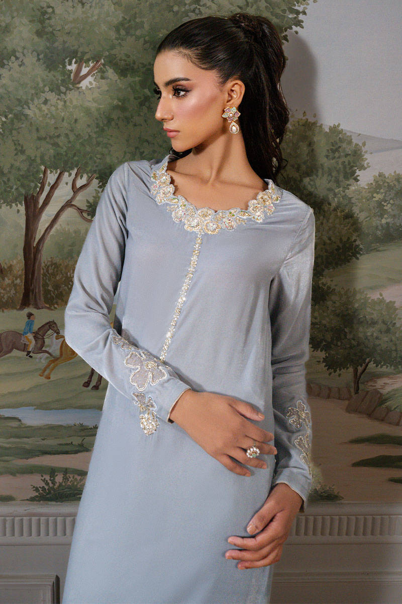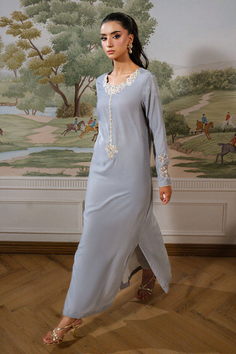 Forest Grey is an eye-catching silver-grey long shirt adorned with exquisite hand embellishments along the neckline and intricate appliqué detailing on the sleeves. Paired with matching satin pants, the look is completed with a medium silk dupatta featuring delicate embroidered edges. This ensemble is a perfect blend of modern sophistication and timeless allure.
