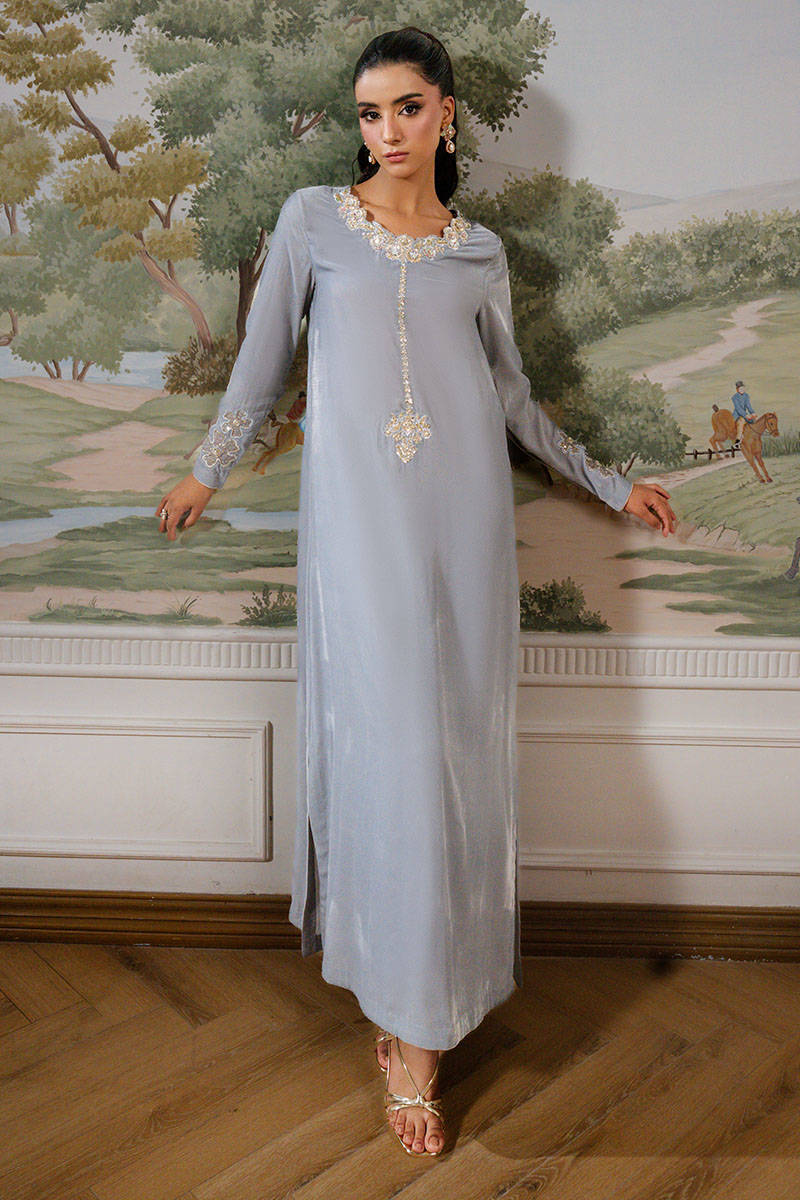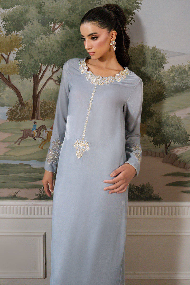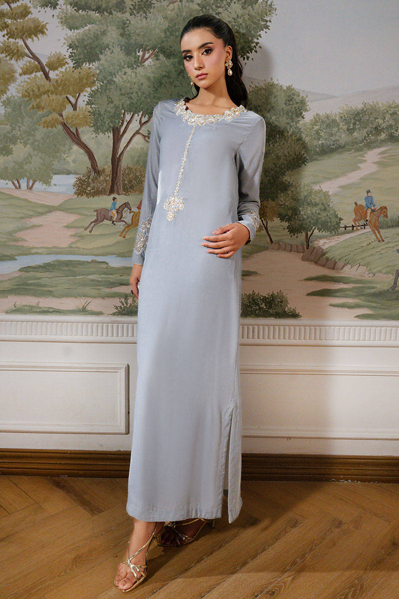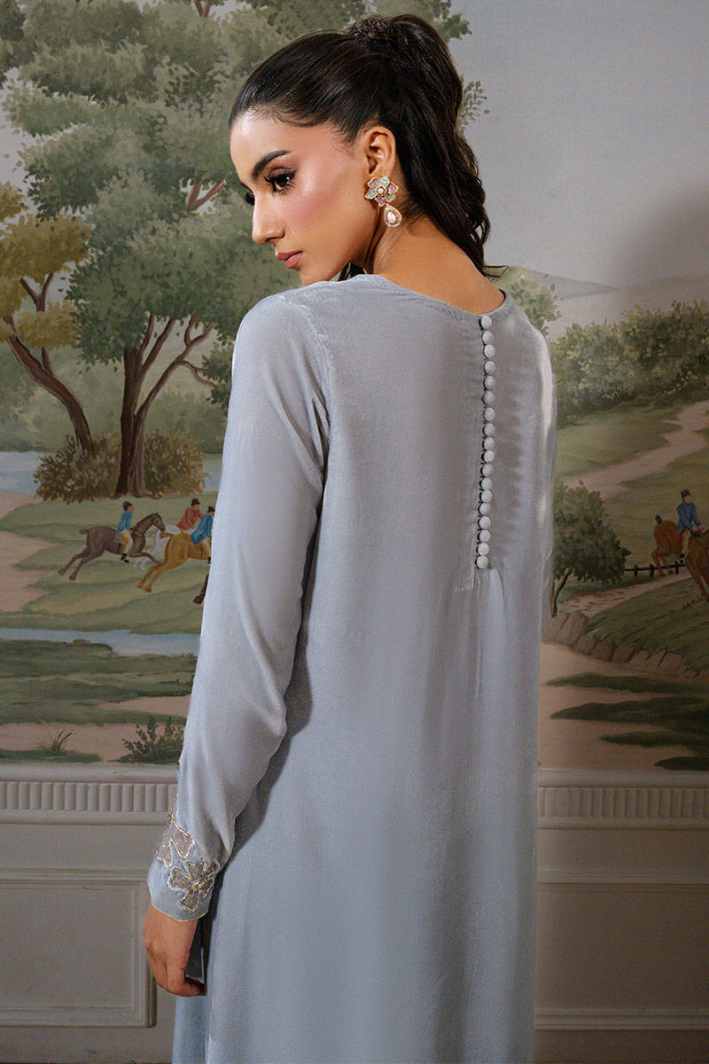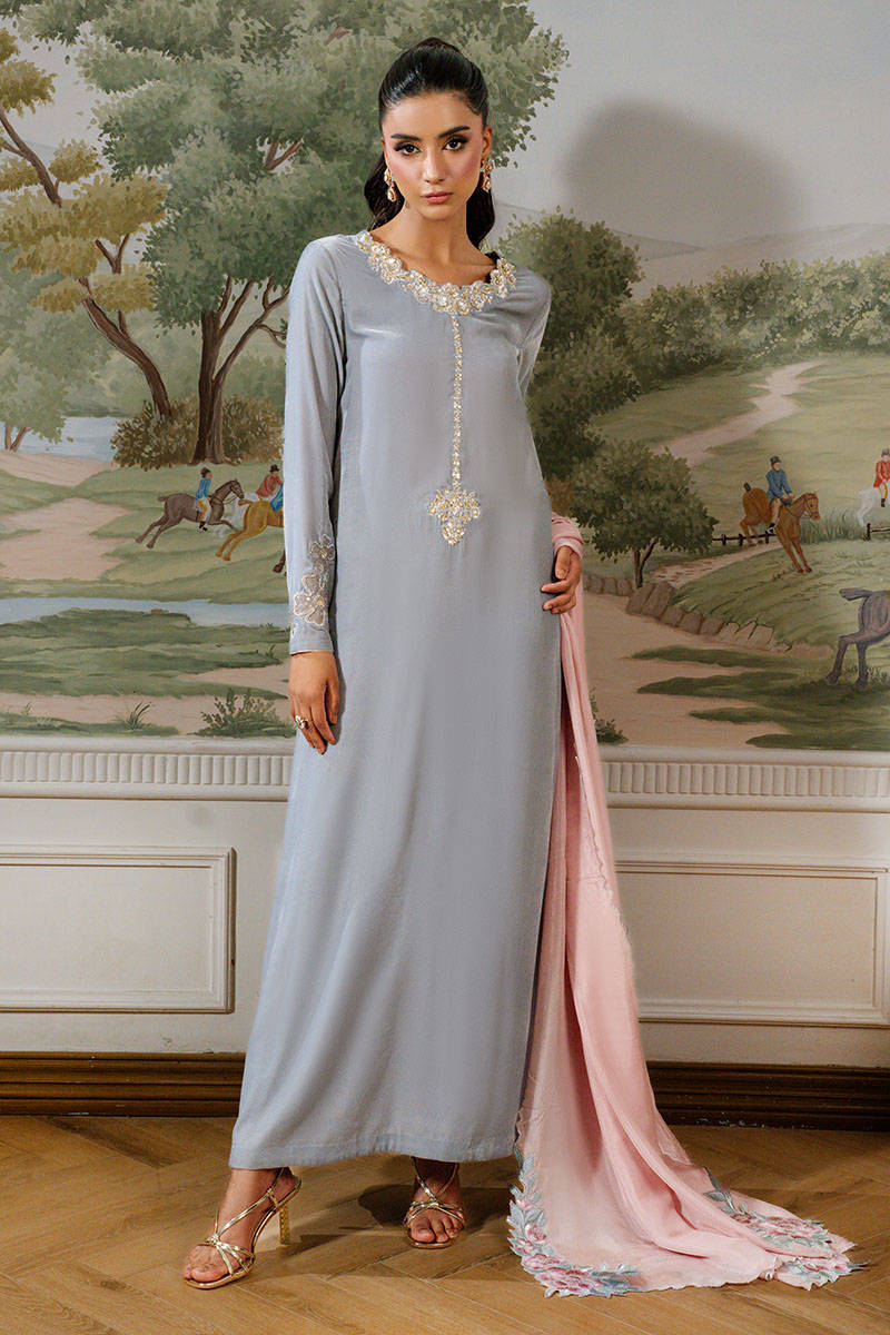 Forest Grey is an eye-catching silver-grey long shirt adorned with exquisite hand embellishments along the neckline and intricate appliqué detailing on the sleeves. Paired with matching satin pants, the look is completed with a medium silk dupatta featuring delicate embroidered edges. This ensemble is a perfect blend of modern sophistication and timeless allure.
