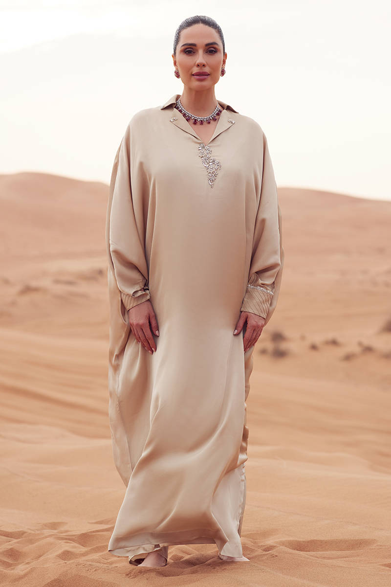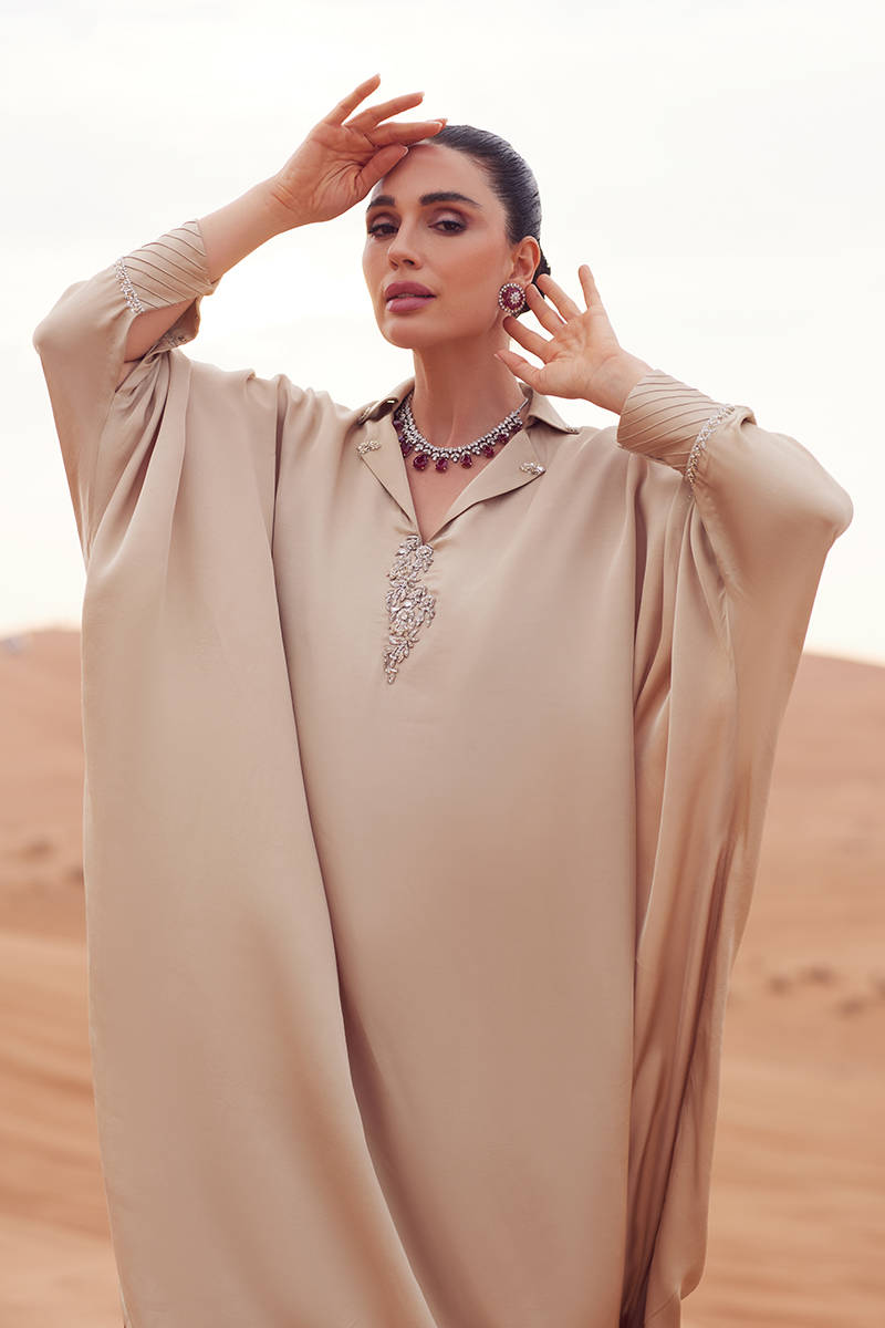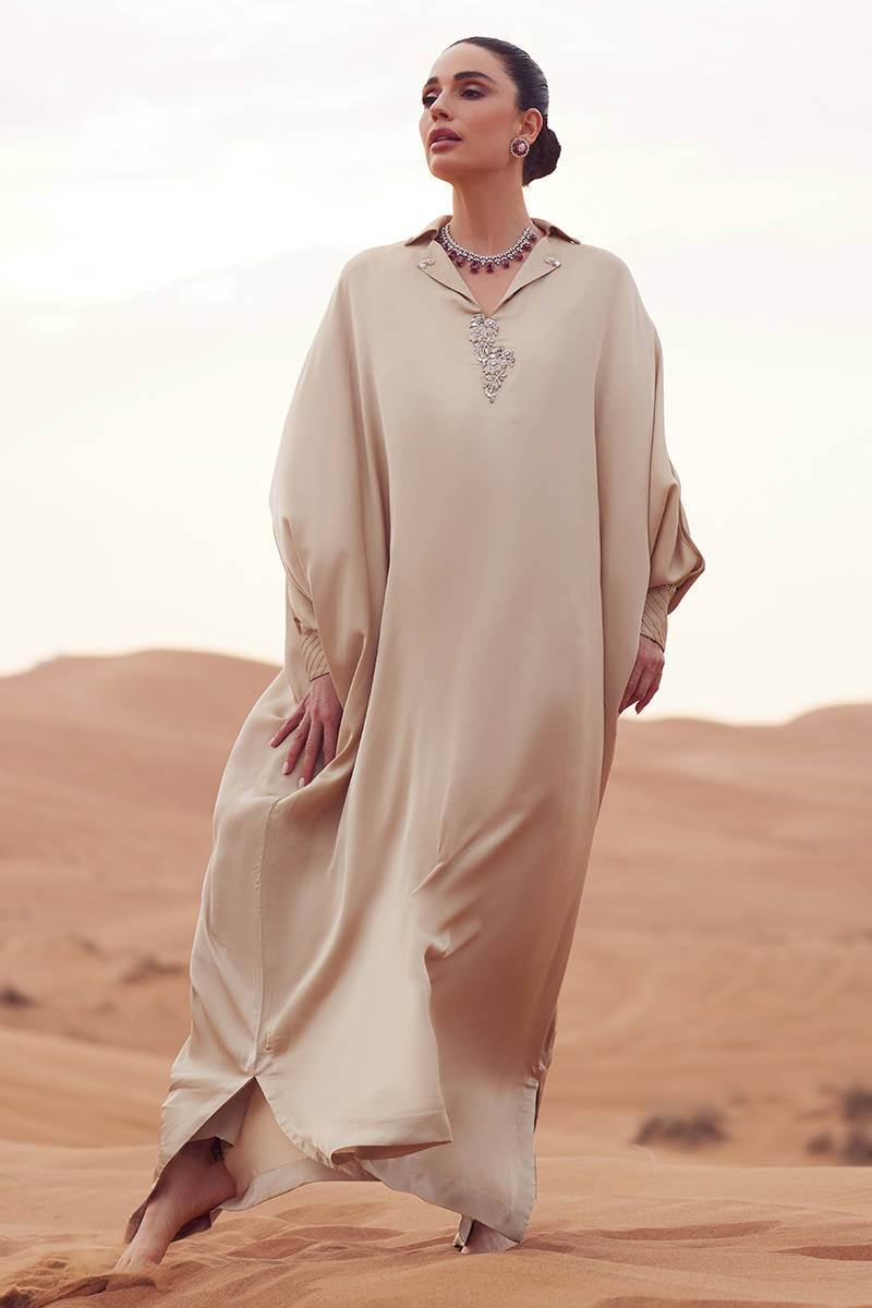 A cotton silk kaftan styled with tailored cigarette pants in matching fabric, featuring embroidered motifs adorned with delicate embellishments along the neckline. Sleeve cuffs are subtly detailed with embellishments for refined texture. Finished with a KP silk scarf accented with sequins for a polished, contemporary touch.