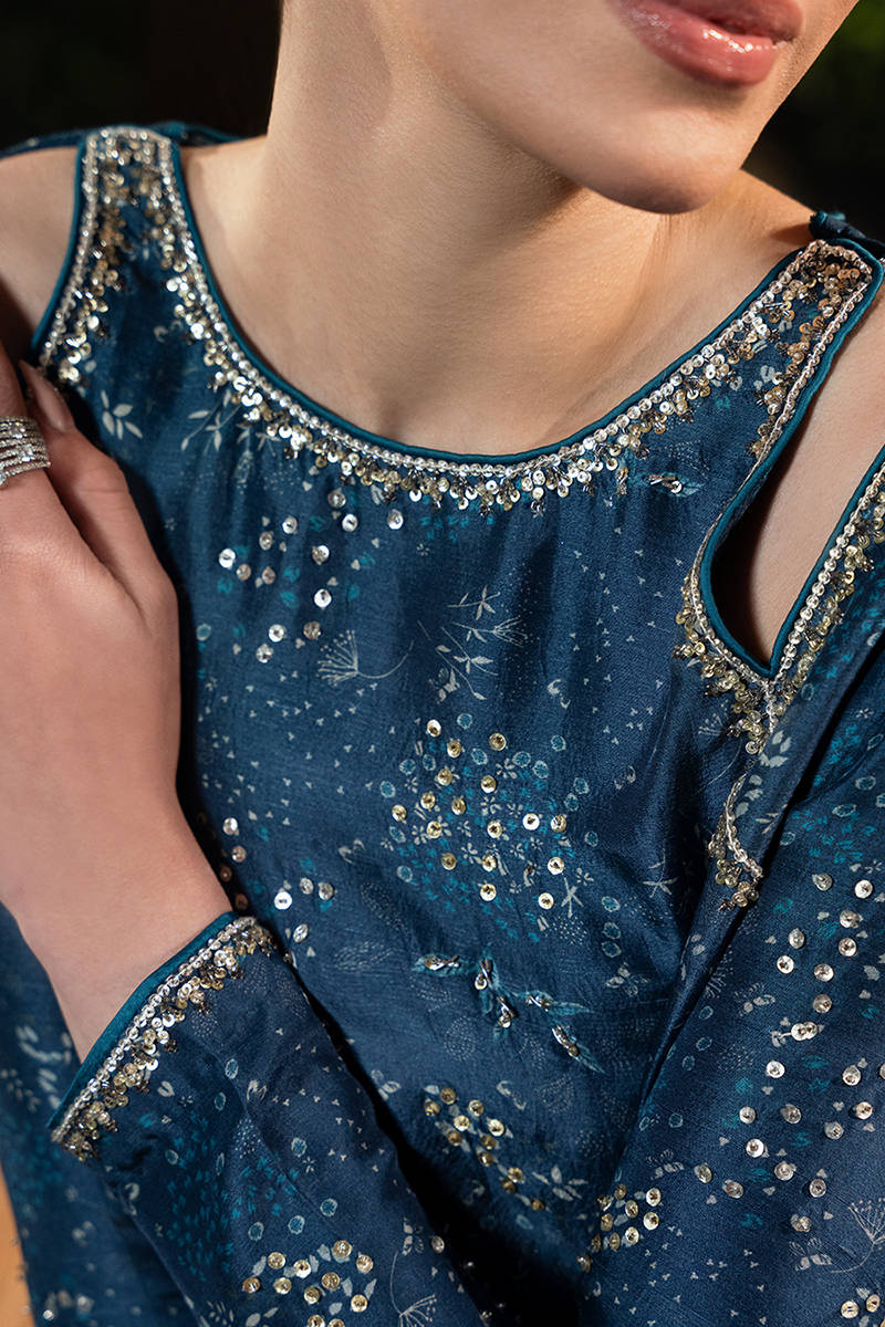 Digitally printed shirt made from Pure raw silk, giving the ensemble a refined look. The shirt features intricate prints with neckline hand embellishments that enhance its festive appeal. Paired with it is a matching digitally printed pant with gota borders, also in premium pk raw silk fabric, offering comfort while maintaining a regal silhouette. Completing the look is a delicate Kp silk dupatta, light and airy, adorned.