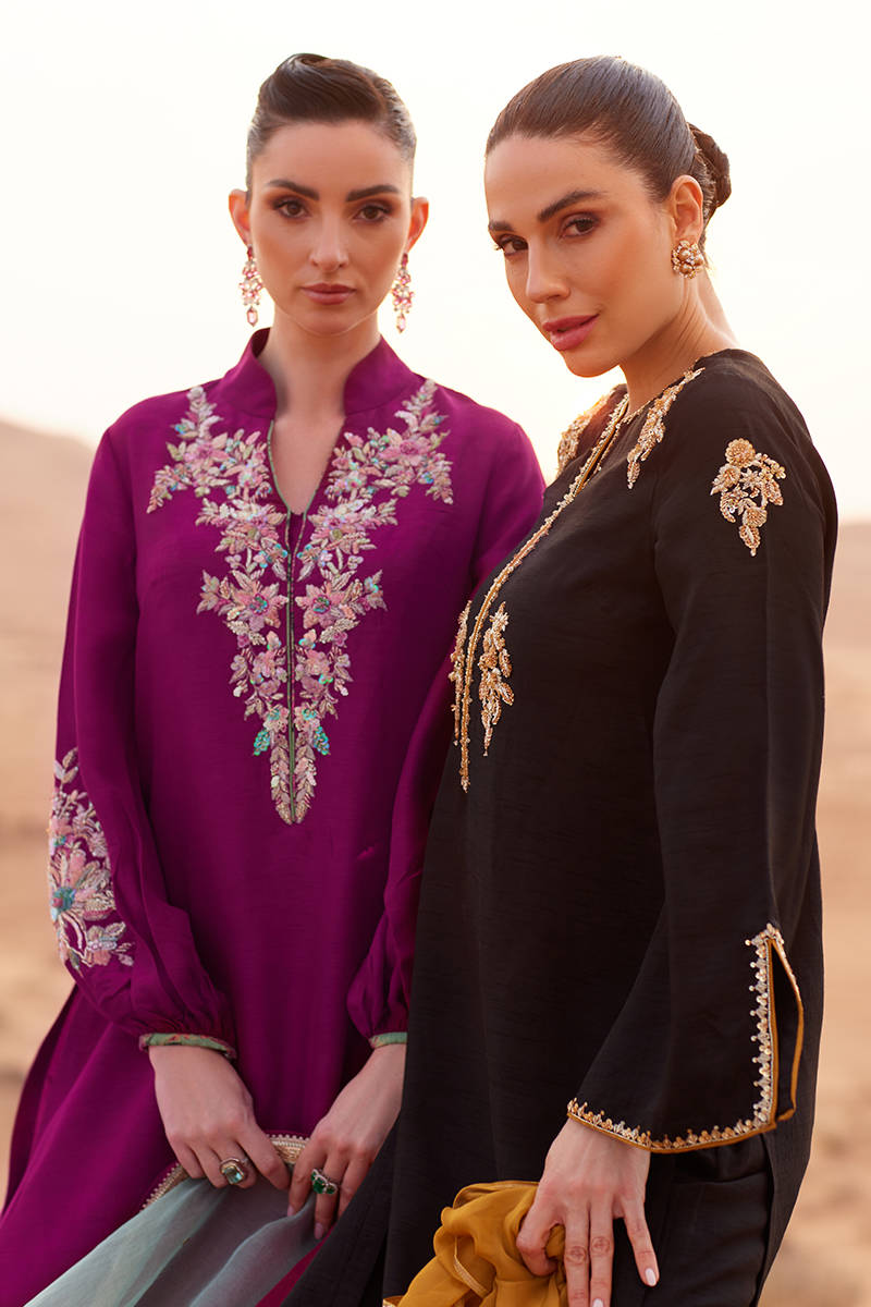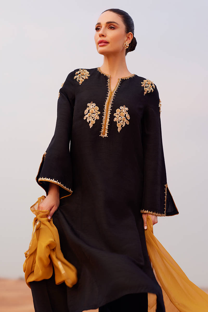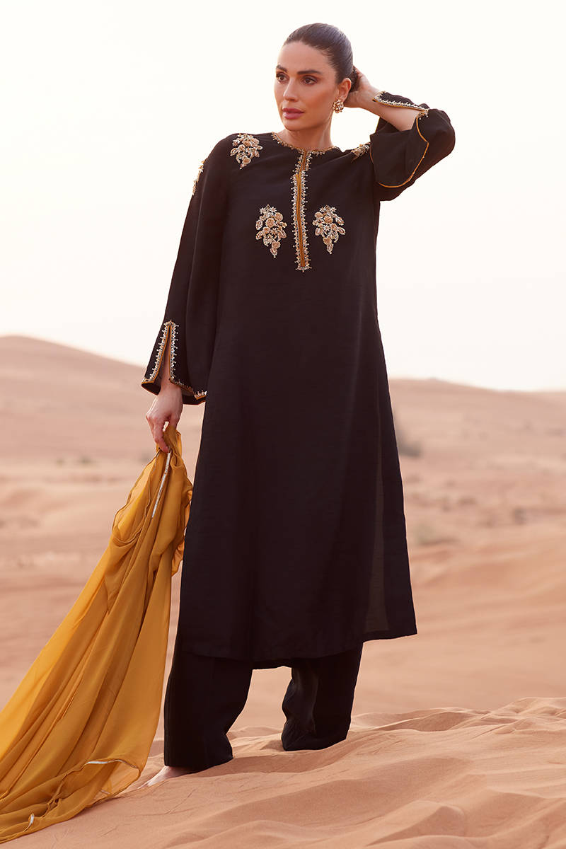 A straight, loose-fit shirt in Korean raw silk, detailed with embellished motifs on the neckline and sleeves. Styled with straight-cut Korean silk trousers for a sleek silhouette. Completed with a lightweight chiffon dupatta featuring a refined gota finish for subtle texture and elegance.