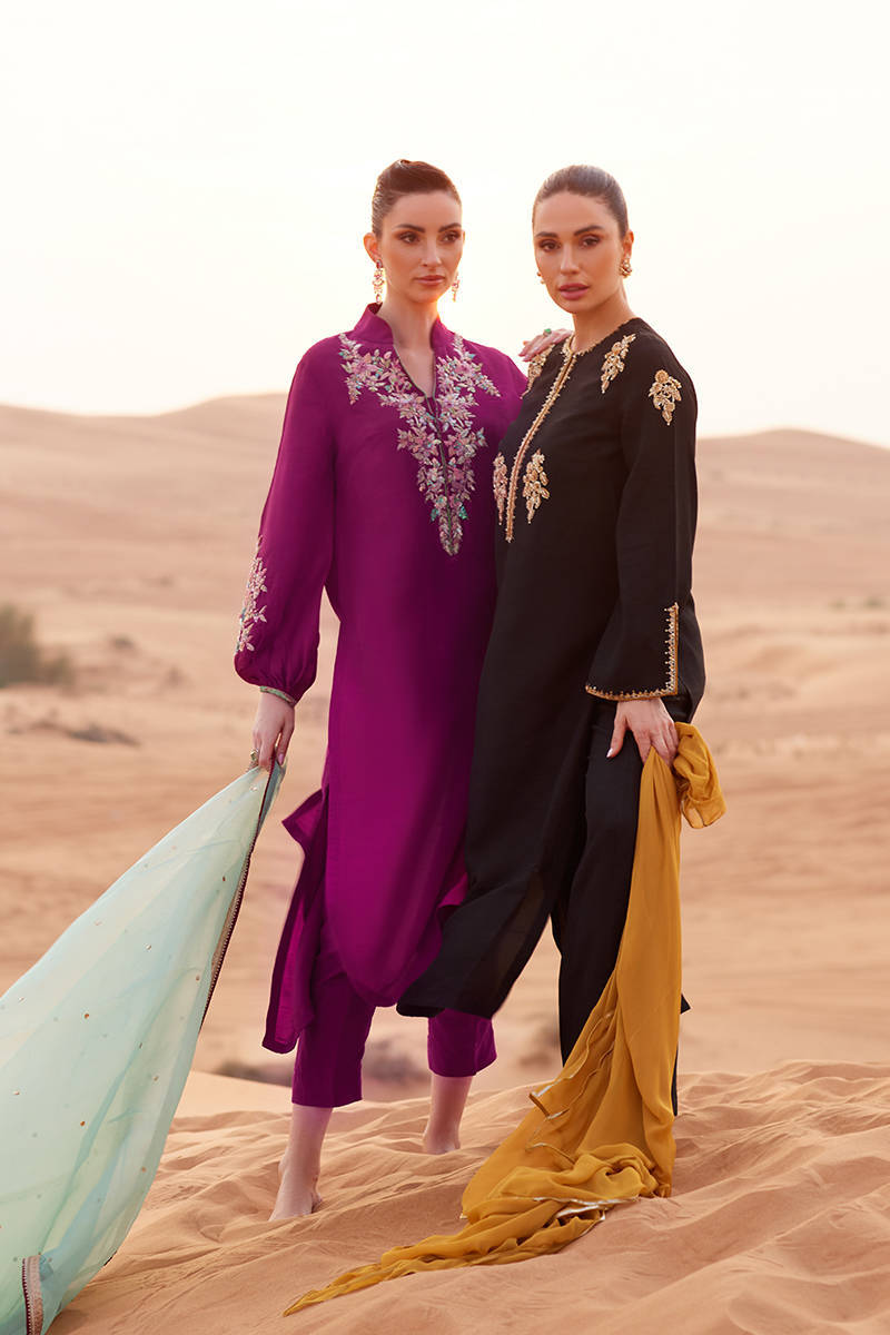 Color: Black Fabric: Shirt: Korean Silk, Pants: Korean Silk, Dupatta: Chiffon