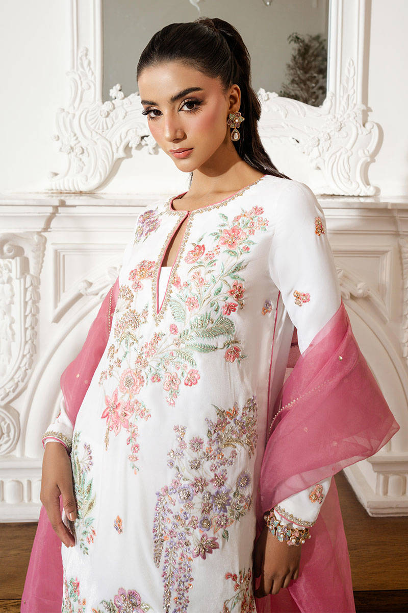 Ivory Charm is a breathtaking white short shirt adorned with stunning multicolored embroidery and intricate hand embellishments throughout. Paired with matching sharara pants and a classic salmon pink organza dupatta, this ensemble exudes timeless elegance, a perfect blend of sophistication and charm.