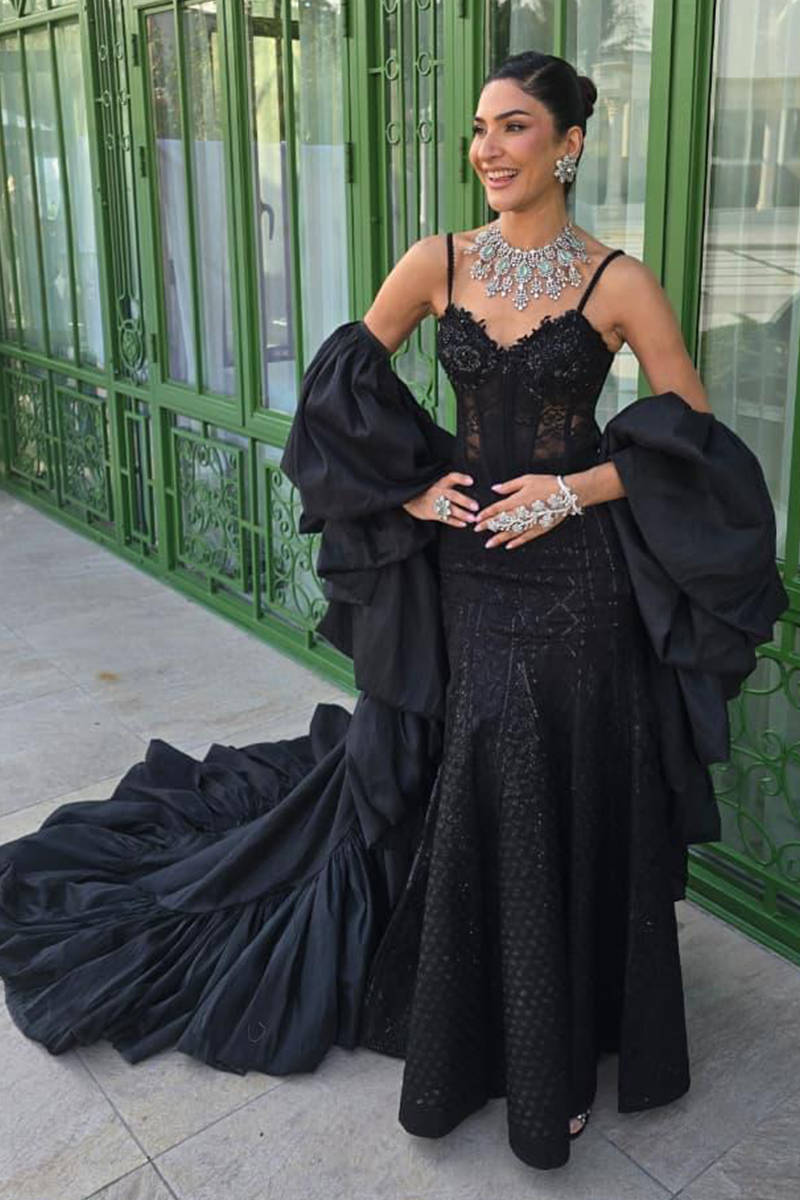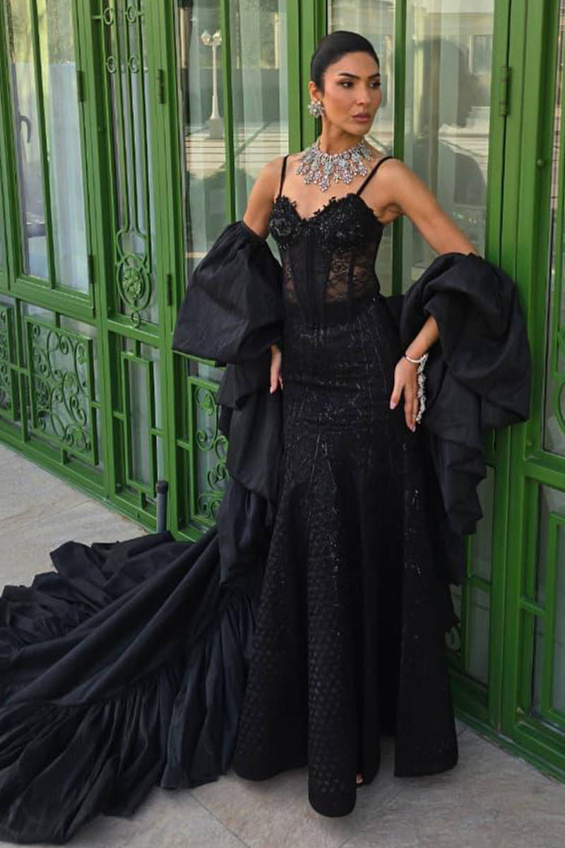 Paired with it is an enchanting black net skirt, drenched in delicate sequins that shimmer with every movement—an effortless balance of allure and sophistication.