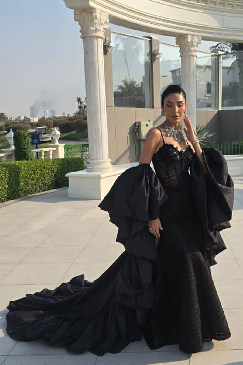 To elevate the look further, a subtle whisper of tefta detailing can be introduced, adding structure, drama, and couture richness to the complete ensemble.