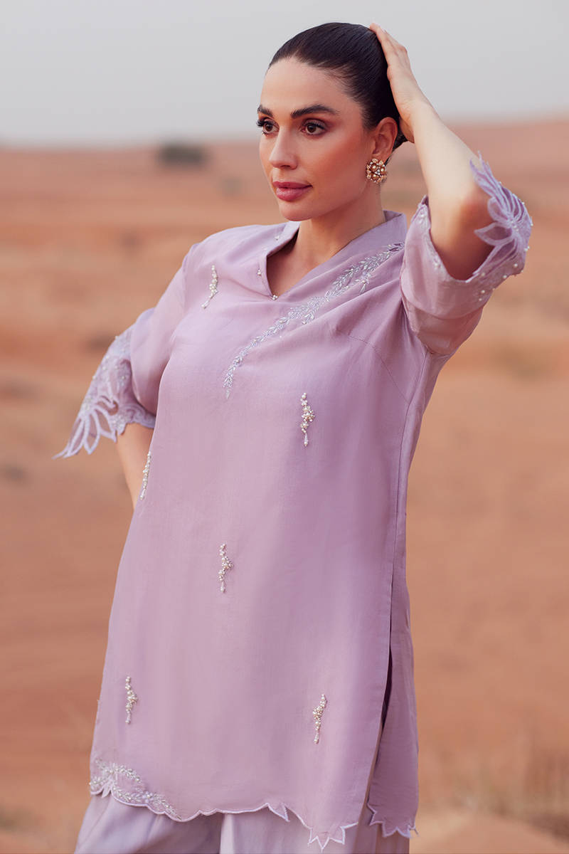 A short shirt crafted in tassel silk, featuring delicate embroidery and hand embellishments throughout in a soft lavender hue. Paired with cotton silk Bambi pants for a relaxed yet refined silhouette. Completed with a gradient-dyed scarf, adding fluid movement and tonal depth to the ensemble.