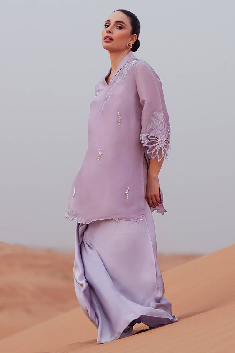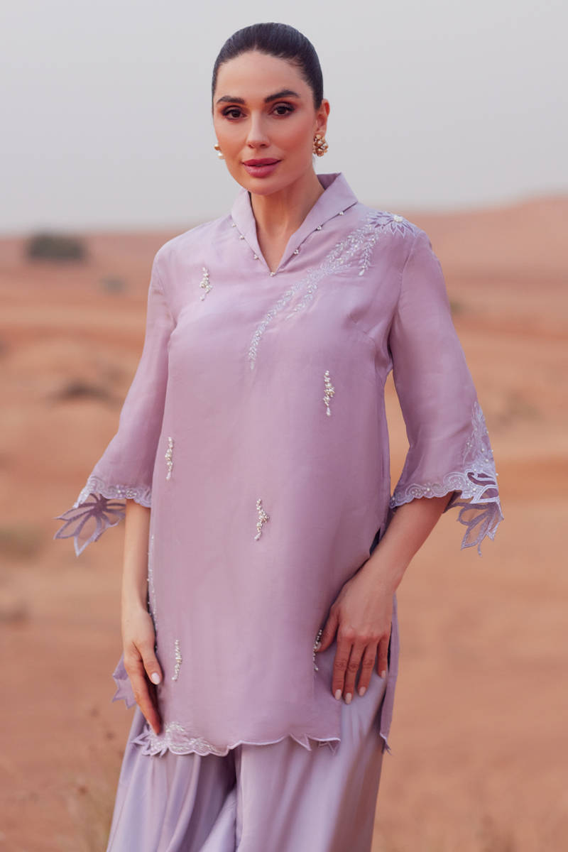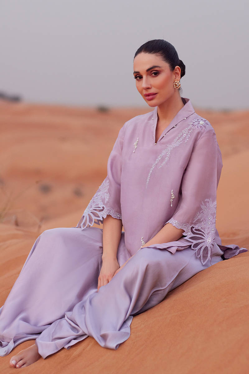 A short shirt crafted in tassel silk, featuring delicate embroidery and hand embellishments throughout in a soft lavender hue. Paired with cotton silk Bambi pants for a relaxed yet refined silhouette. Completed with a gradient-dyed scarf, adding fluid movement and tonal depth to the ensemble.