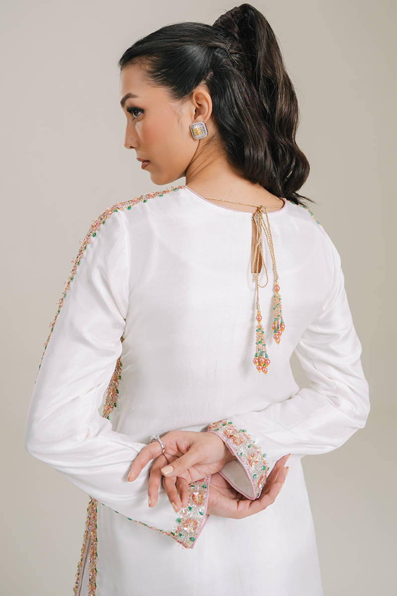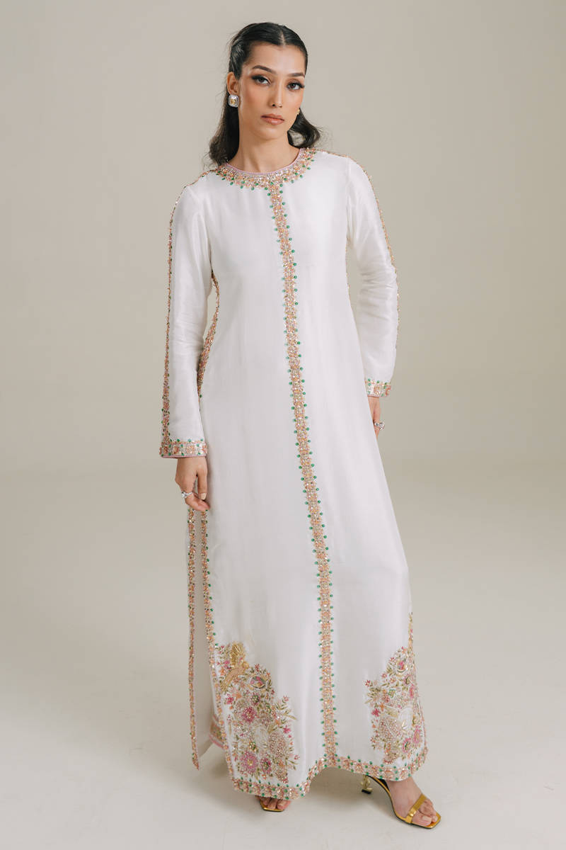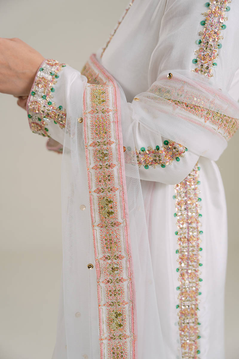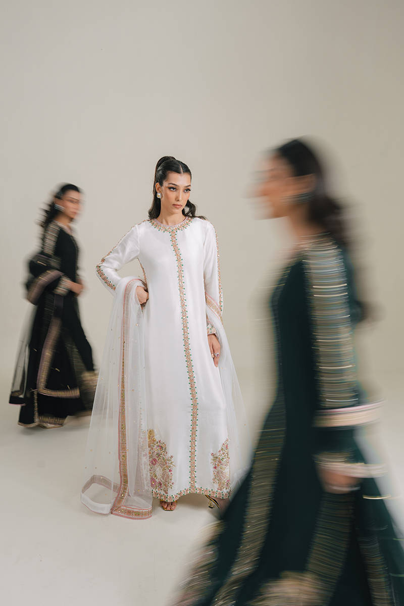 An eye-catching stunning ebony floor-length heavily embellished shirt with fitted sleeves. Paired with the same colored flared pants and stunning net dupatta with sprayed sequences all over.