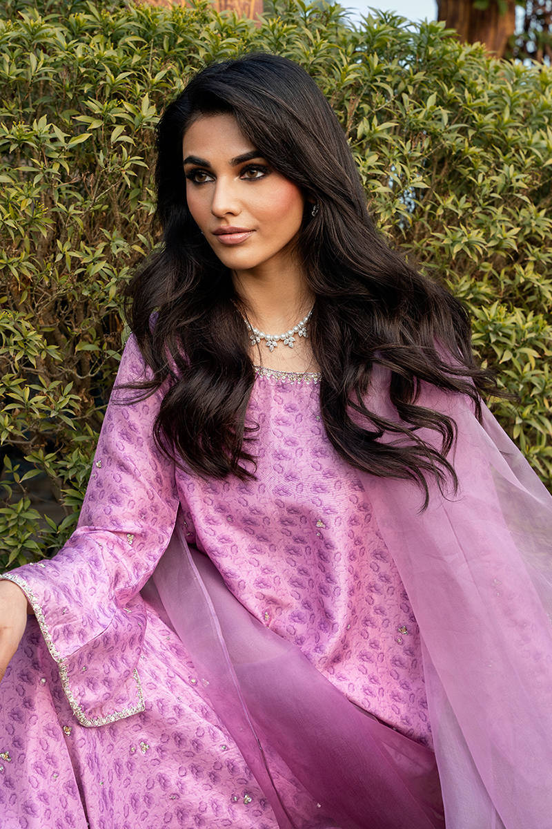 Digitally printed Shirt manufactured from pure raw silk, adorned with a delicate print. The shirt is further enhanced with subtle hand embellishments, adding a touch of artisanal detail while maintaining a soft, graceful aesthetic. It is paired with Korean raw silk pants, designed to complement the look with their structured silhouette. Completing the ensemble is an Ombre dupatta in Organza, draped effortlessly to add lightness and movement, beautifully balancing the richness of the silk textures.