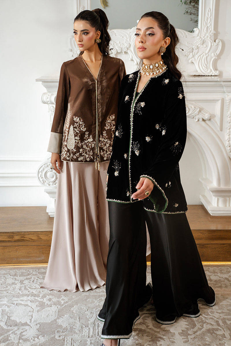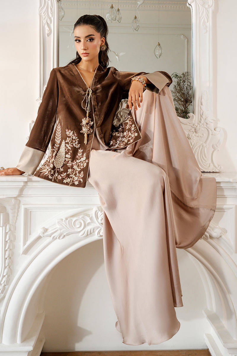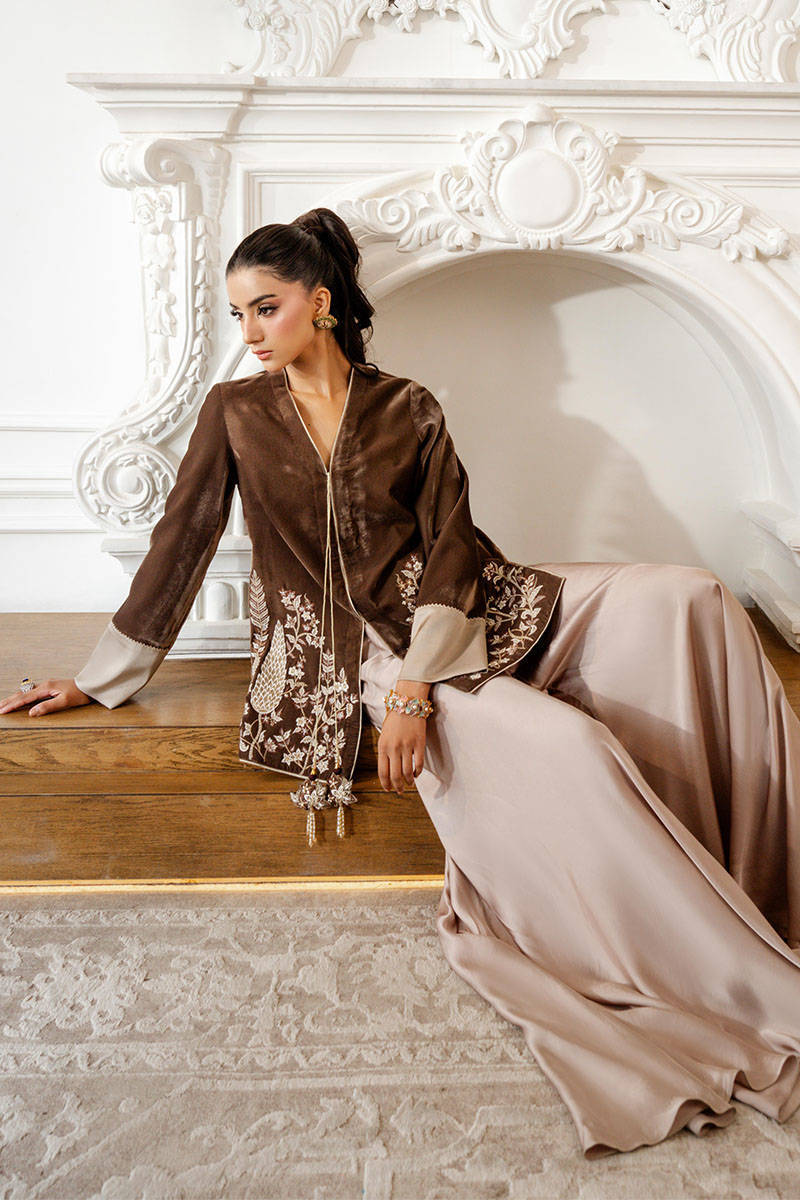 Misty Smoke is a sleek jacket in a stunning mouse-grey hue, featuring intricate embroidery and delicate tassel detailing. The contrasting accents on the sleeves add a touch of refinement, while the satin flared pants bring a contemporary fusion edge, making this ensemble effortlessly versatile and perfect for any occasion.