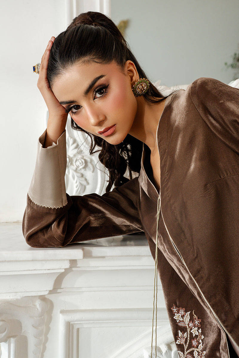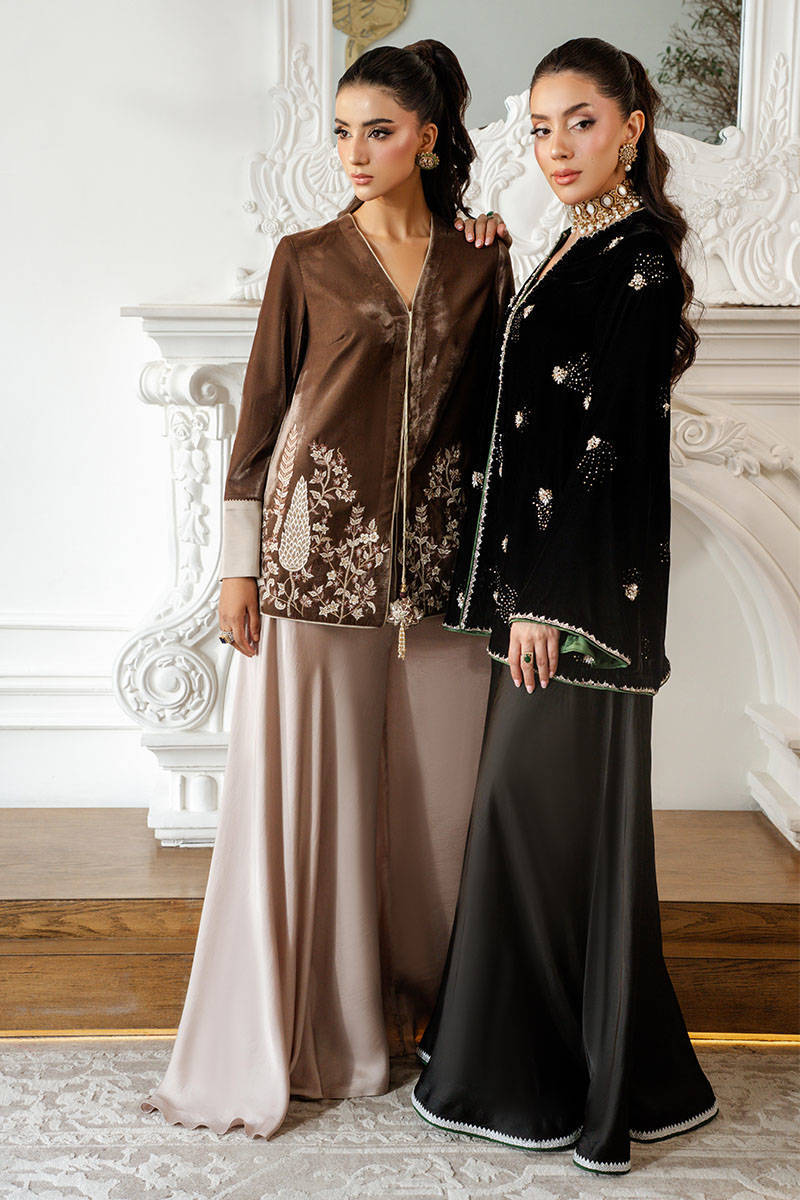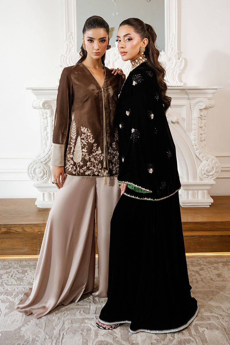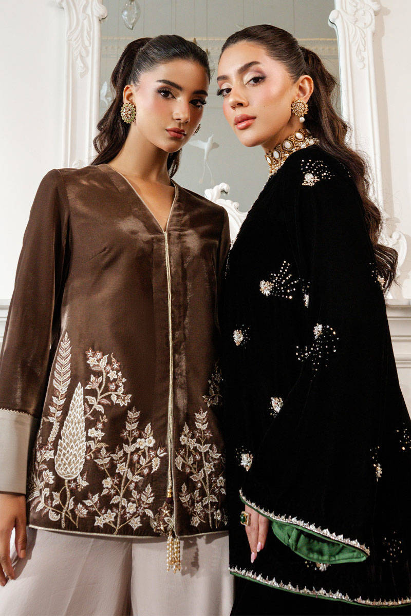 Misty Smoke is a sleek jacket in a stunning mouse-grey hue, featuring intricate embroidery and delicate tassel detailing. The contrasting accents on the sleeves add a touch of refinement, while the satin flared pants bring a contemporary fusion edge, making this ensemble effortlessly versatile and perfect for any occasion.