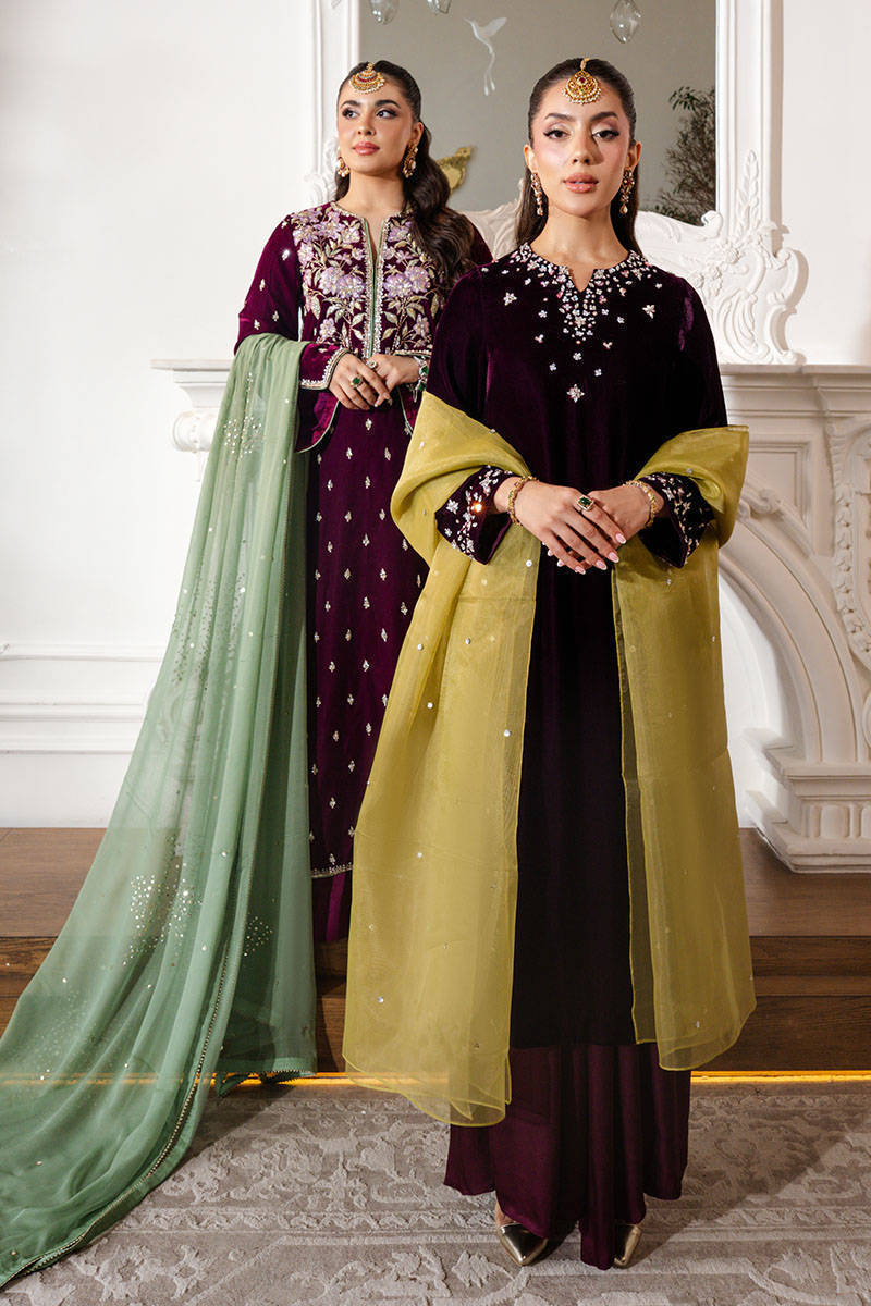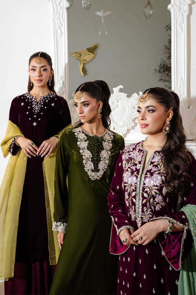 Muted Rose is an exquisitely crafted plum velvet shirt featuring a delicately hand-embellished neckline adorned with colored sequins. The refined craftsmanship extends to the sleeves, adding just the right touch of festive allure. Paired with matching satin pants and a contrasting olive green organza dupatta with a delicate sequin spray, this ensemble strikes the perfect balance between elegance and celebration, ideal for the upcoming festive season.