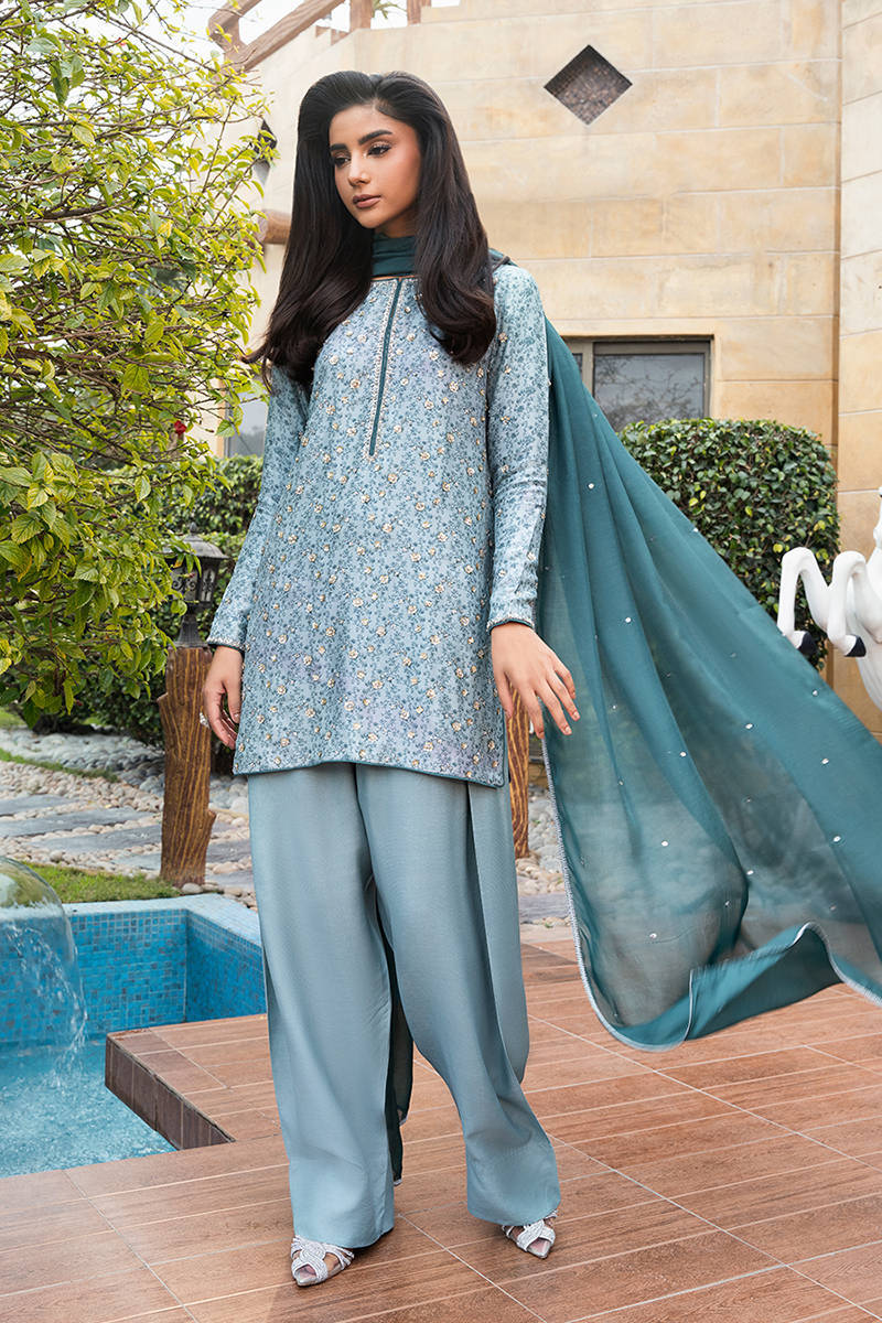 Digitally printed short shirt crafted from PURE raw silk, adorned with a delicate all-over print. The shirt is further enhanced with subtle hand embellishments. It is paired with farshi shalwar in PK raw silk, designed to complement the look with its structured silhouette. Completing the ensemble is a flowing KP SILK dupatta, draped effortlessly to add lightness and movement, beautifully balancing the richness of the silk textures.