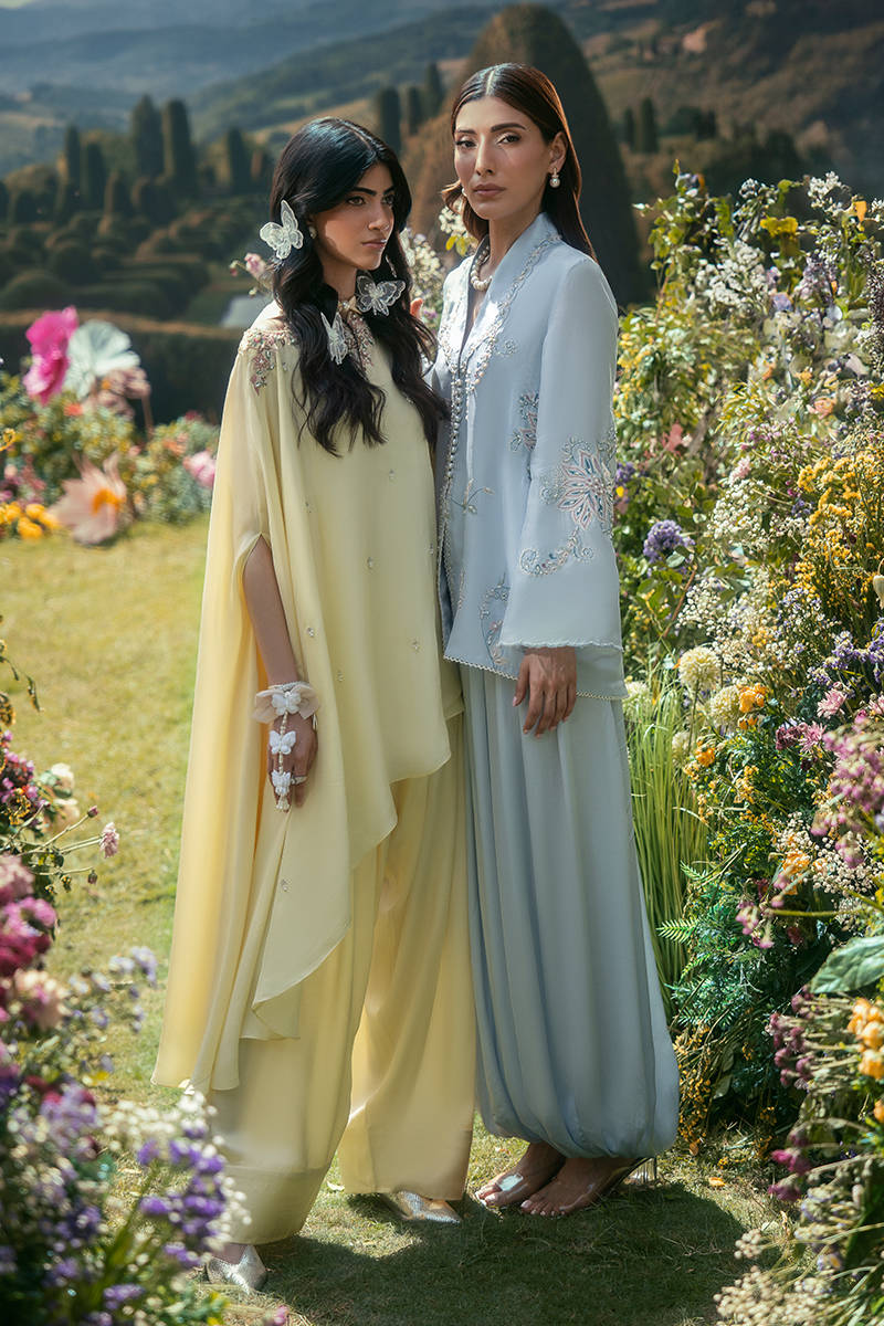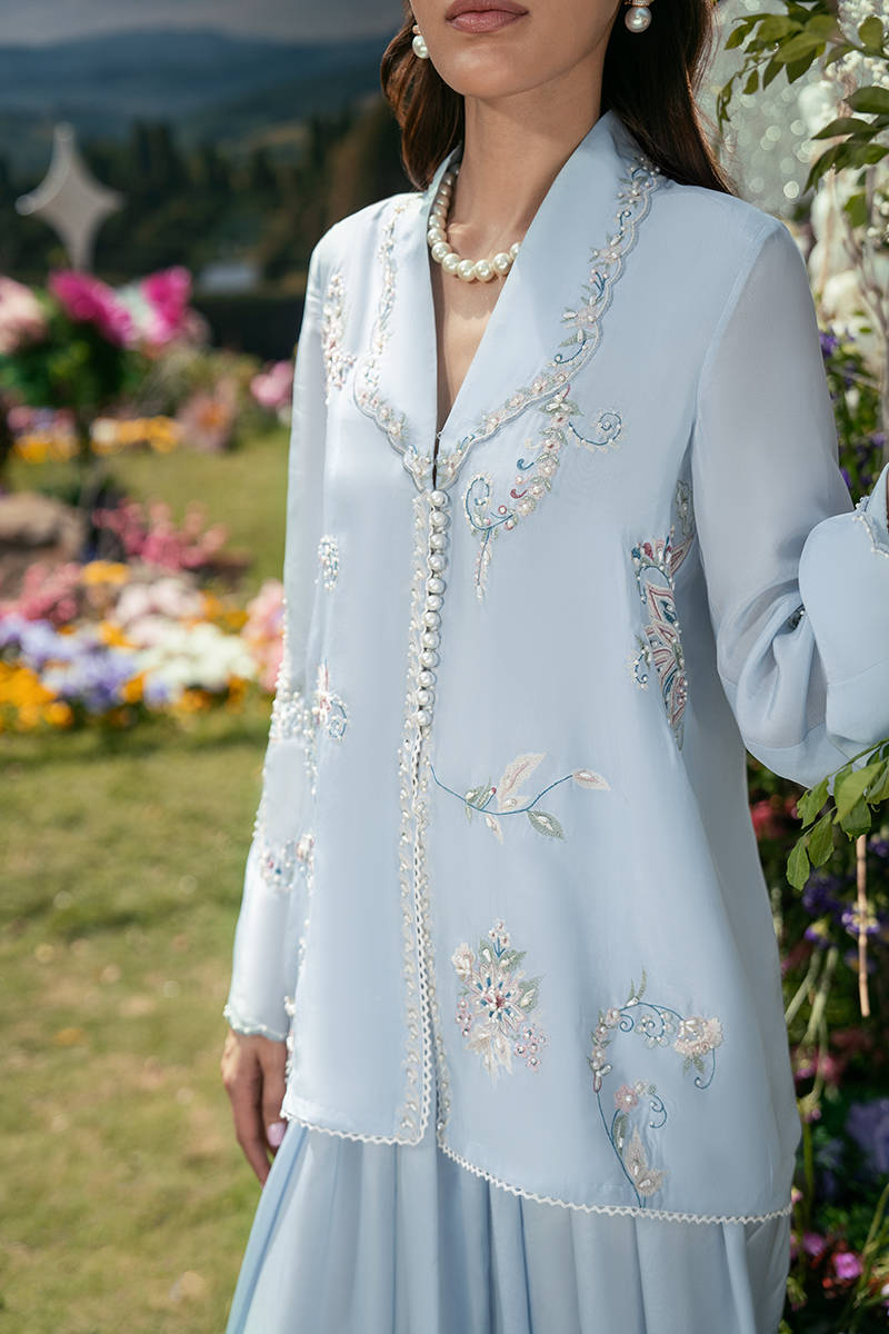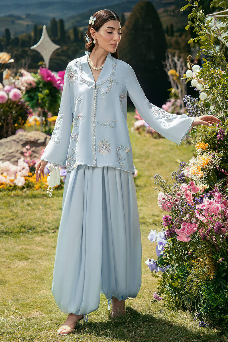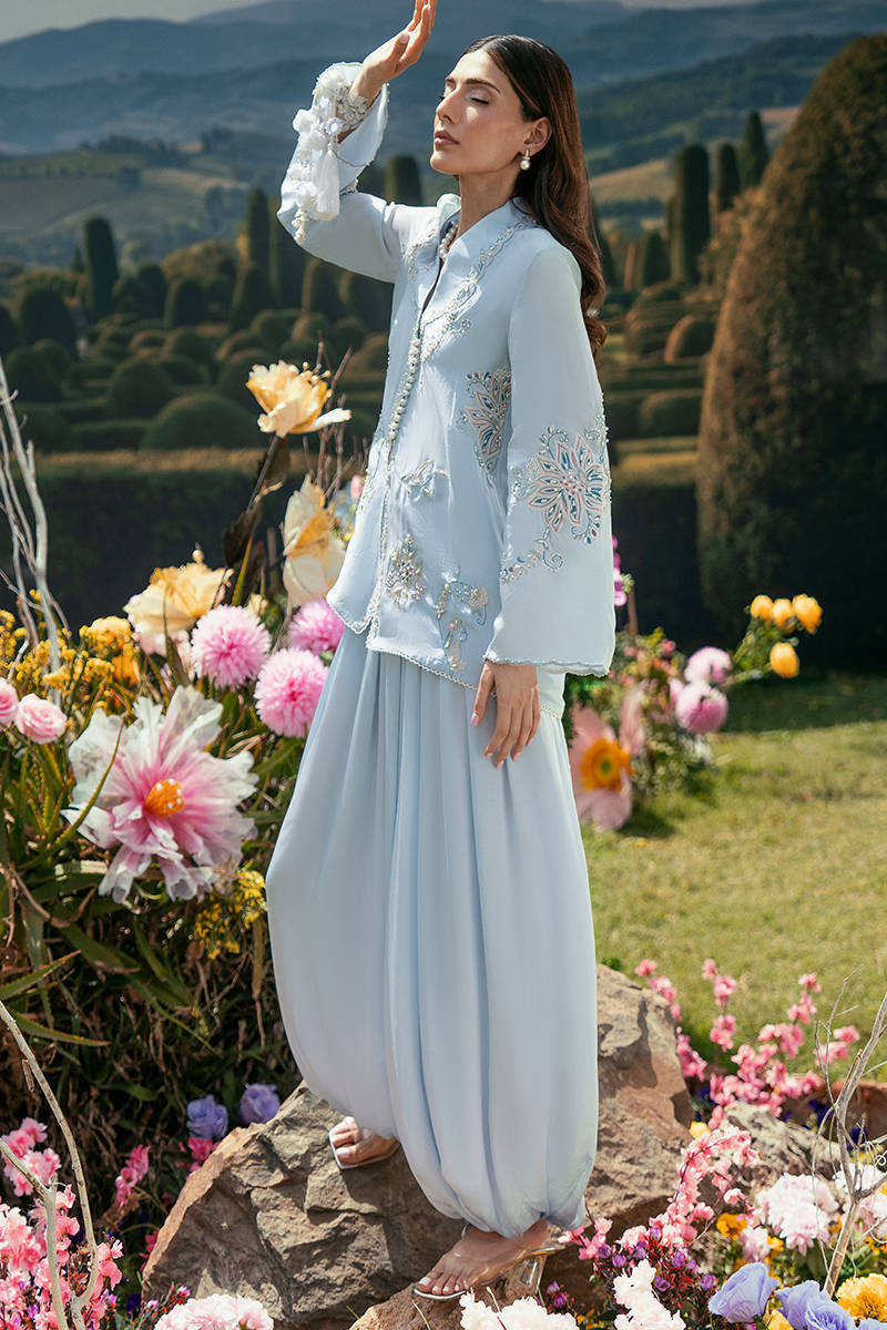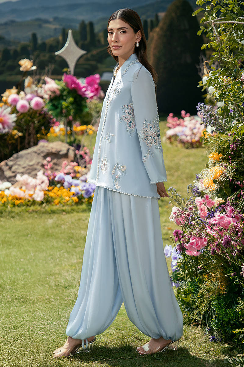 In a rich blue tone, this front-open shirt is detailed with pearl buttons running halfway down the front, paired with subtle all-over hand embellishments that add a soft, refined shimmer. It has a clean, slightly deep V shape formed by the embellished placket edges, giving it an elegant, elongated look. Styled with modern balloon pants, the ensemble strikes a balance between structured elegance and contemporary ease, creating a look that feels polished yet effortlessly chic.