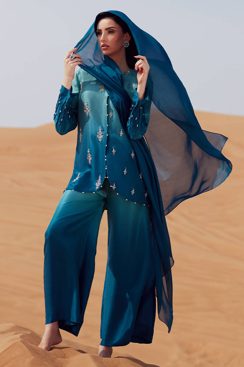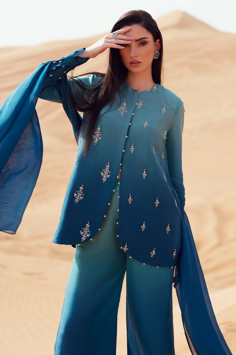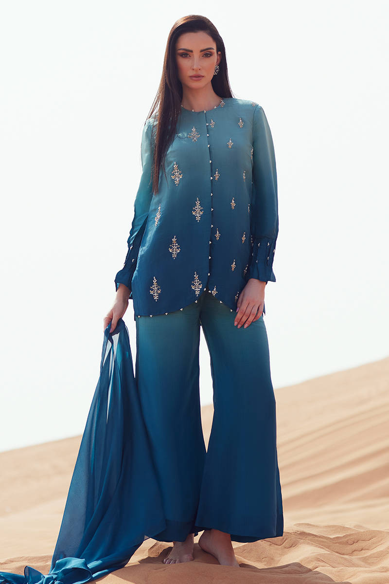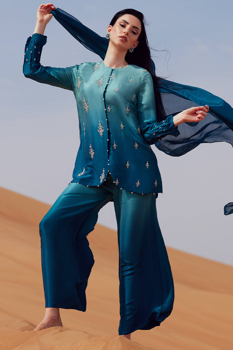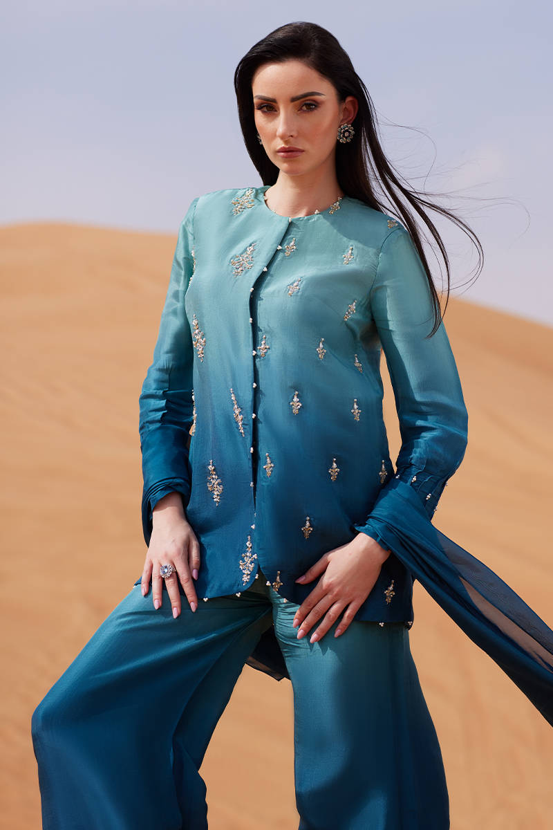 A contemporary layered ensemble featuring a shirt paired with an open jacket crafted in tassel silk, finished in a striking gradient of blues. Styled with a fluid wide-leg silk trouser, gradient dyed for a seamless silhouette. The look is completed with a kp silk scarf, while tulle-embroidered outlines and refined embellishments add depth, texture, and modern elegance