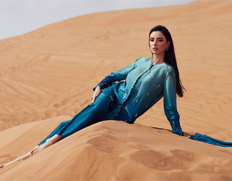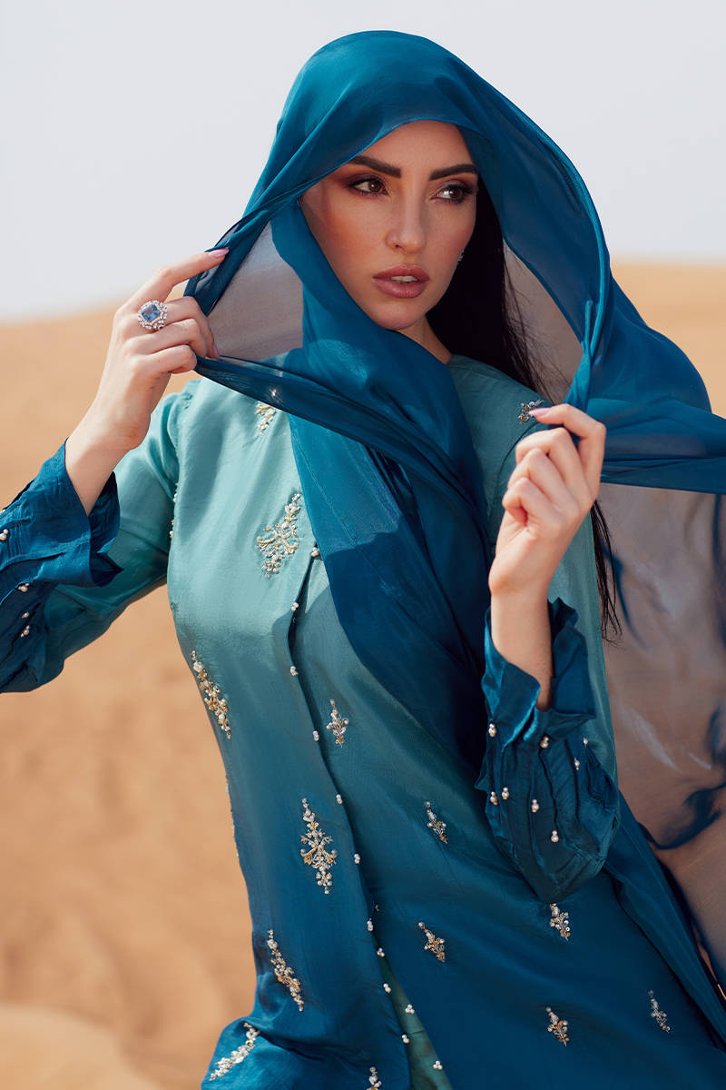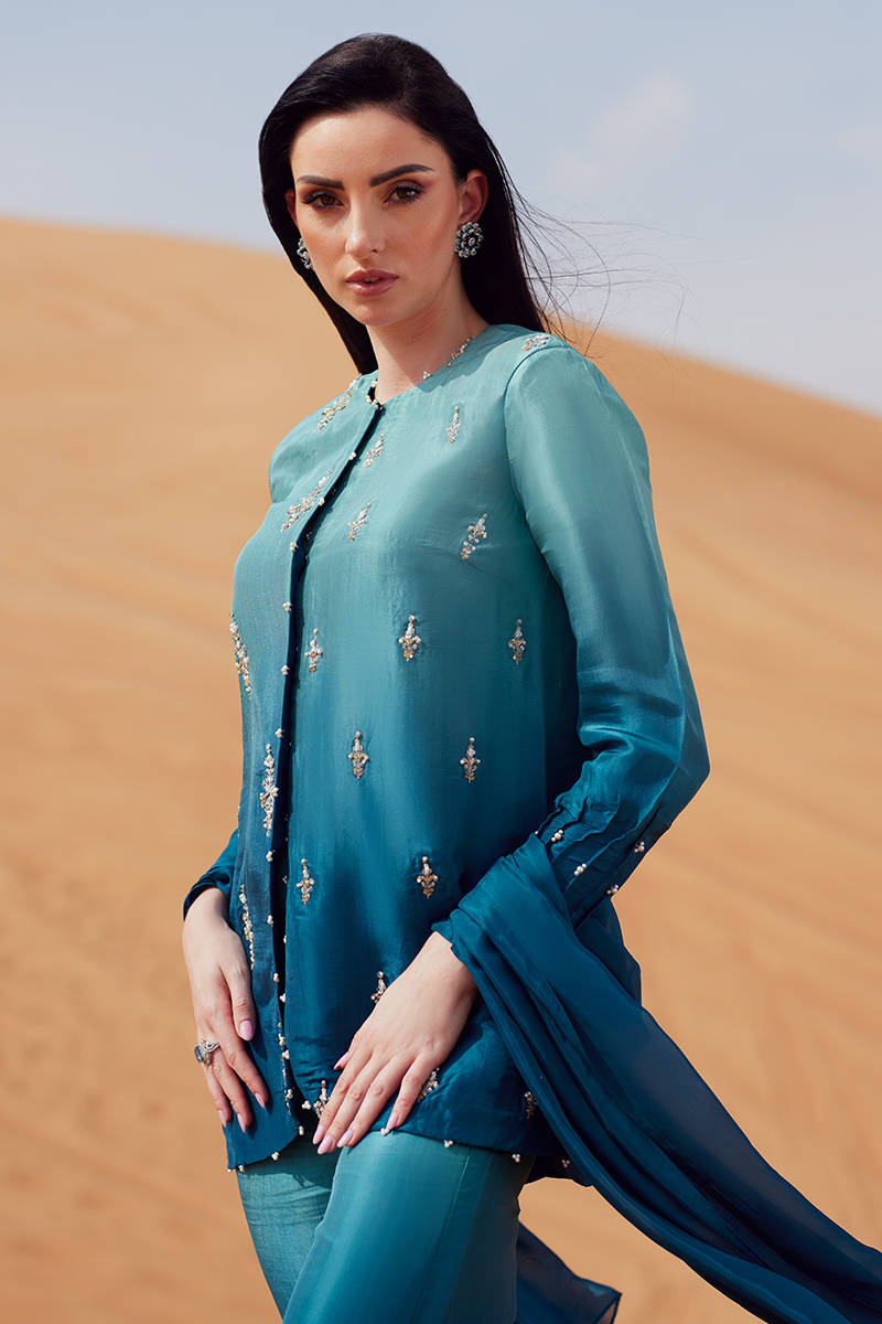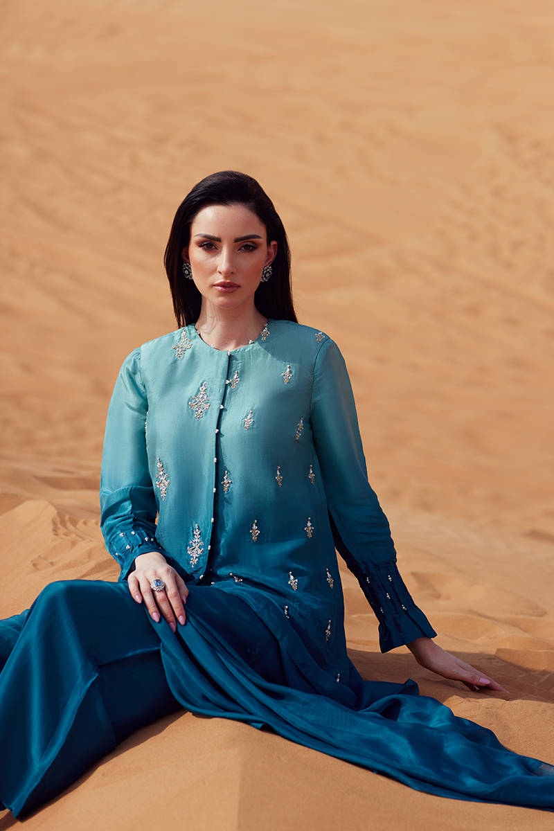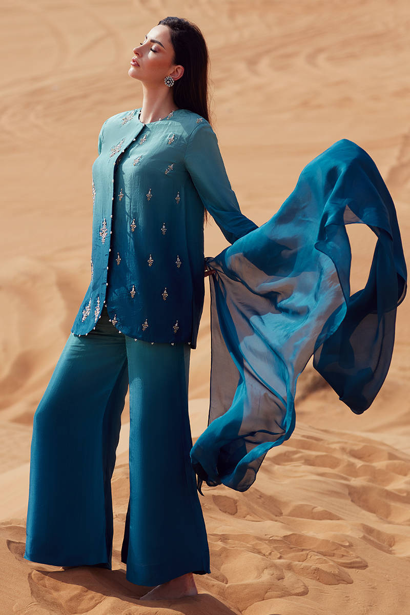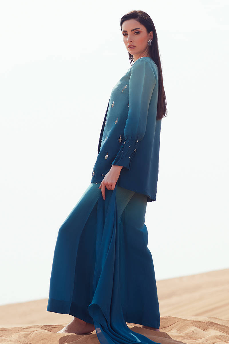 A contemporary layered ensemble featuring a shirt paired with an open jacket crafted in tassel silk, finished in a striking gradient of blues. Styled with a fluid wide-leg silk trouser, gradient dyed for a seamless silhouette. The look is completed with a kp silk scarf, while tulle-embroidered outlines and refined embellishments add depth, texture, and modern elegance
