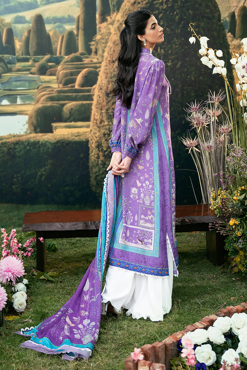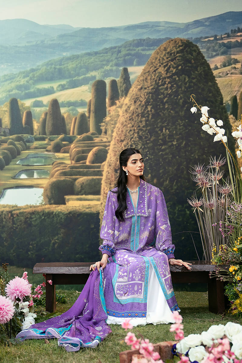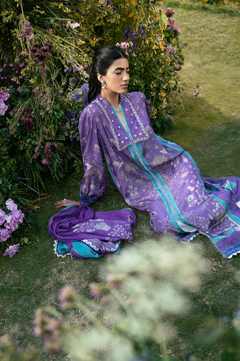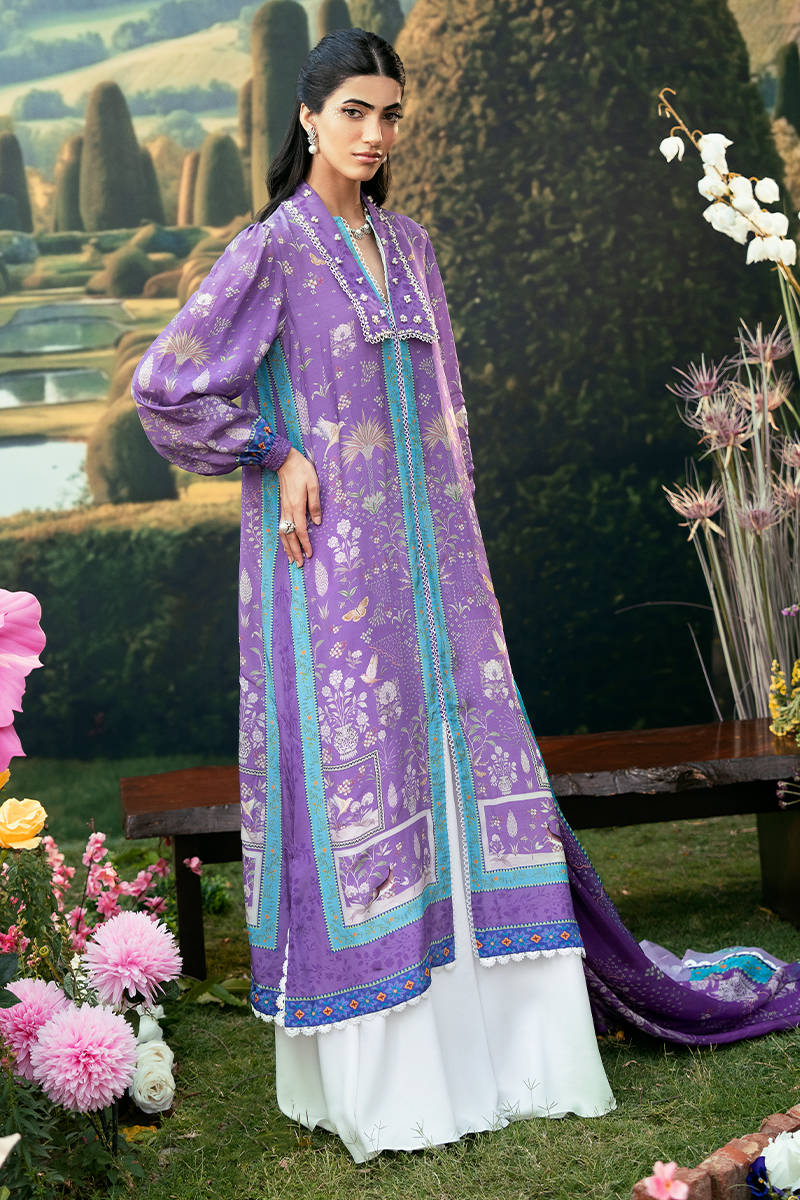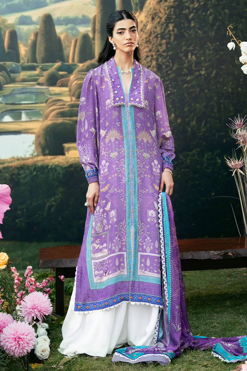 A front-open printed shirt in a dreamy lavender hue, beautifully adorned with intricate hand embellishments and the signature ZS collar detailing that reflects refined craftsmanship. The statement puffy sleeves add a modern, fashion-forward touch, enhancing the overall silhouette with soft volume. Paired with fluid Bambi pants for effortless elegance and complemented by a printed silk dupatta featuring delicate floral elements, this ensemble creates the signature ZS dreamy effect—perfect for elevated festive moments and statement occasions.