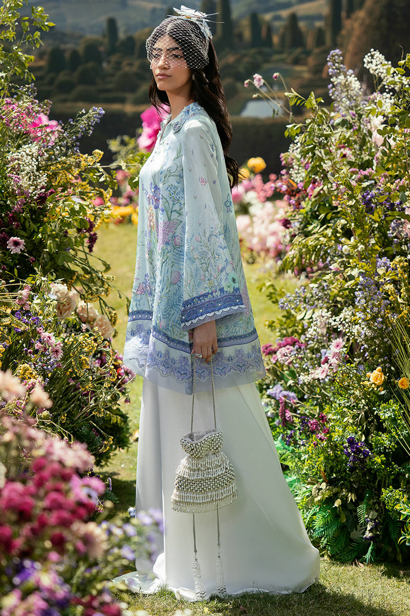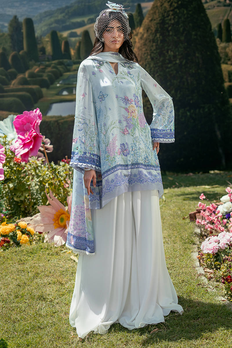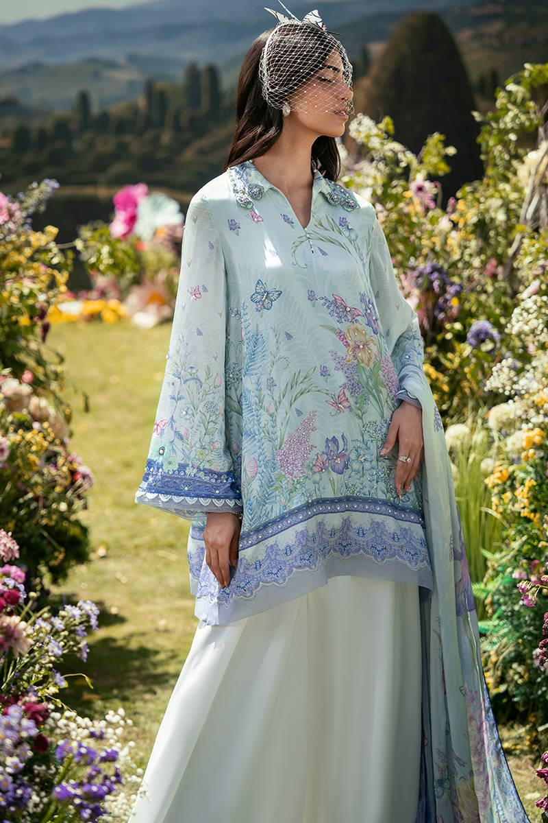 In a vibrant blue print, this short shirt features a classic collared neckline that adds a structured, timeless touch to the silhouette. Paired with Bambi pants, the look balances comfort with modern elegance, while the coordinated dupatta completes the ensemble with a soft, flowing finish. The overall outfit feels fresh, easy, and effortlessly put together.